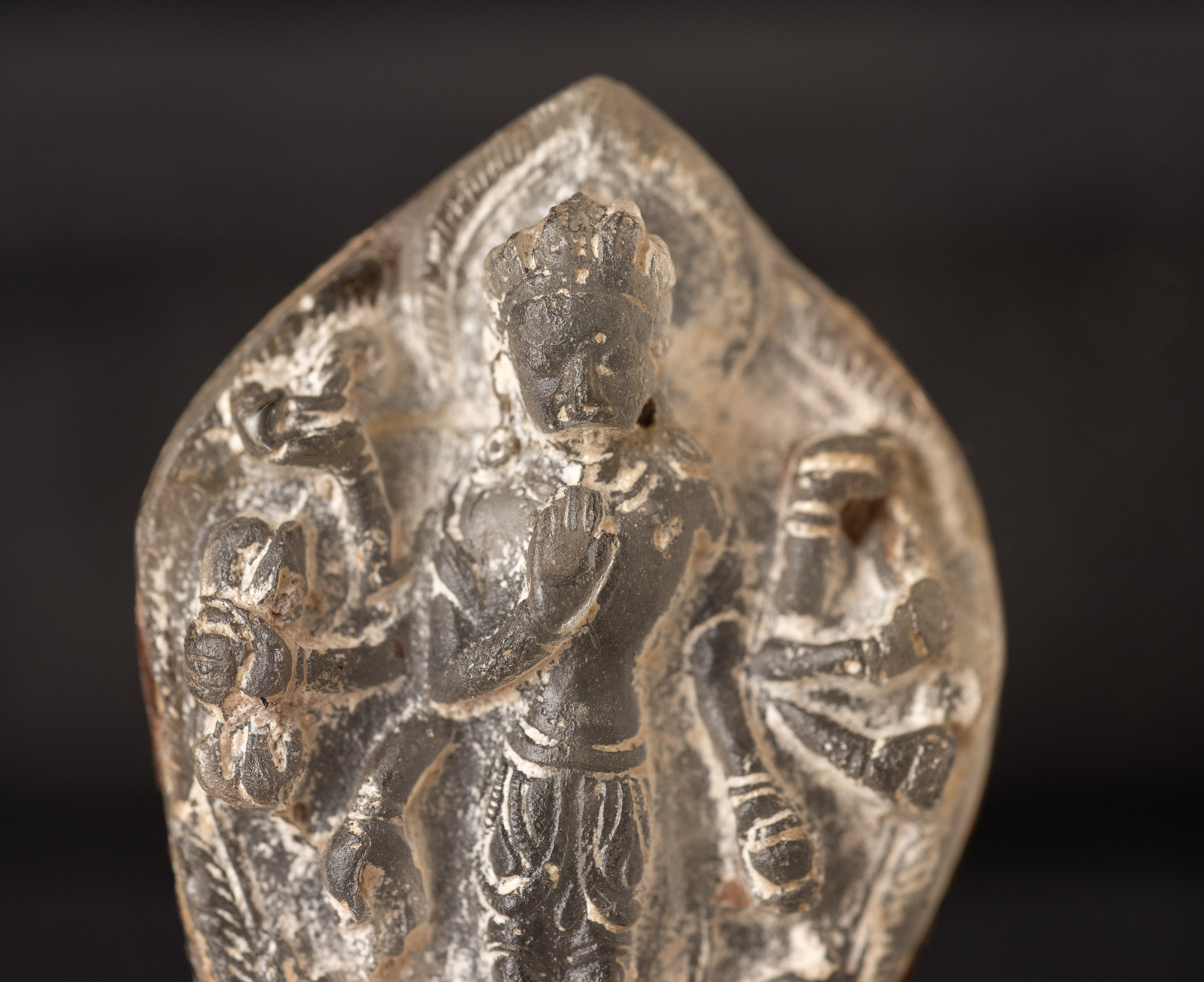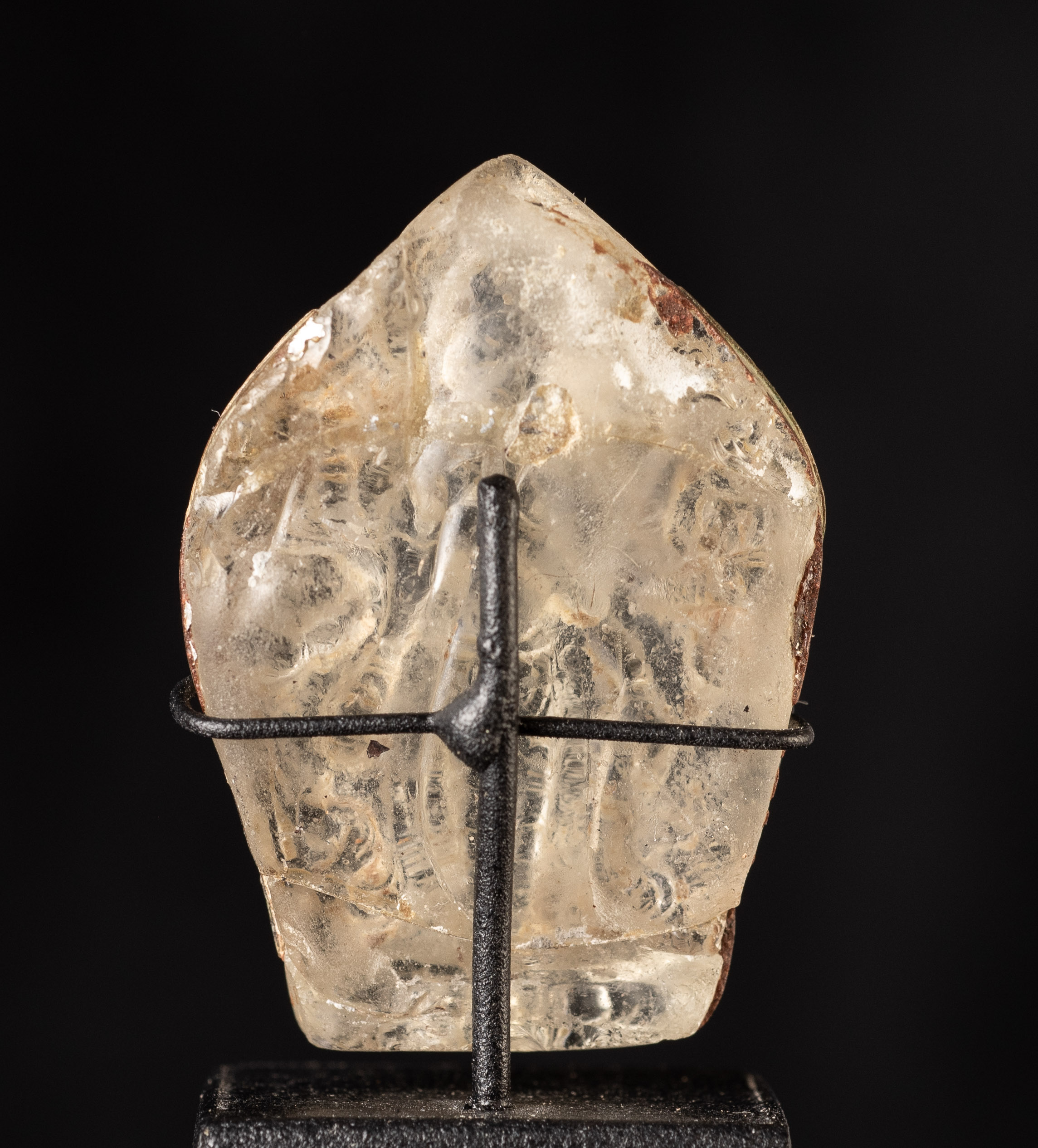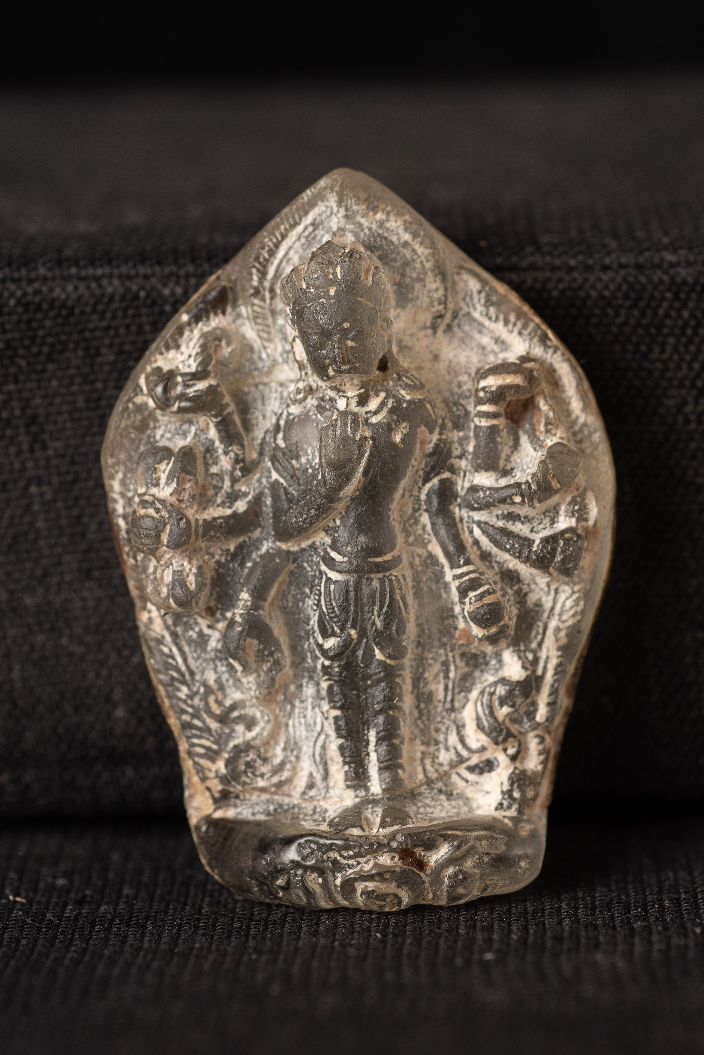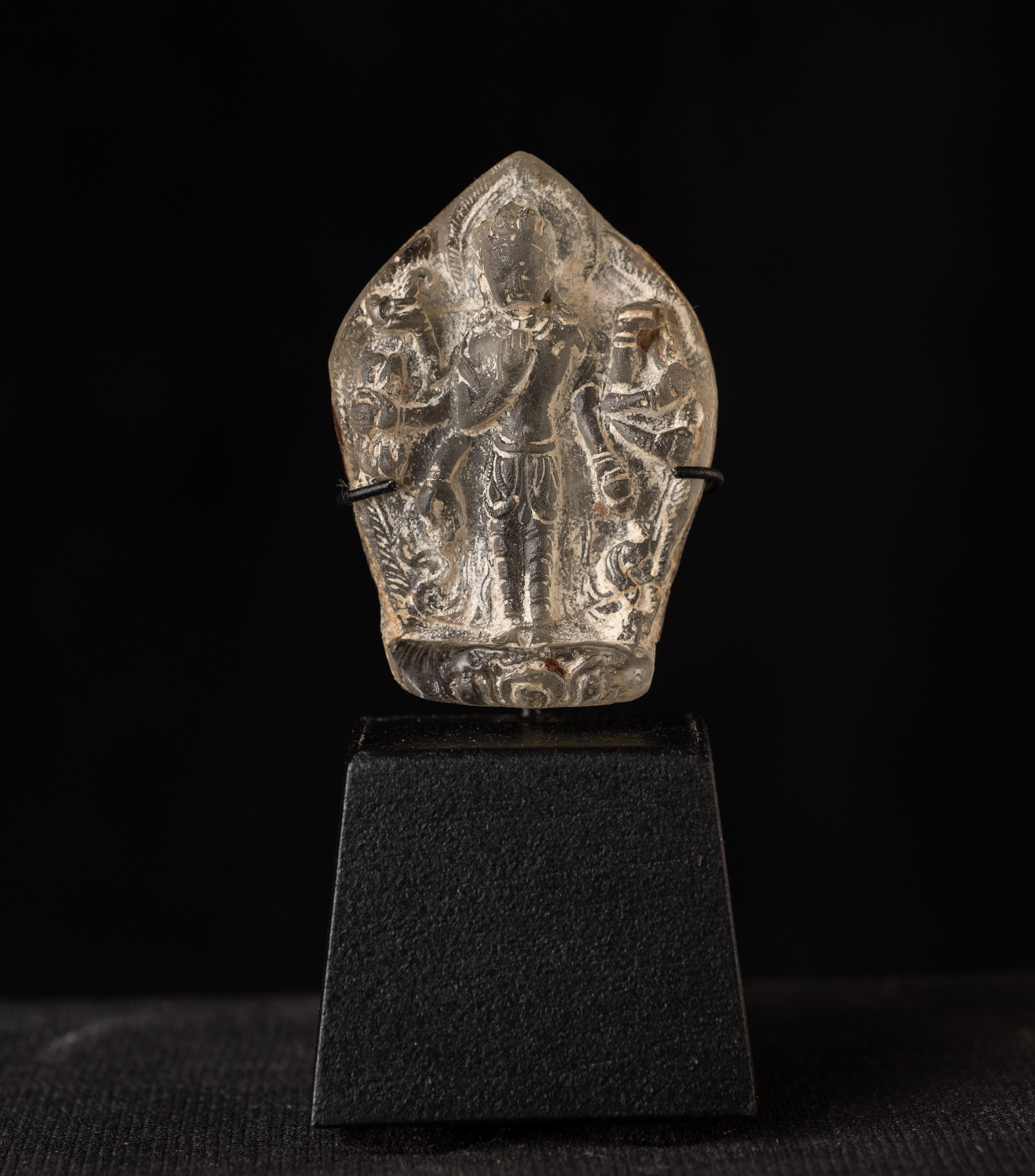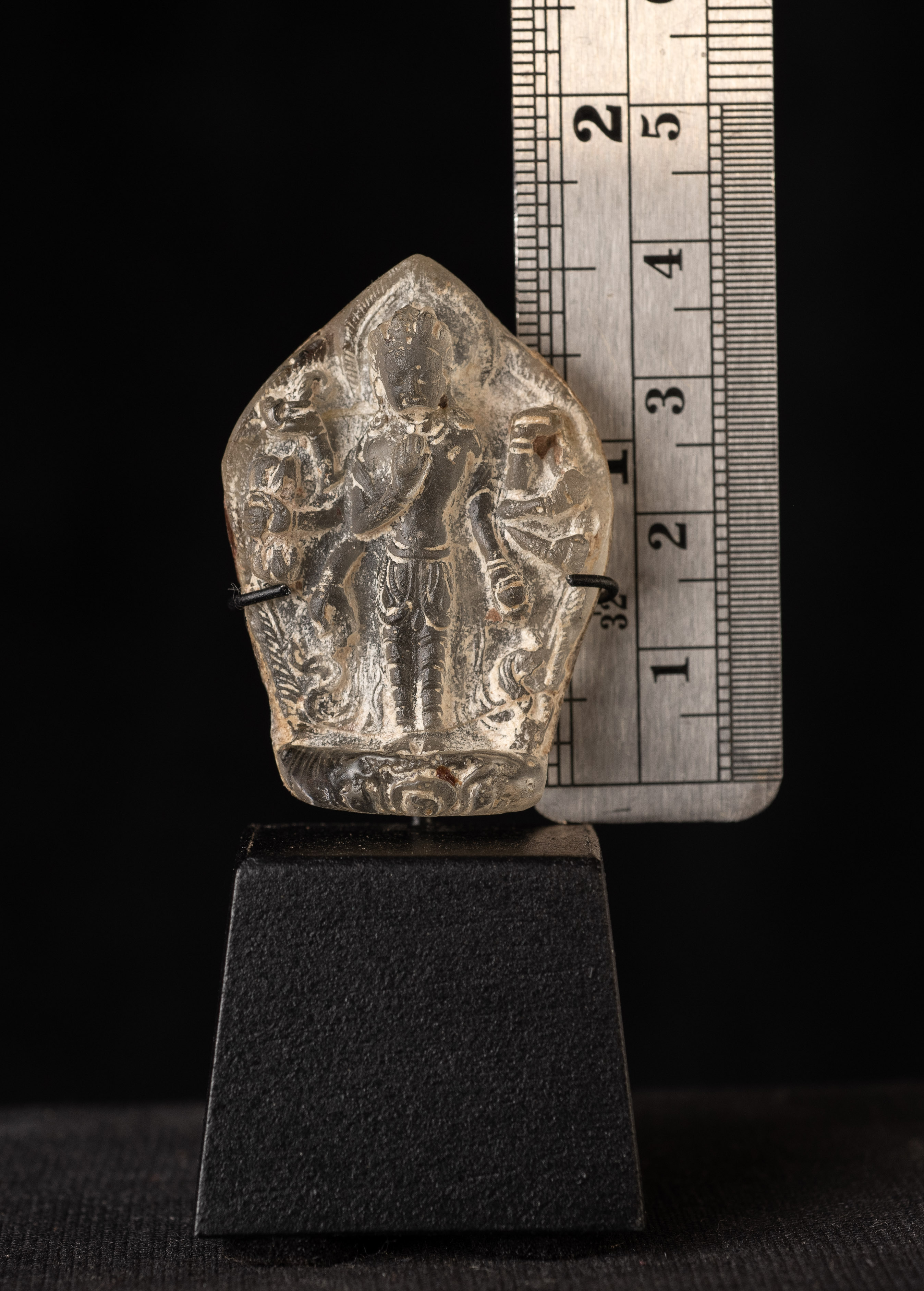 Very rare 10/11thC Cambodian Glass Multi-Arm Tantric Deity. Has a custom stand. I've seen only three of these in 20+ years. (1.5"H x 1"W x .375"D)-25g. / Base: 1"H x 1.25"W)