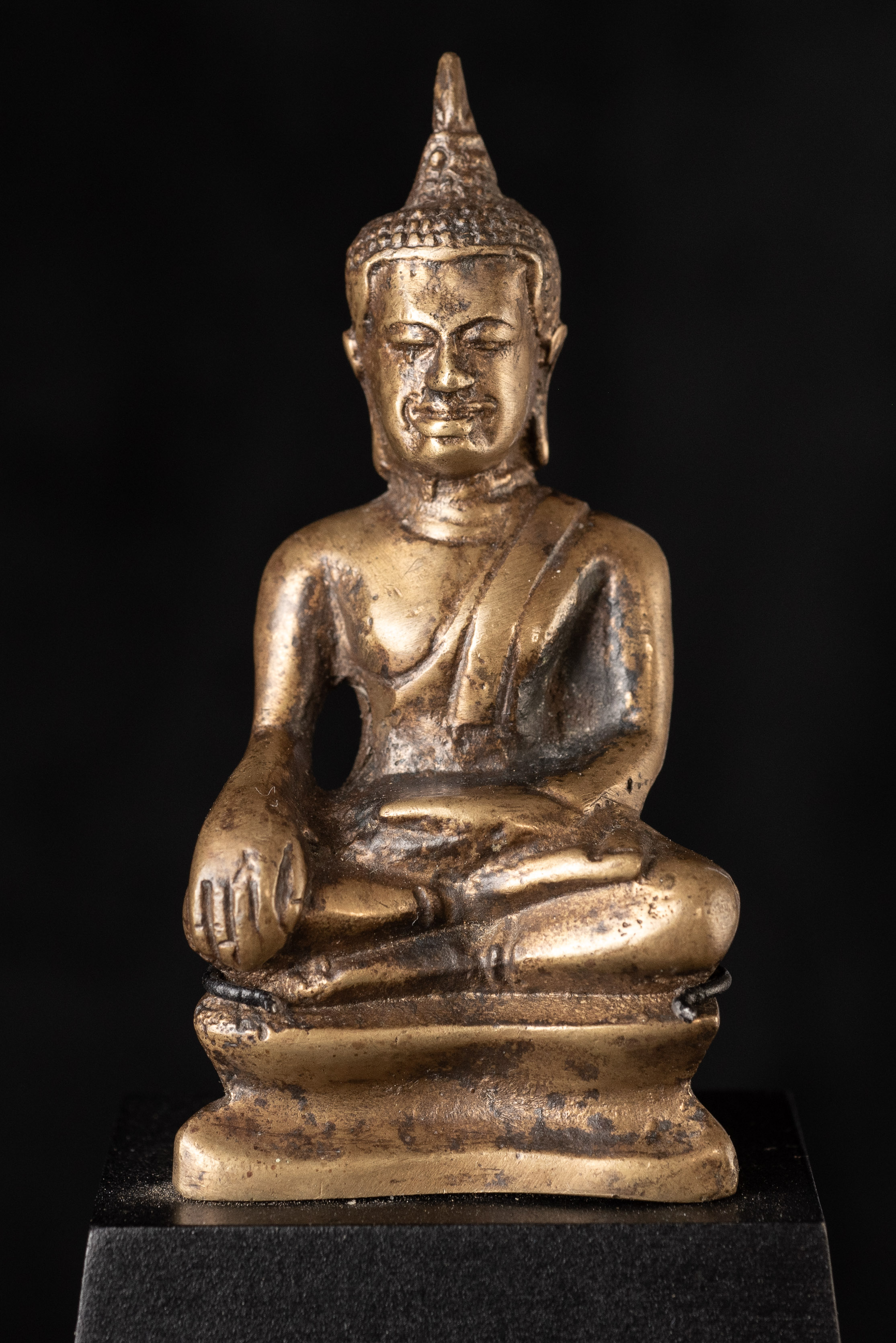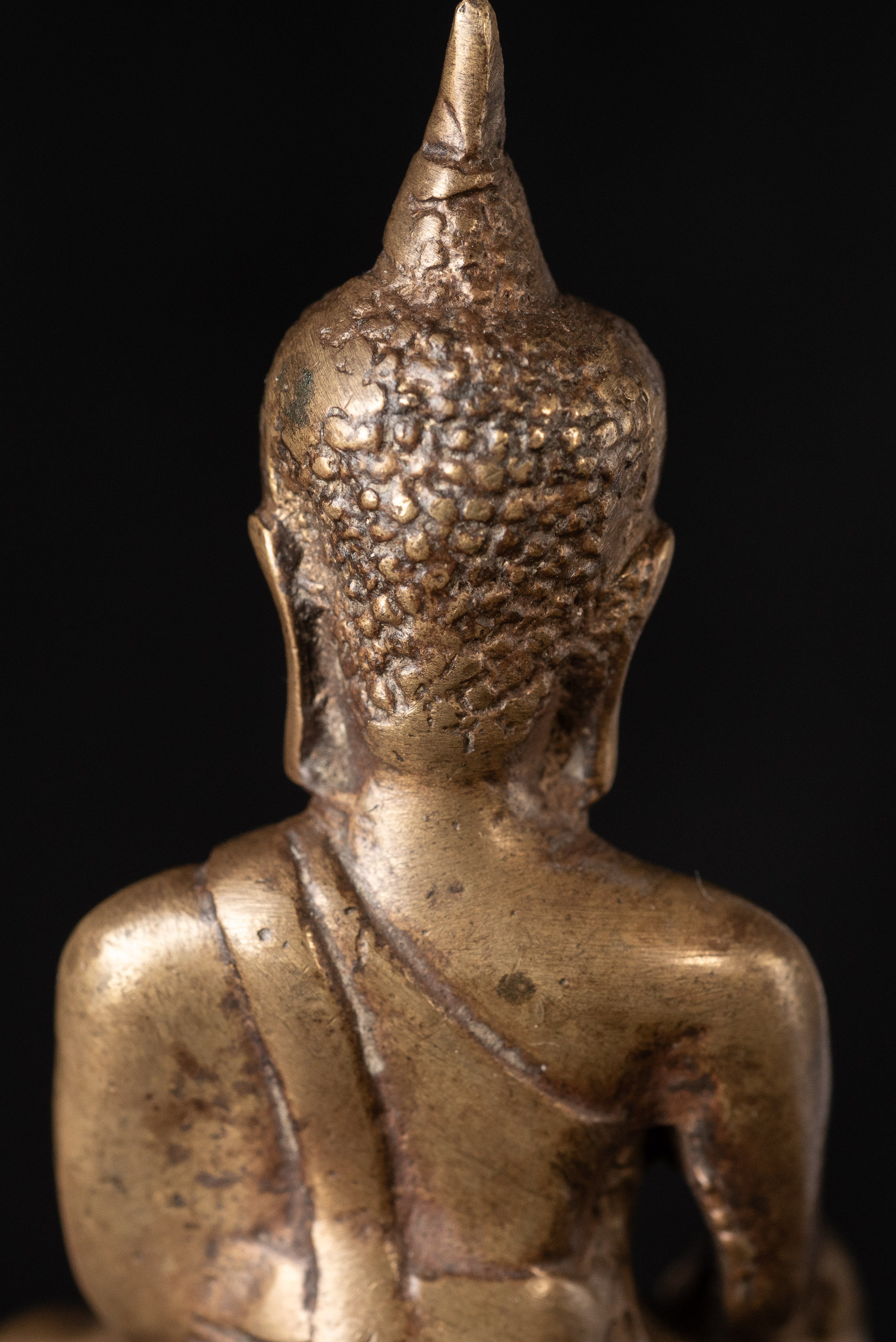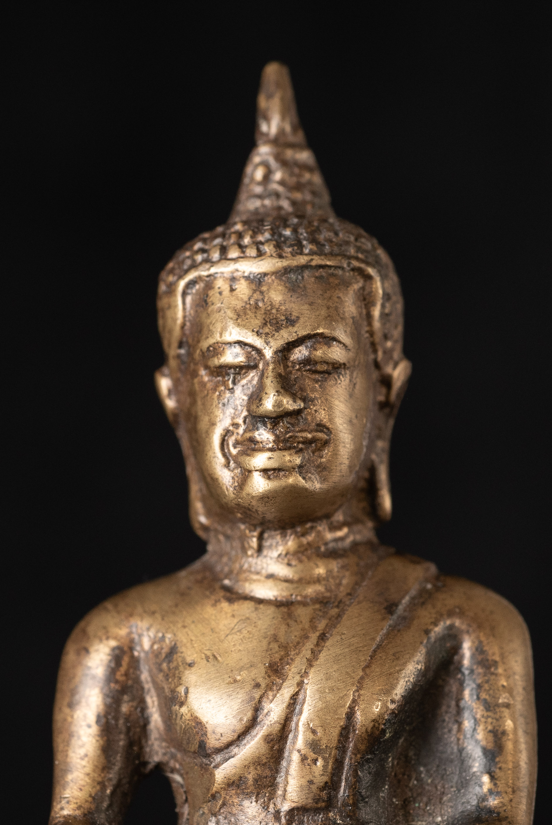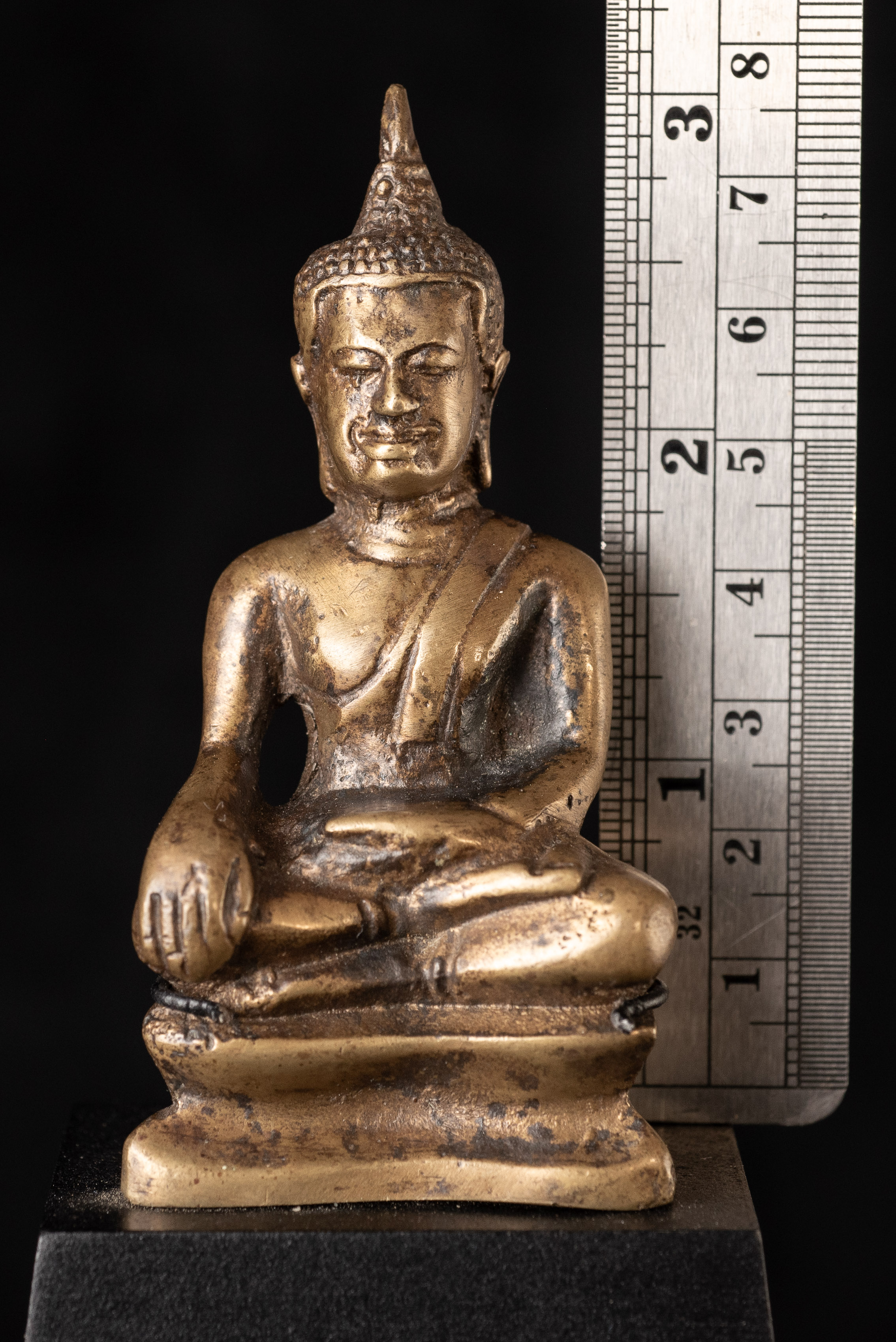 15Thai solid-cast Utong-B bronze Buddha statue. Only 3 inches tall but with a huge presence. Wear consistent with age, some corrosion.. Rare type. I've seen two others over 35years of searching. one retained all of its gilding. (3"H x 1.5"W x 1"D)-250g. / Base: 1.25"H x 2.5"W). Look. Into the face- it has a classic Utong look and feel to it.