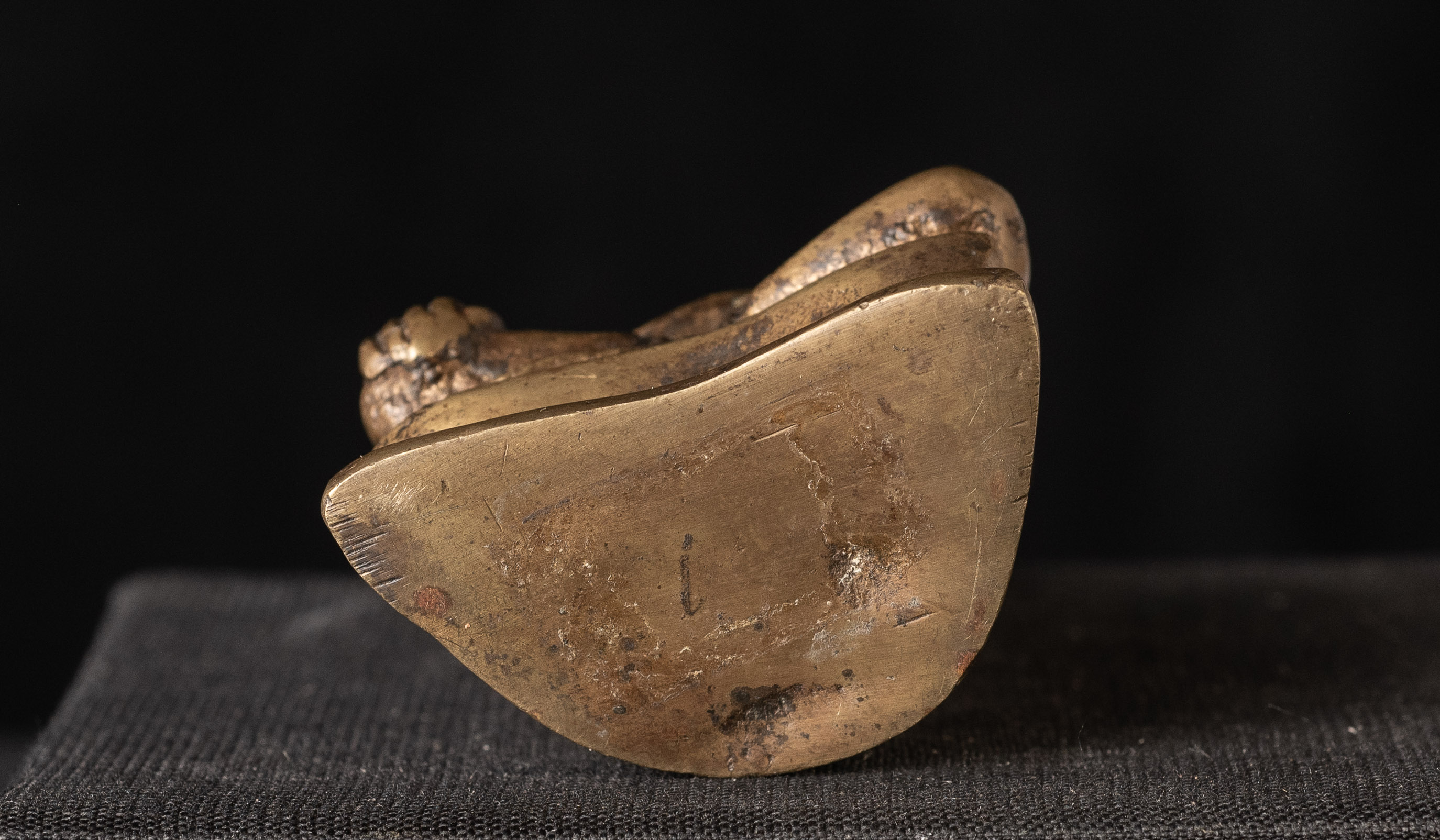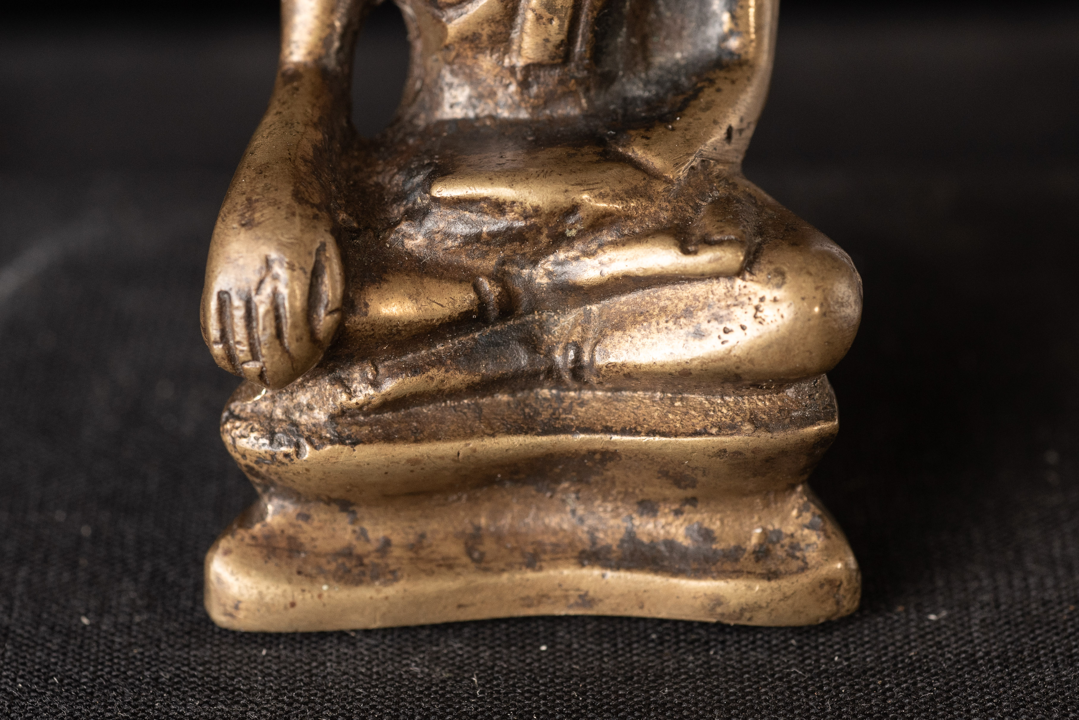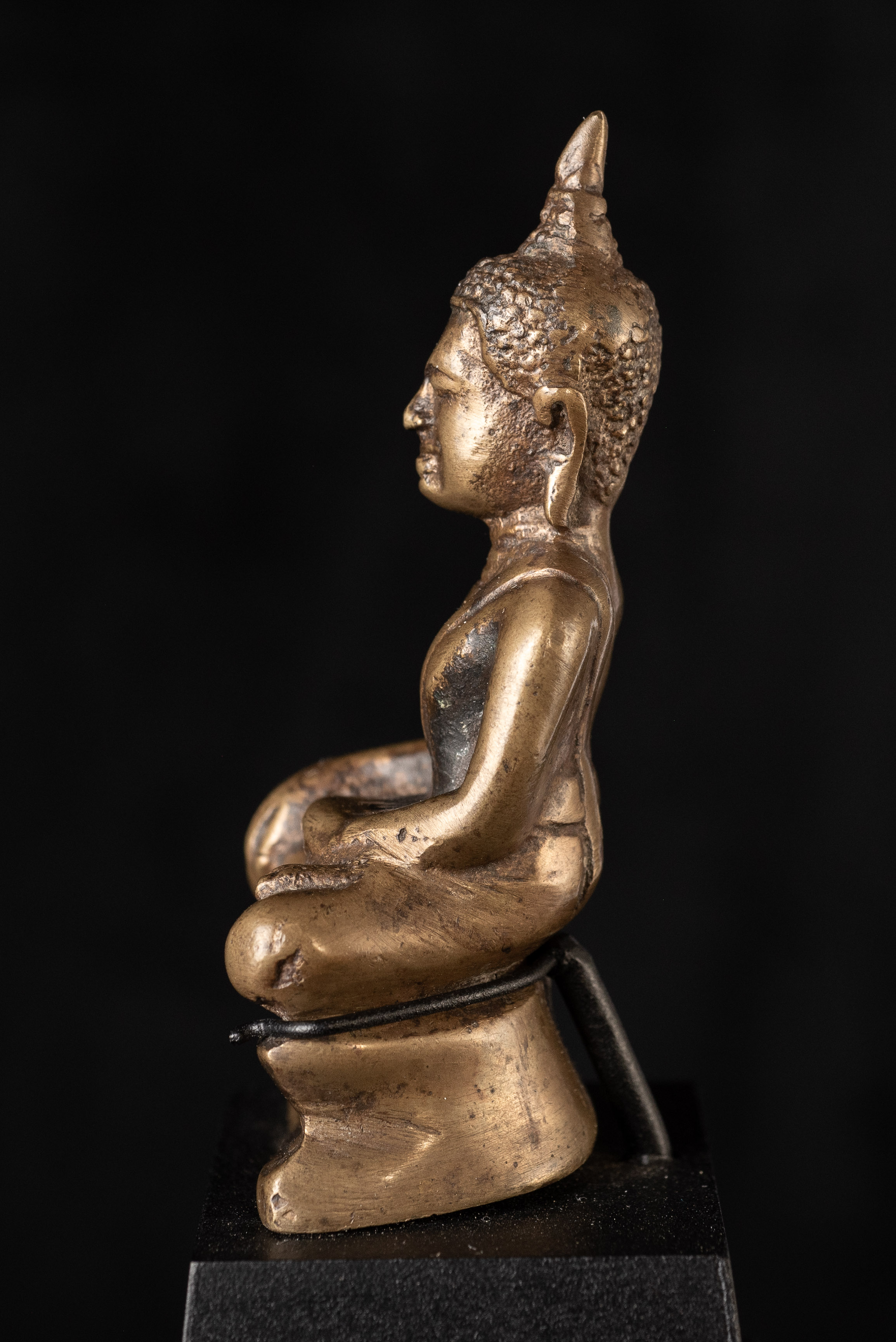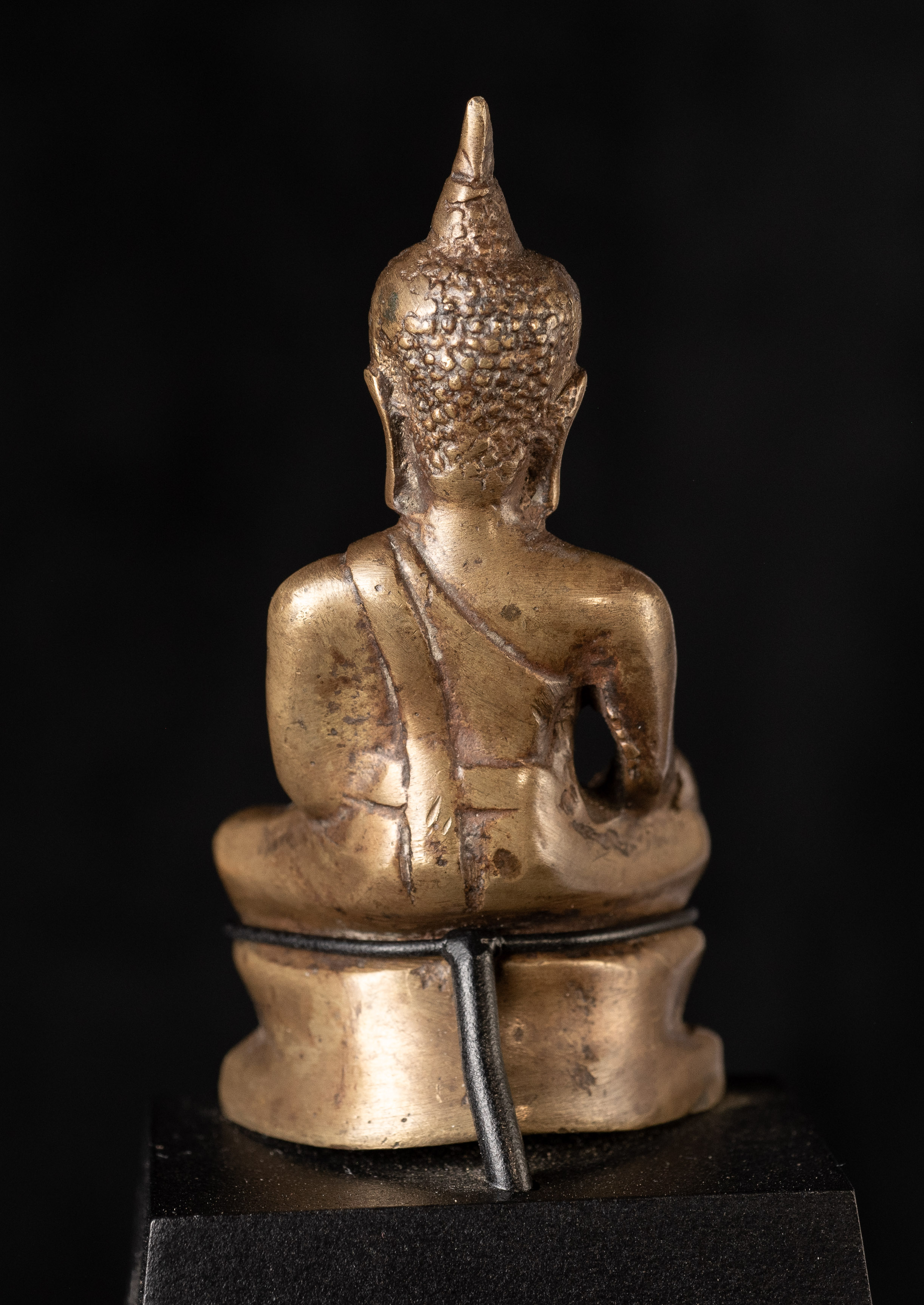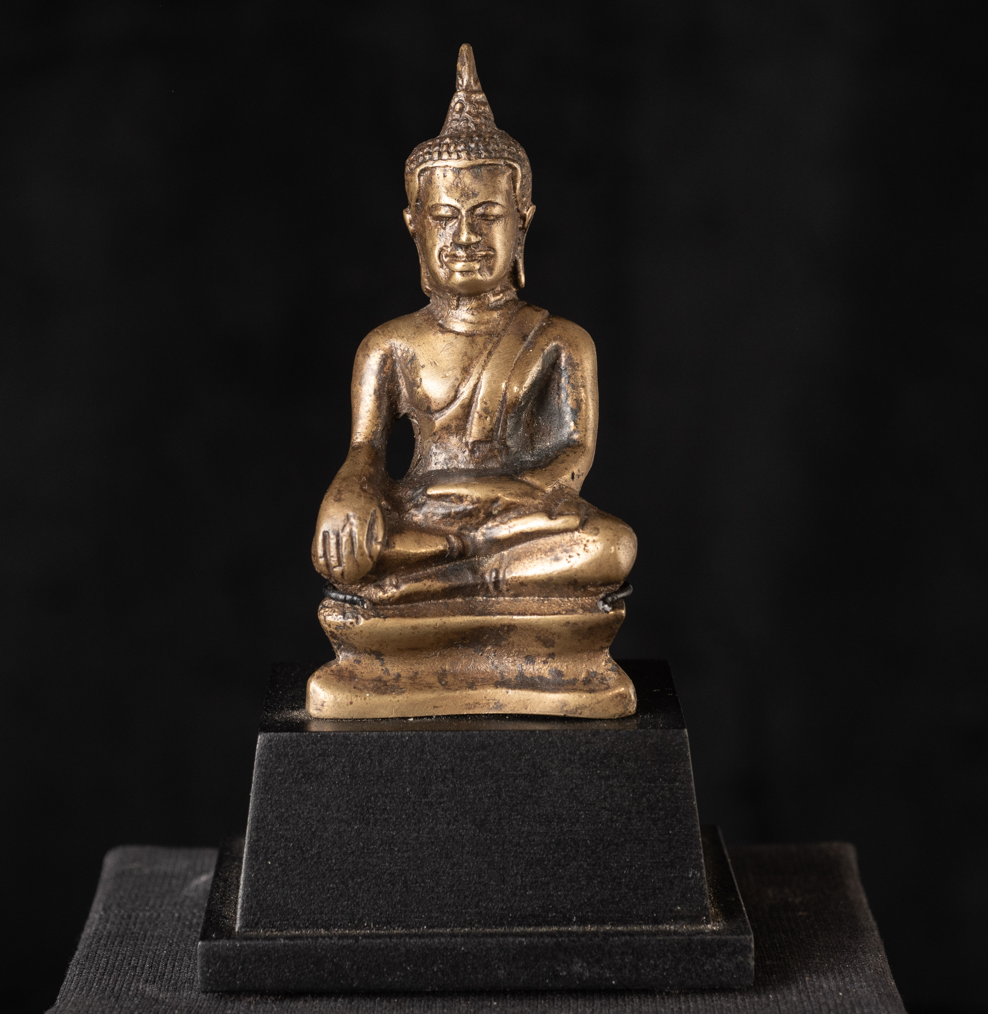 15Thai solid-cast Utong-B bronze Buddha statue. Only 3 inches tall but with a huge presence. Wear consistent with age, some corrosion.. Rare type. I've seen two others over 35years of searching. one retained all of its gilding. (3"H x 1.5"W x 1"D)-250g. / Base: 1.25"H x 2.5"W). Look. Into the face- it has a classic Utong look and feel to it.