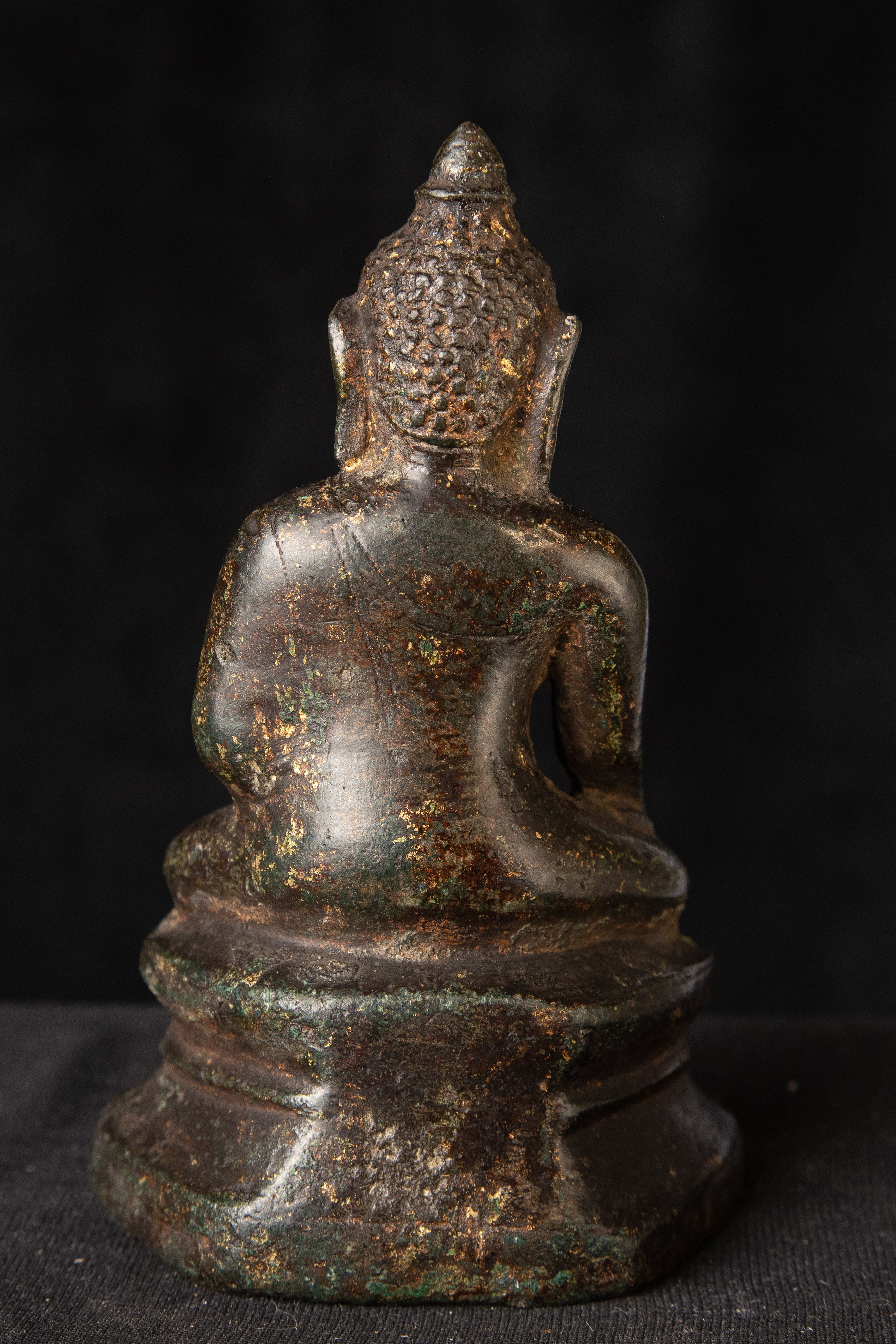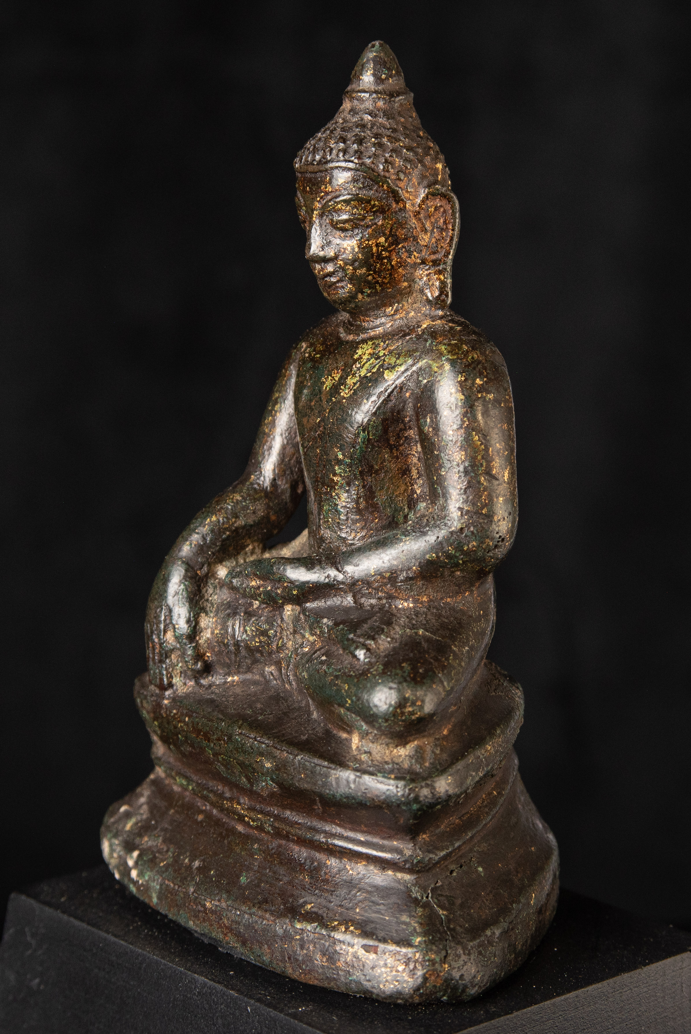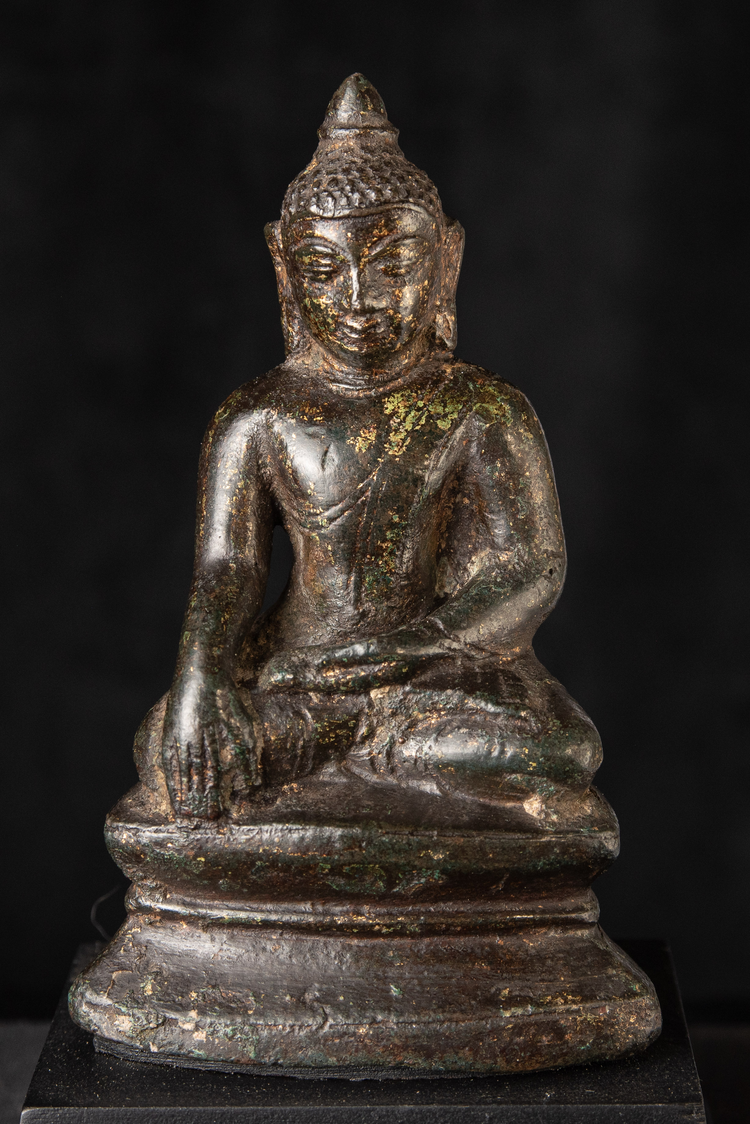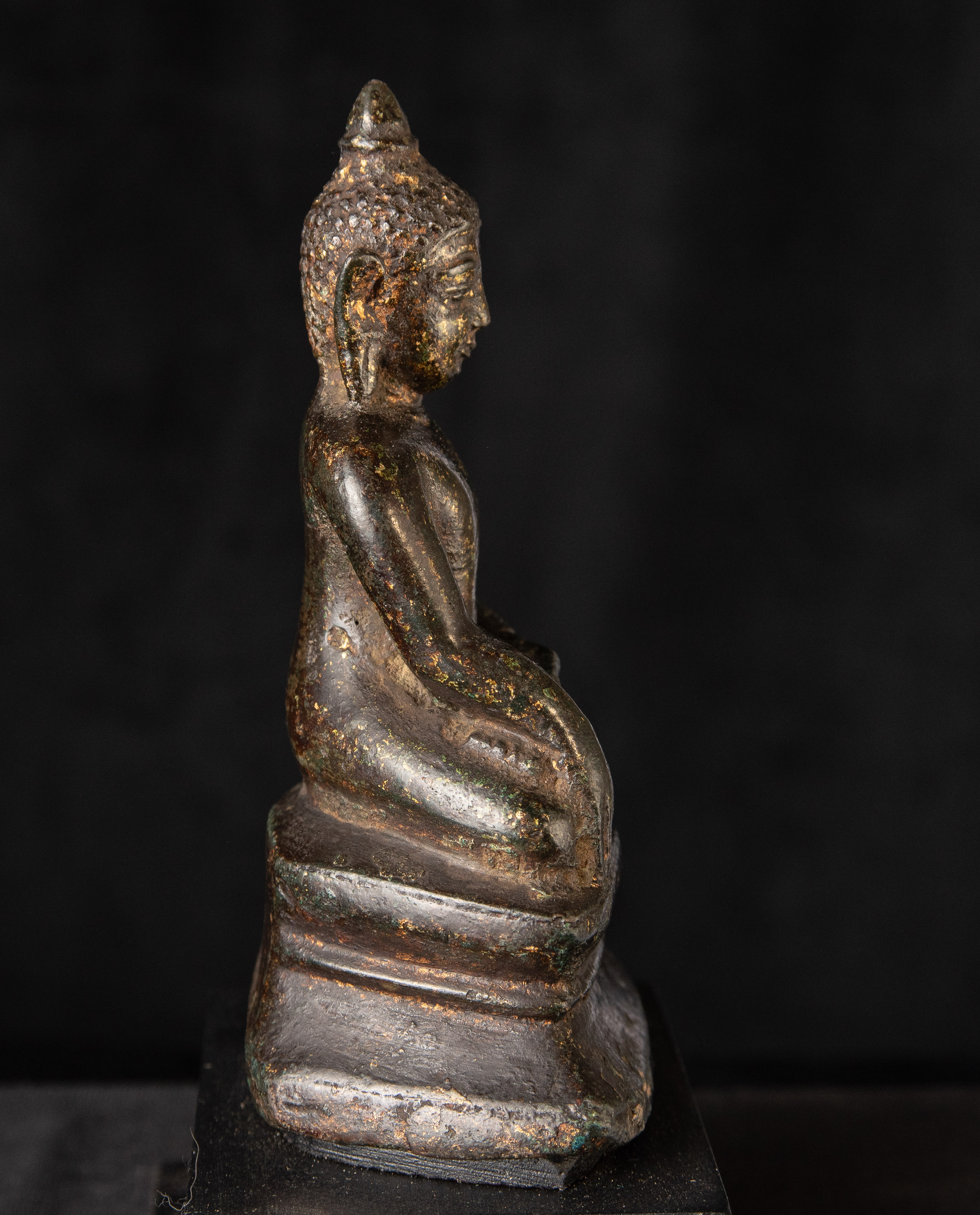 Very good post-Pagan Burmese Buddha. Remains of the original gilding. Likely 14th century, possibly a little later. (4.75"H x 2.75"W x 2"D)-790g. / Base: 1.25"H x 3.75"W)