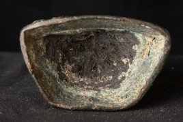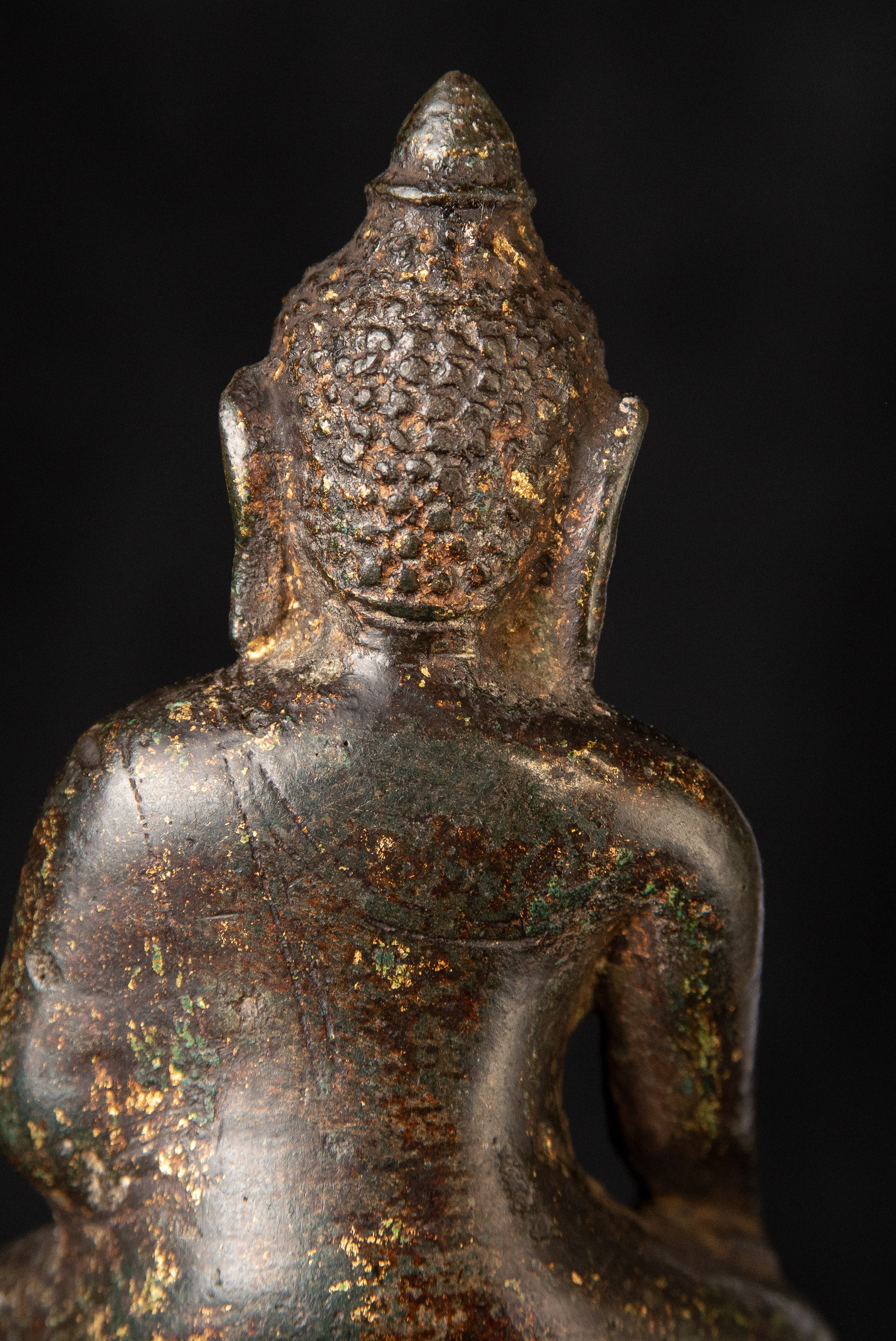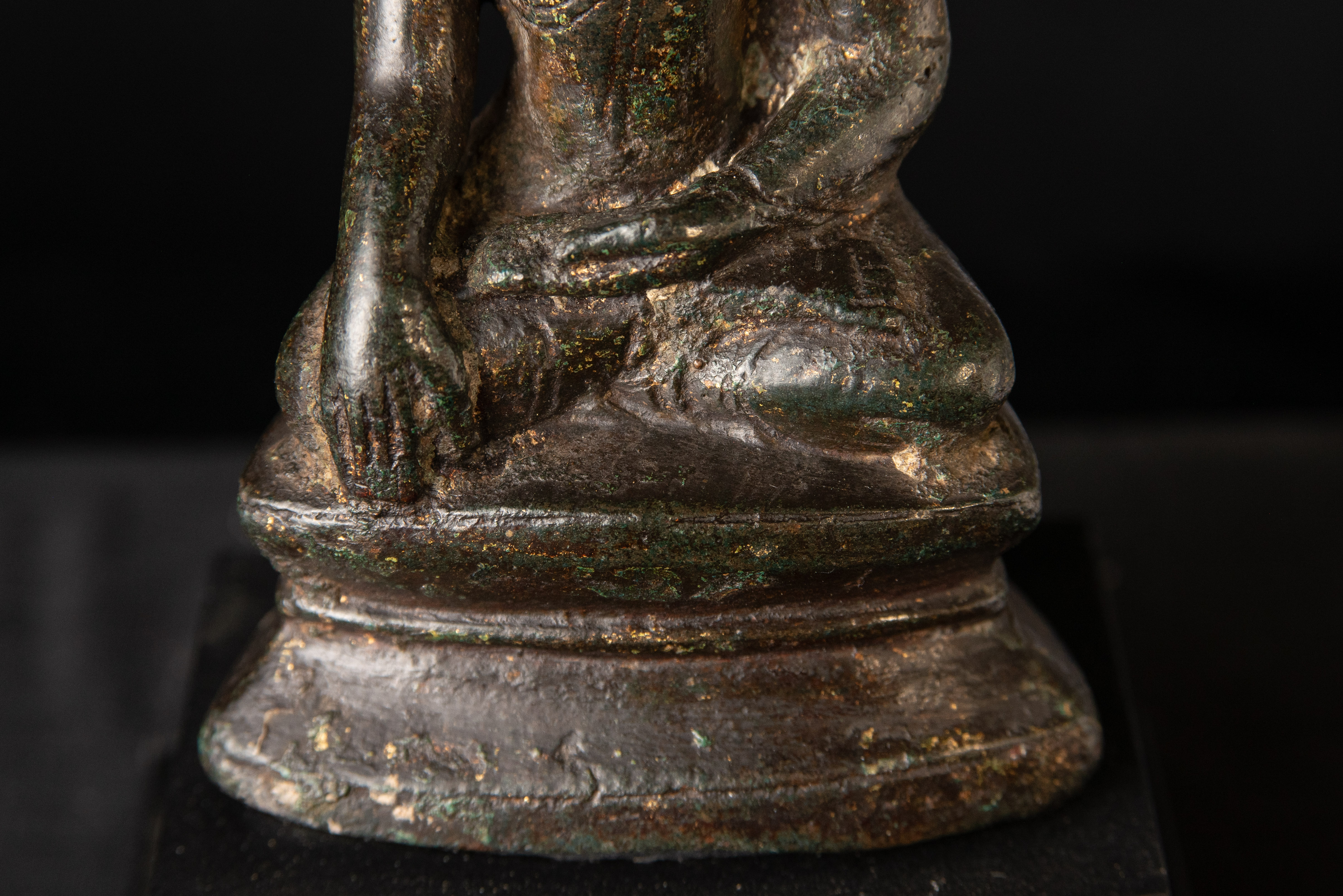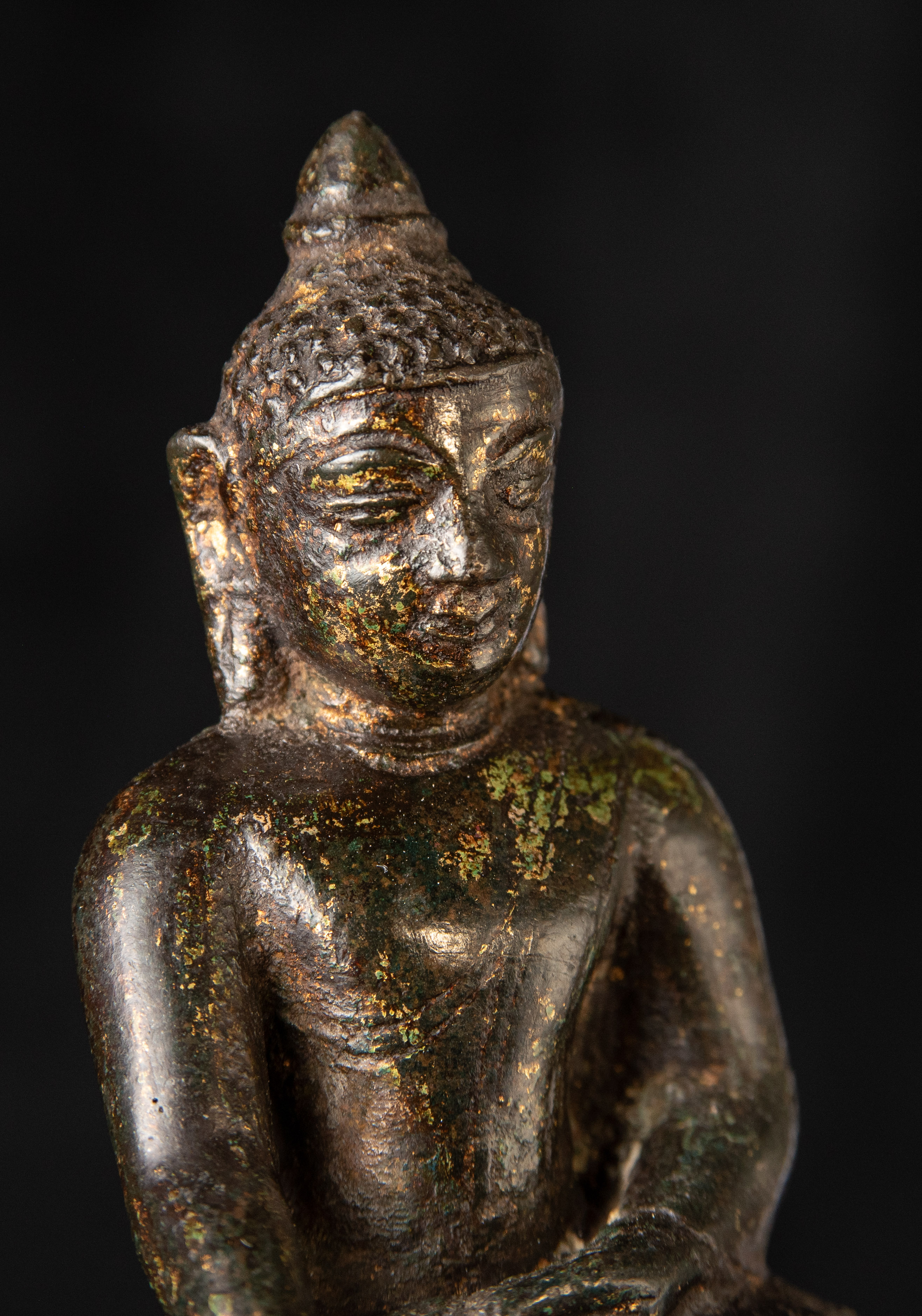 Very good post-Pagan Burmese Buddha. Remains of the original gilding. Likely 14th century, possibly a little later. (4.75"H x 2.75"W x 2"D)-790g. / Base: 1.25"H x 3.75"W)