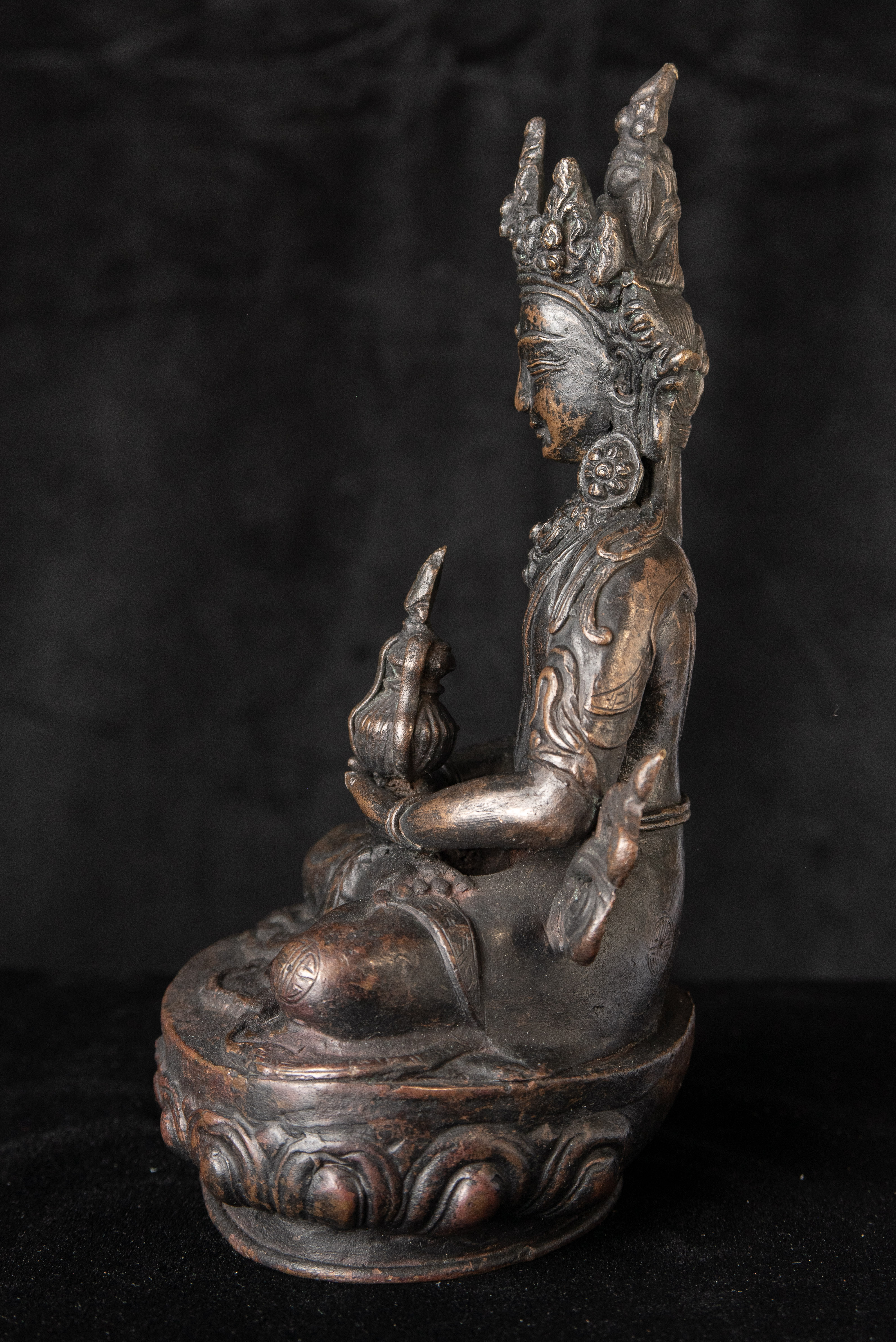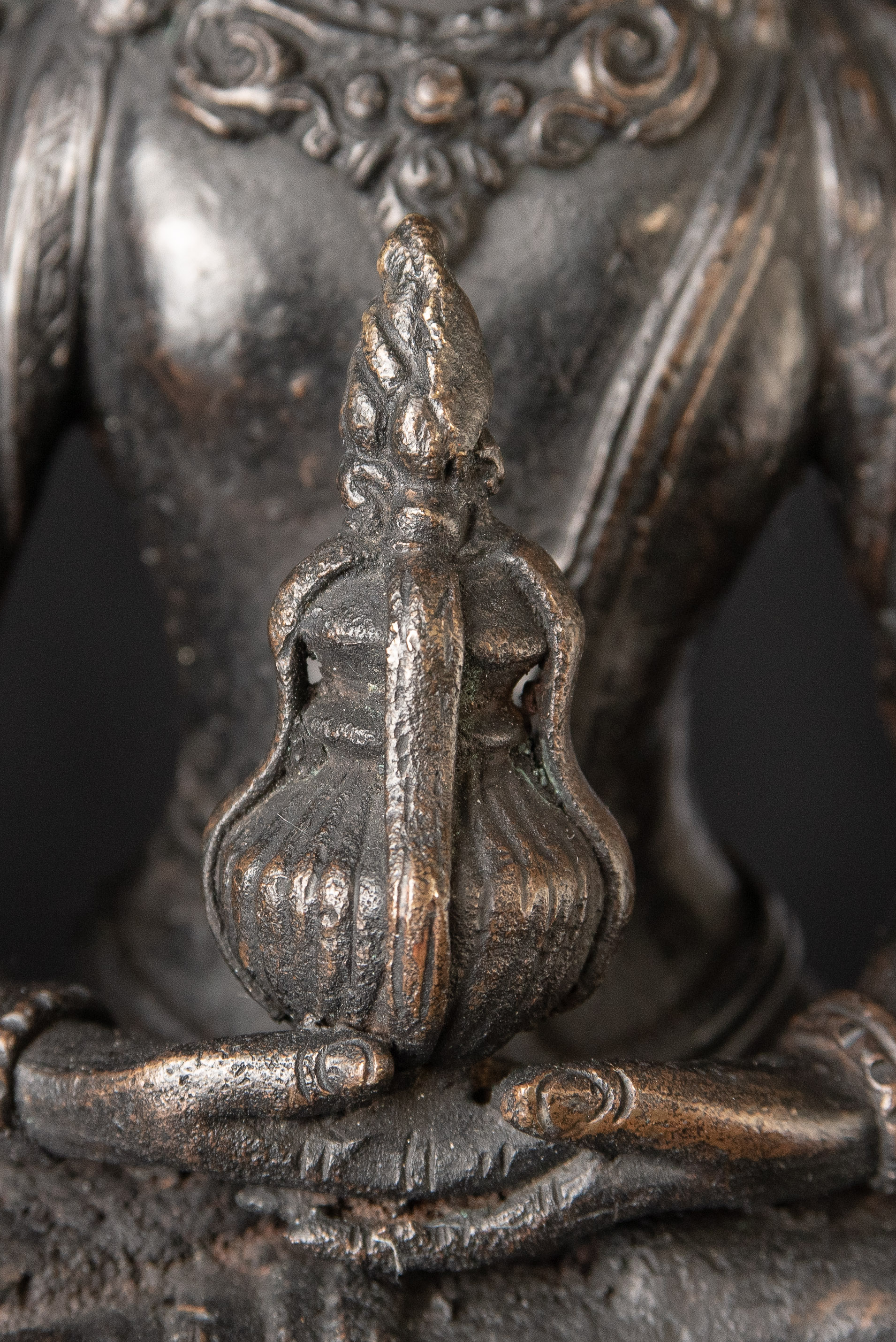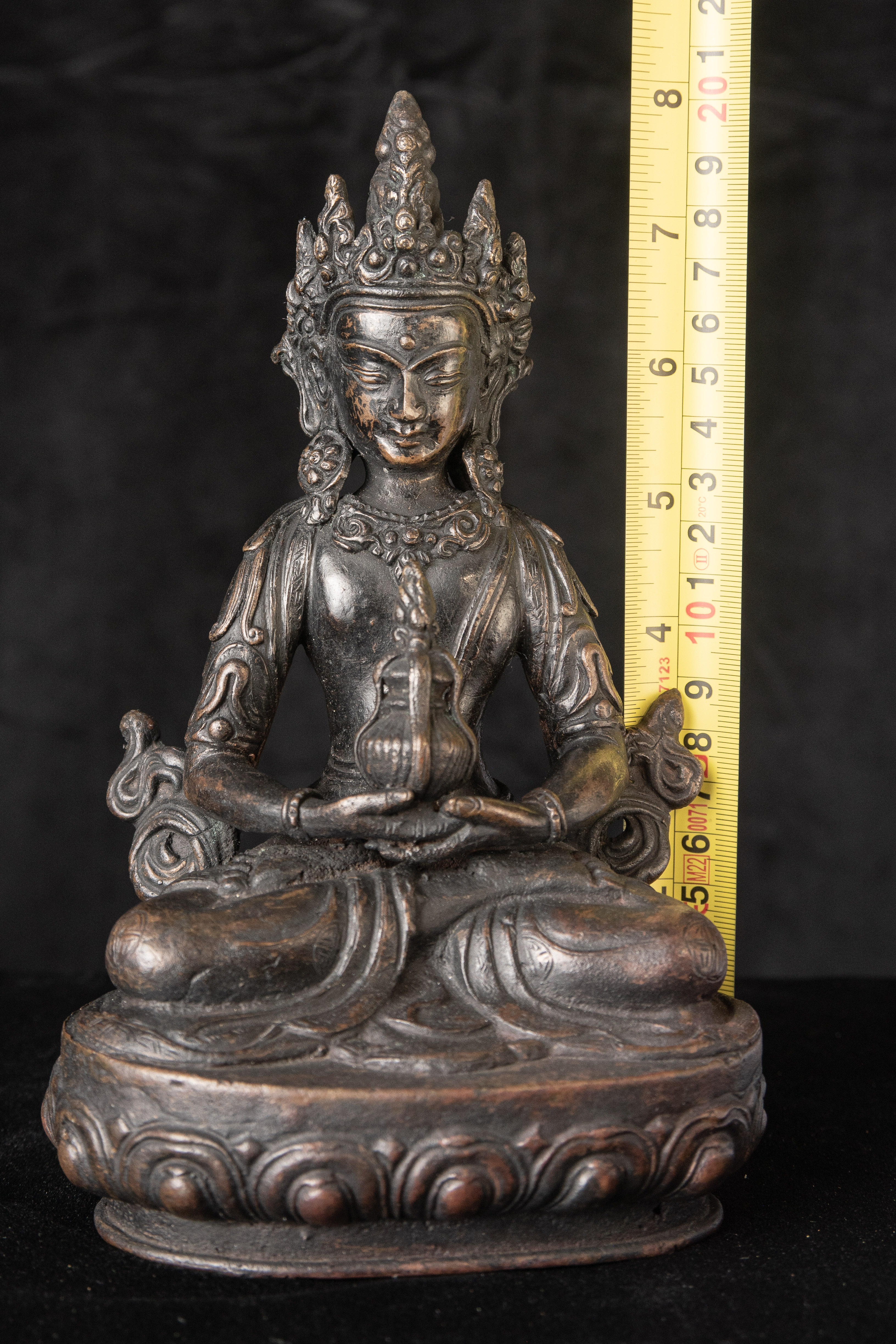 Old Nepalese Bodhisattva of Long Life (Amatayus). Very well-cast example. Good size at 7.75 inches tall. Likely had a cap that covered/consecrated the underside for much of its life. (7.75"H x 5"W x 3.75"D) - 2.18lbs