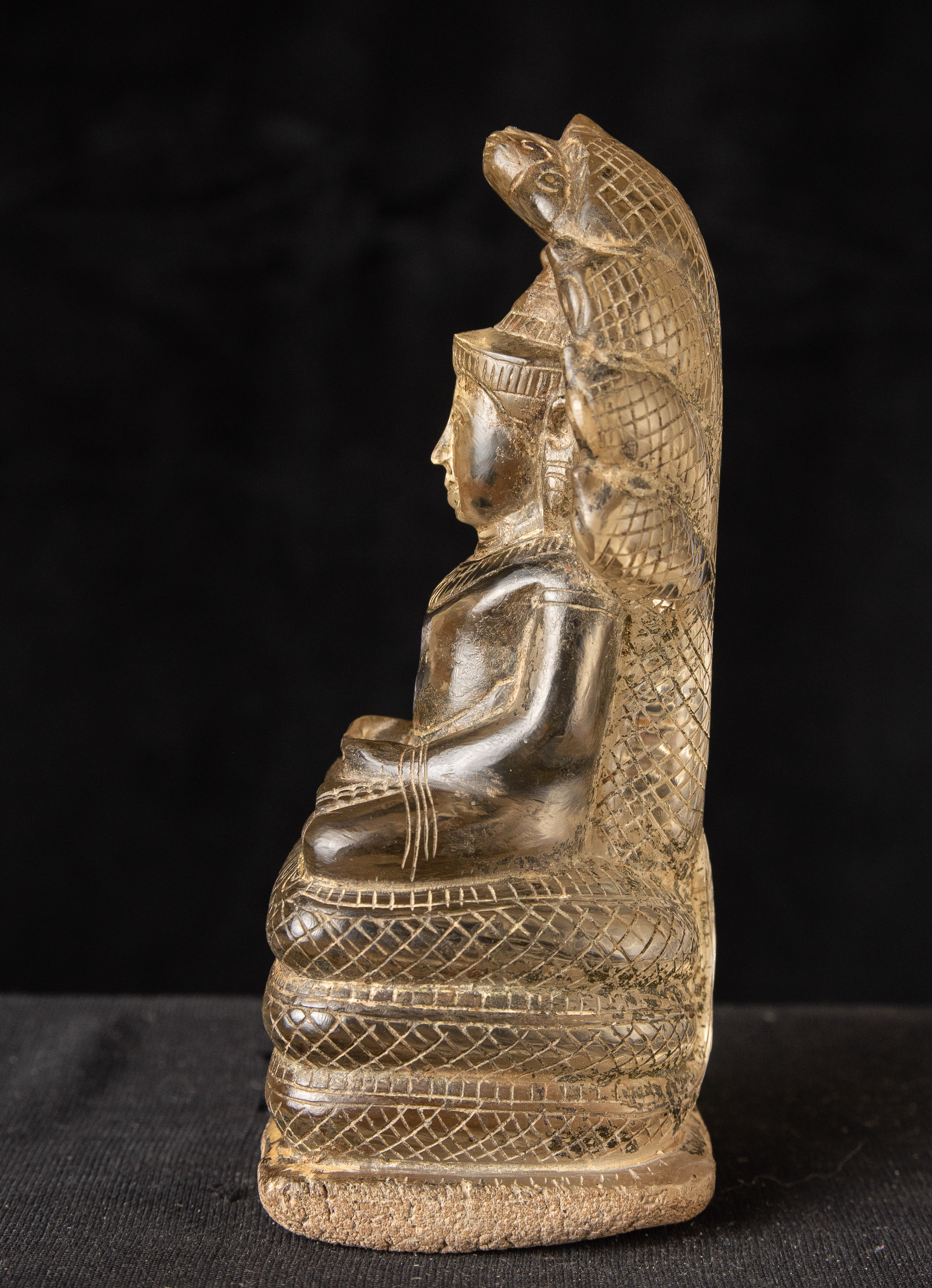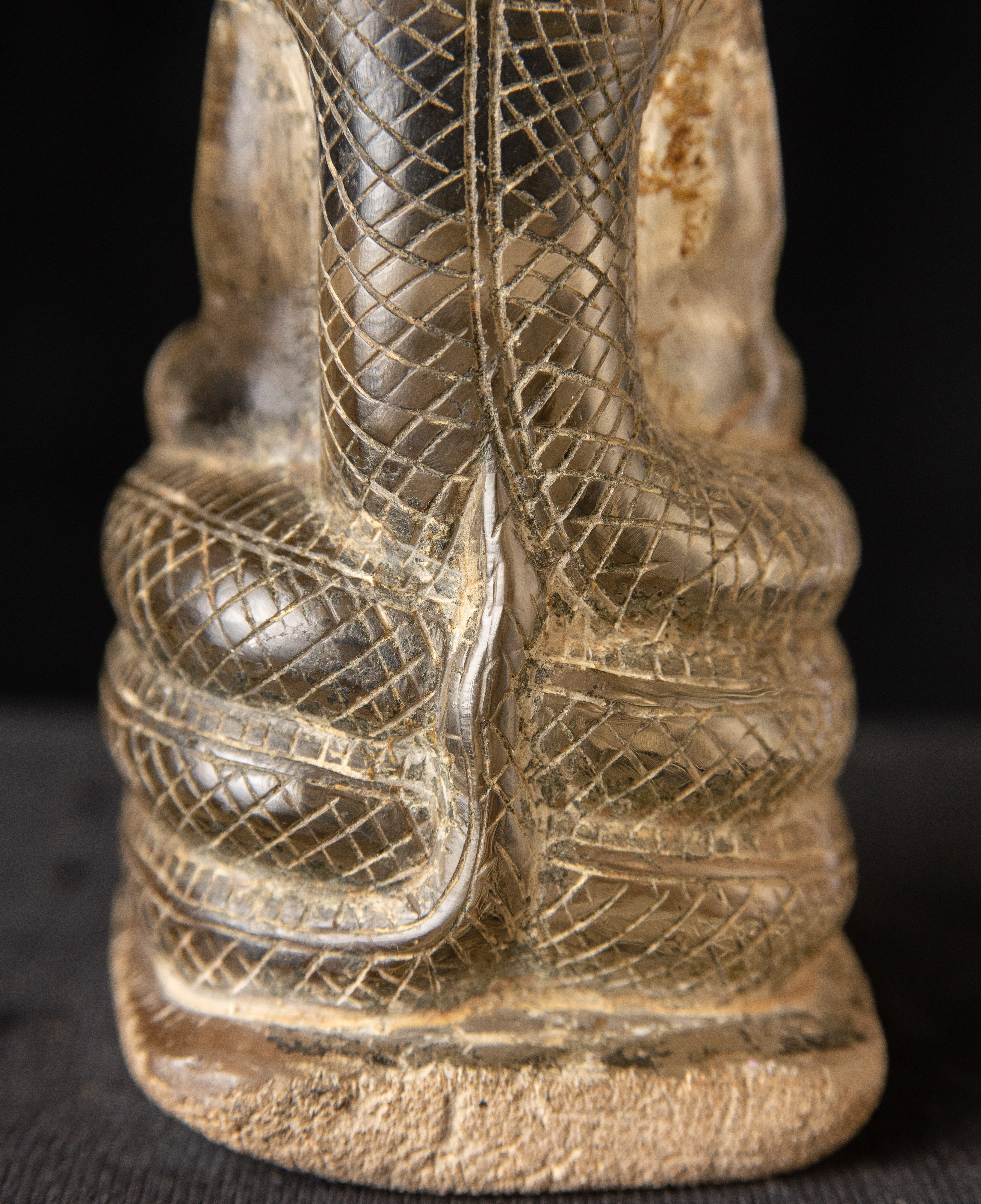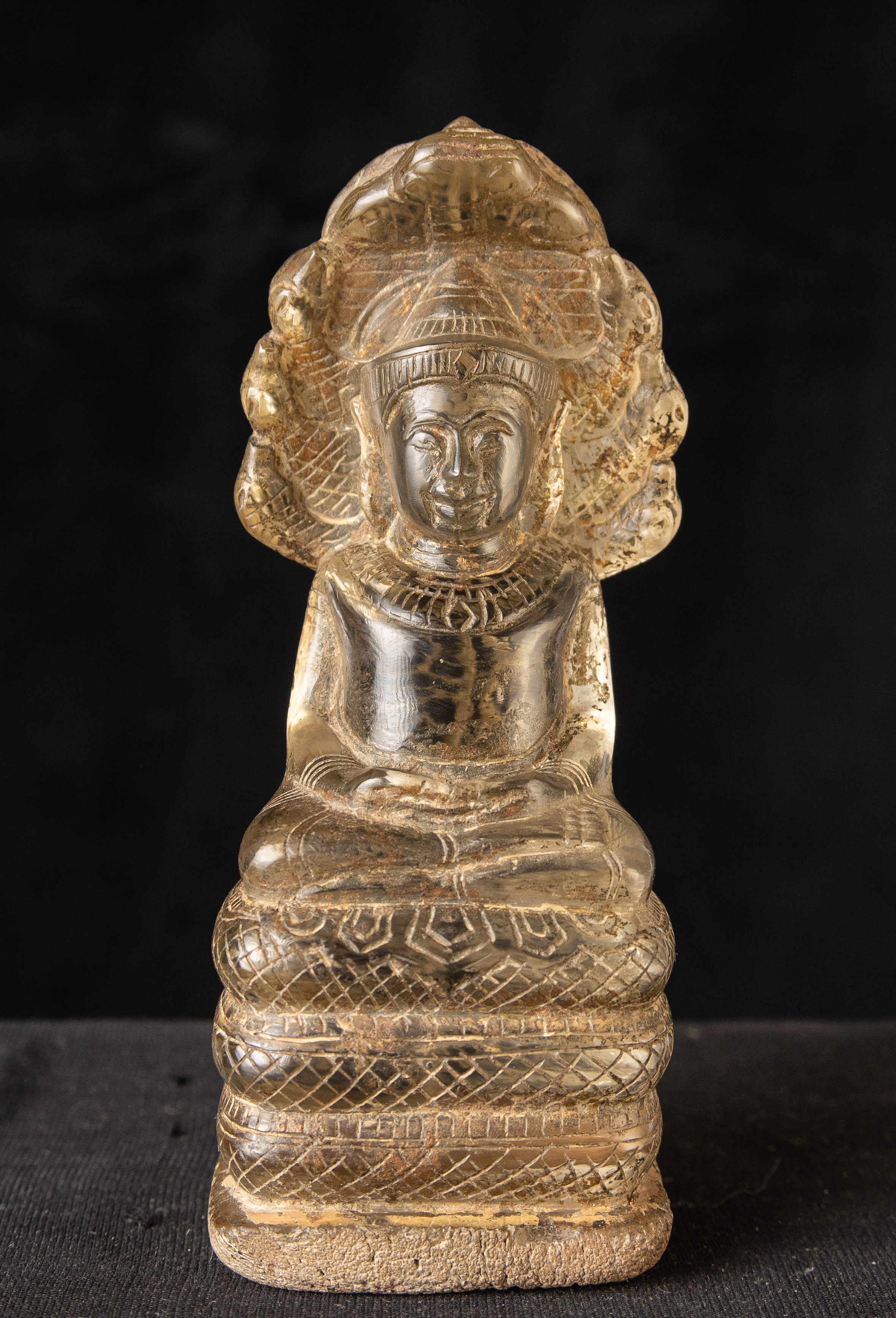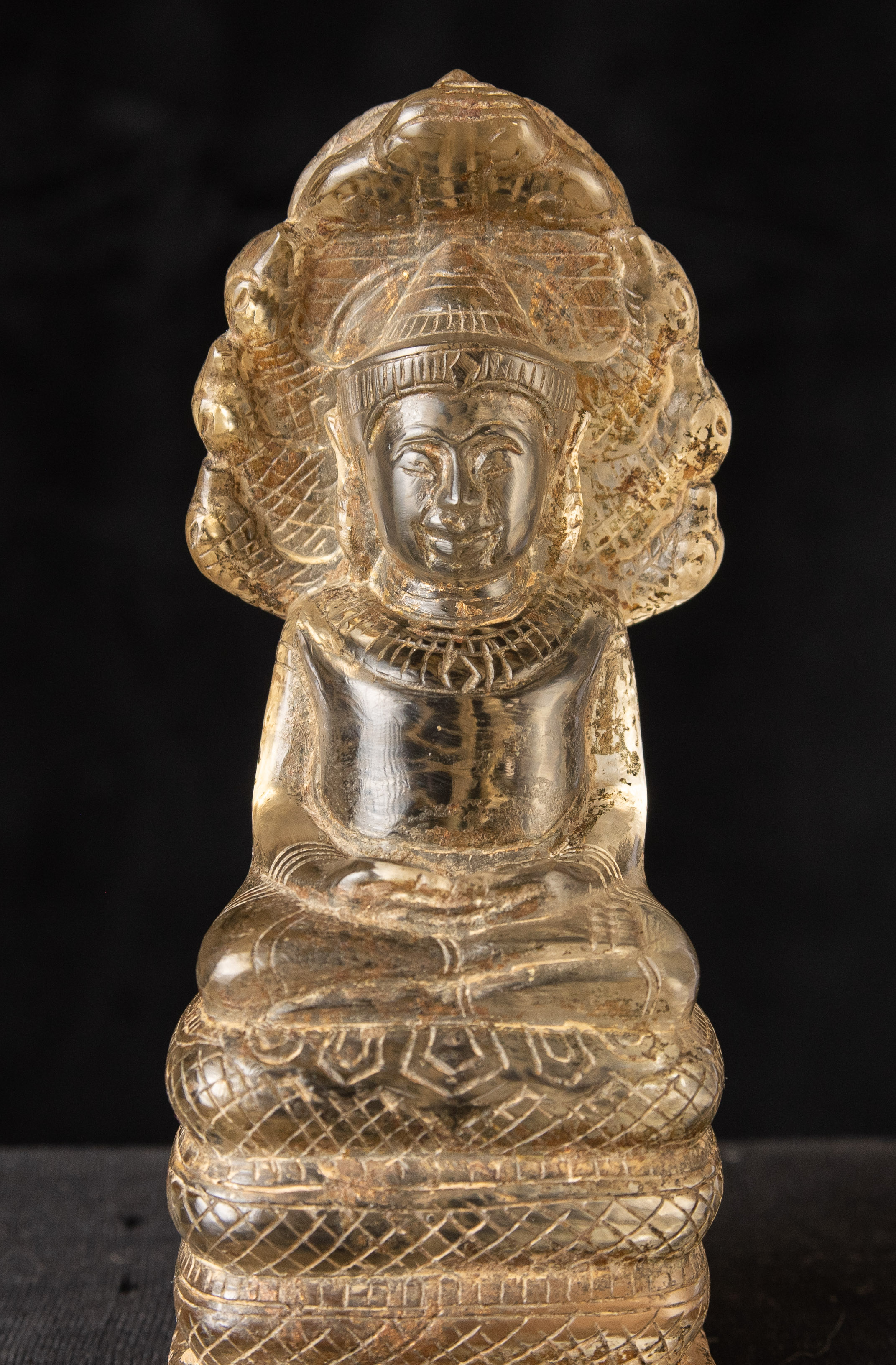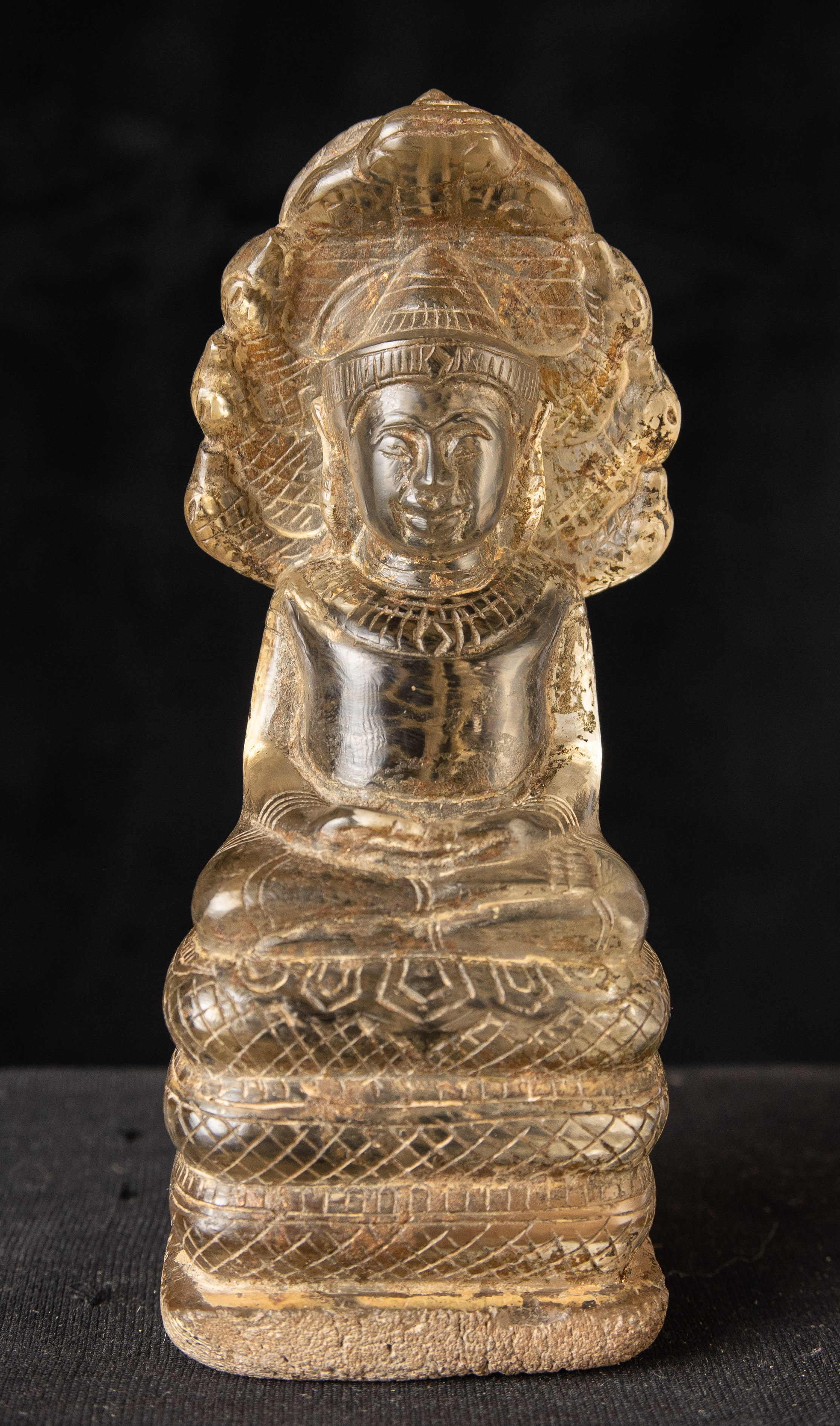 This is a 15th century or later Cambodian Naga Buddha. At first I thought it was made of crystal, but after close examination, I think it is probably carved out of a block of ancient glass. I’m not 100% on this, and on some level it does not matter as it is just as special which ever material it is made from. It has traces of gilding in a few of the crevices, though you’ll have to look carefully to see them. It also has encrusted remains of burial. I’ve not had one quite like this before. The carving and style suggest that it is probably 15 to 17 century, though it could be a bit earlier or later. Looks to be created during Ayuthaya . In Thailand, though this piece is more likely from Cambodia. It’s very hard to date this type of Buddha with precision. The sculpting is not as refined as on some other examples of early crystal or glass Buddhas, but it does have more detail than most. Rare to find a Naga Buddha in this form. Substantial weight and nice size.(5”9x 2"W X 2"D) - 410g.