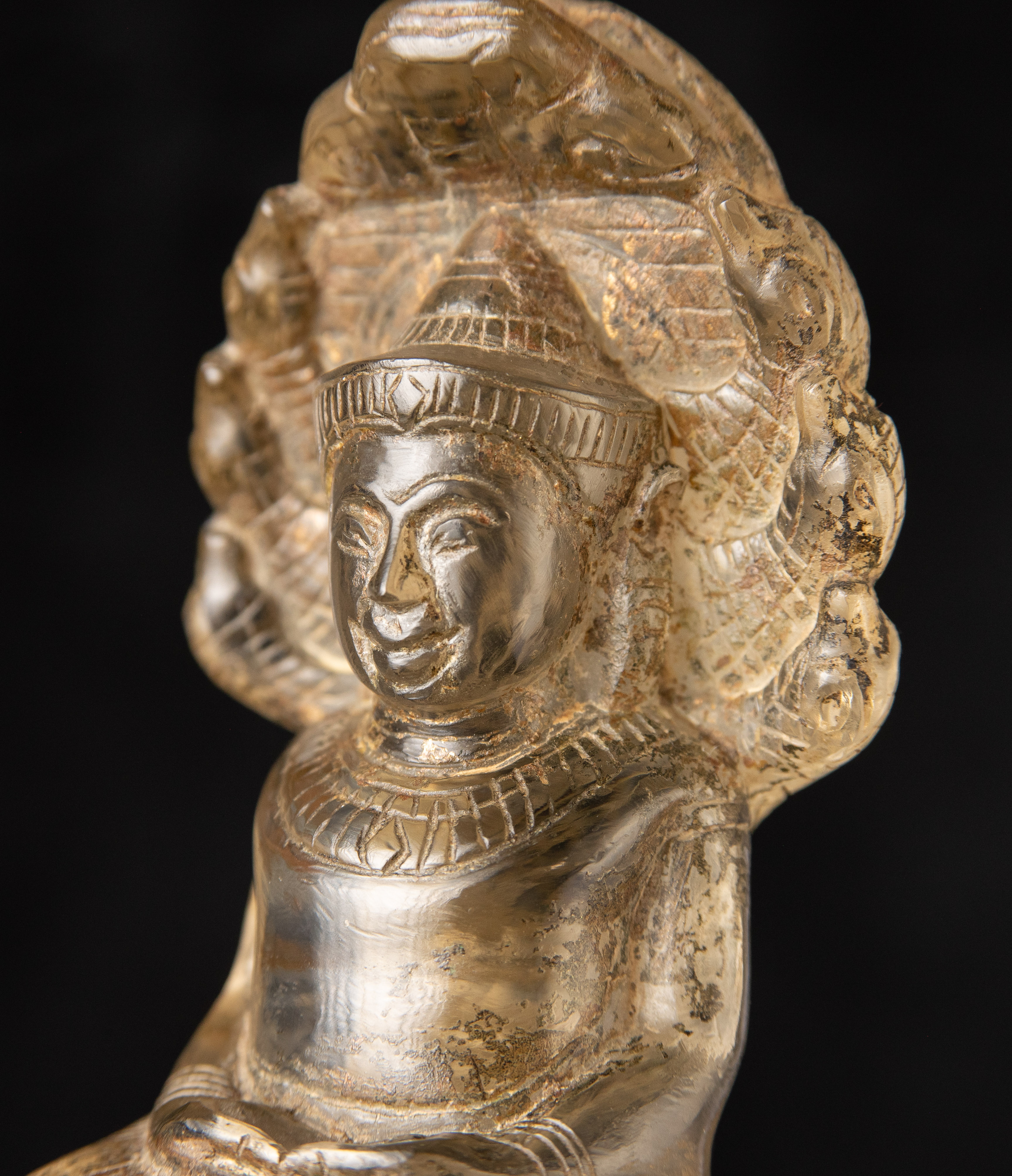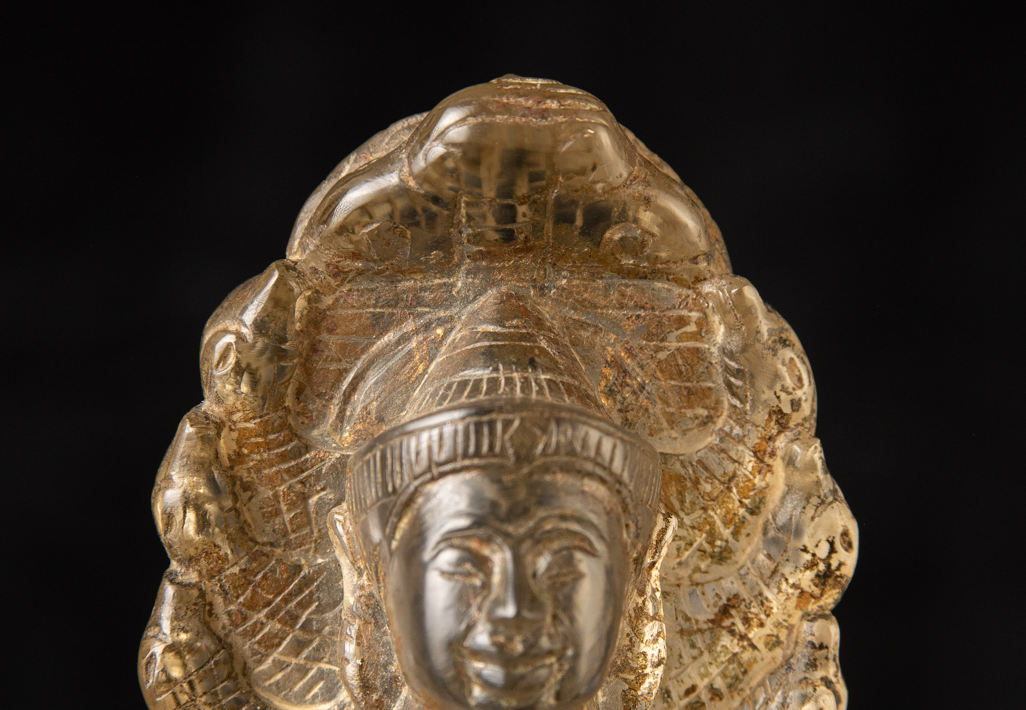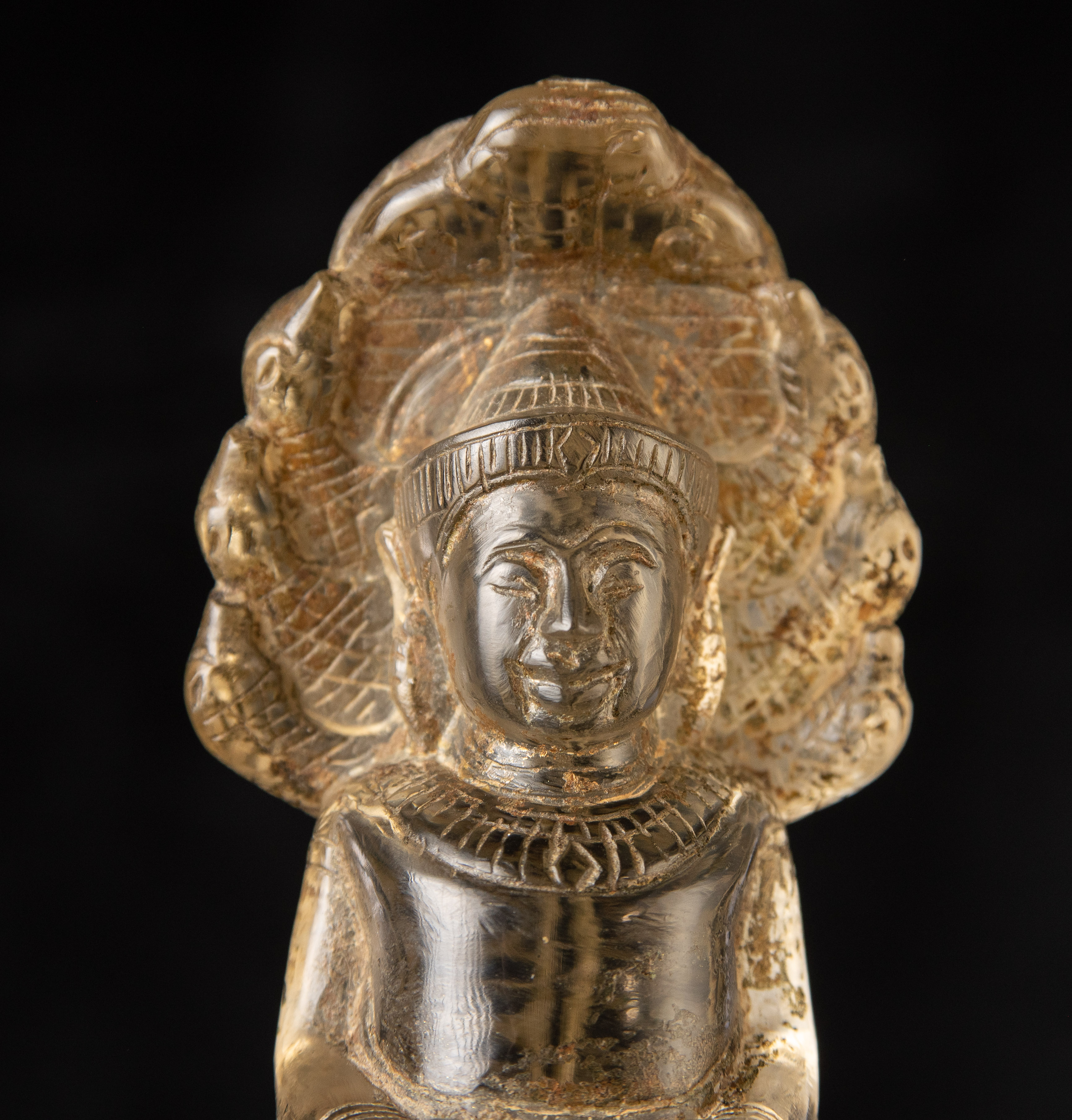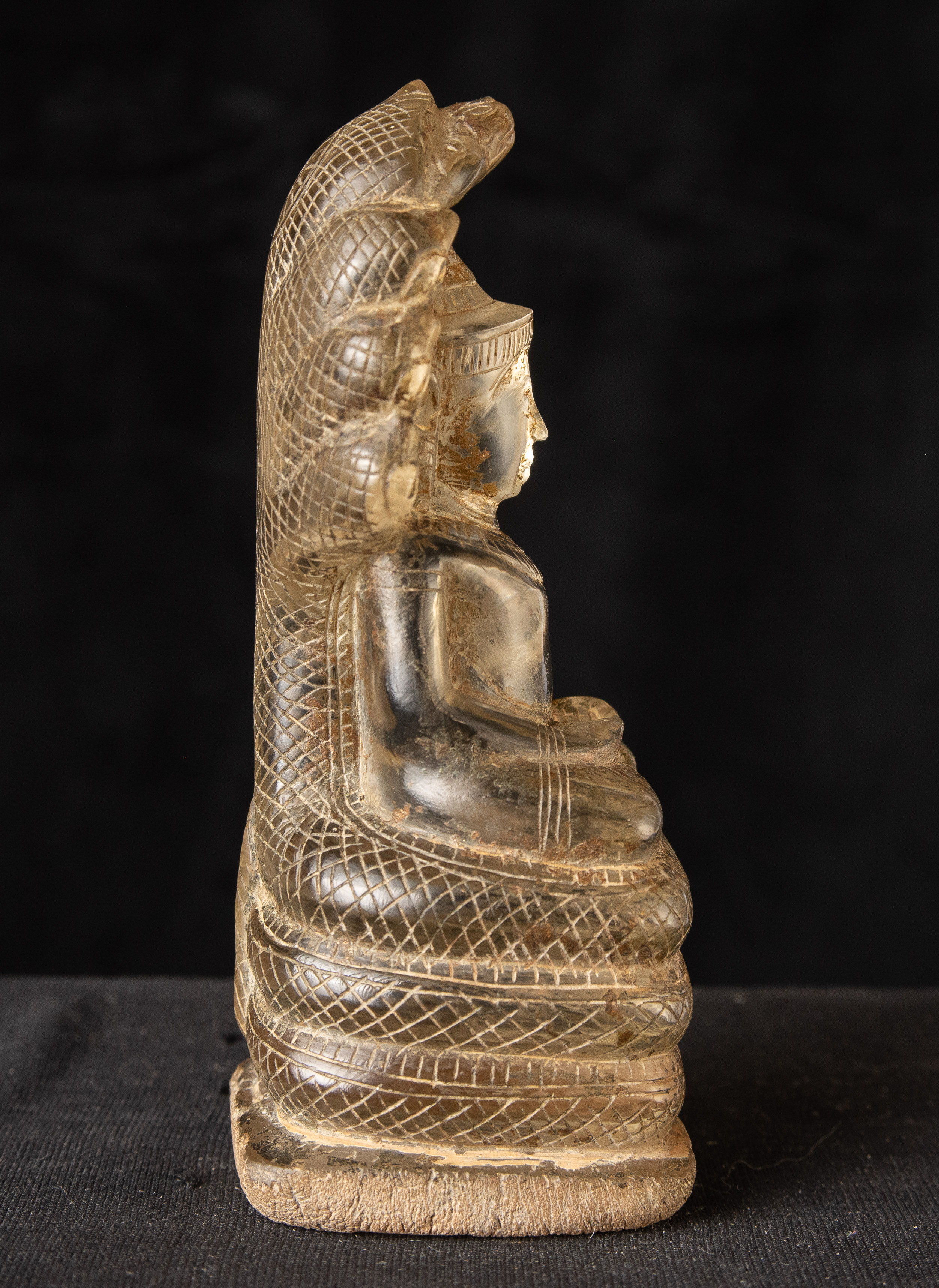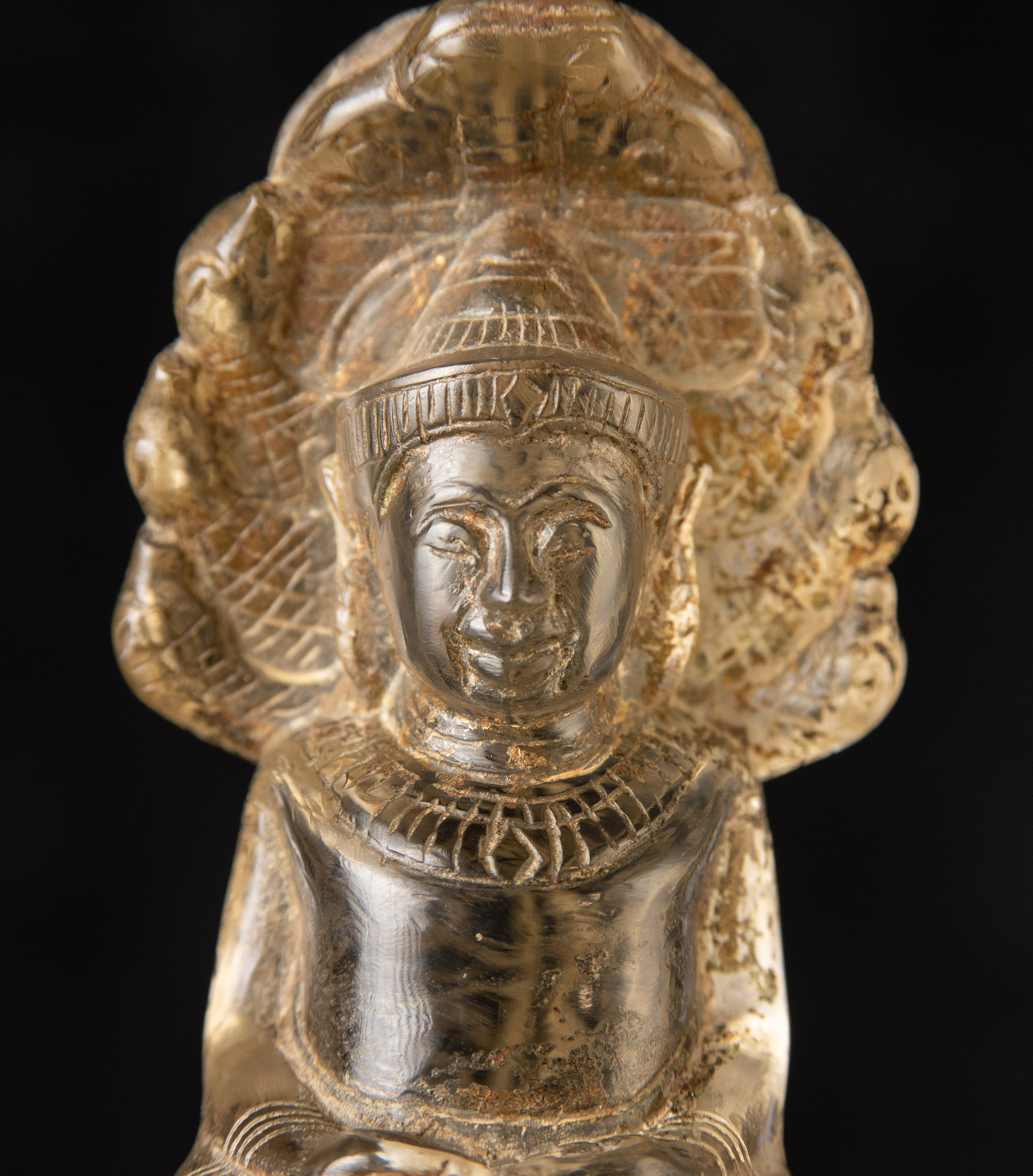 This is a 15th century or later Cambodian Naga Buddha. At first I thought it was made of crystal, but after close examination, I think it is probably carved out of a block of ancient glass. I’m not 100% on this, and on some level it does not matter as it is just as special which ever material it is made from. It has traces of gilding in a few of the crevices, though you’ll have to look carefully to see them. It also has encrusted remains of burial. I’ve not had one quite like this before. The carving and style suggest that it is probably 15 to 17 century, though it could be a bit earlier or later. Looks to be created during Ayuthaya . In Thailand, though this piece is more likely from Cambodia. It’s very hard to date this type of Buddha with precision. The sculpting is not as refined as on some other examples of early crystal or glass Buddhas, but it does have more detail than most. Rare to find a Naga Buddha in this form. Substantial weight and nice size.(5”9x 2"W X 2"D) - 410g.