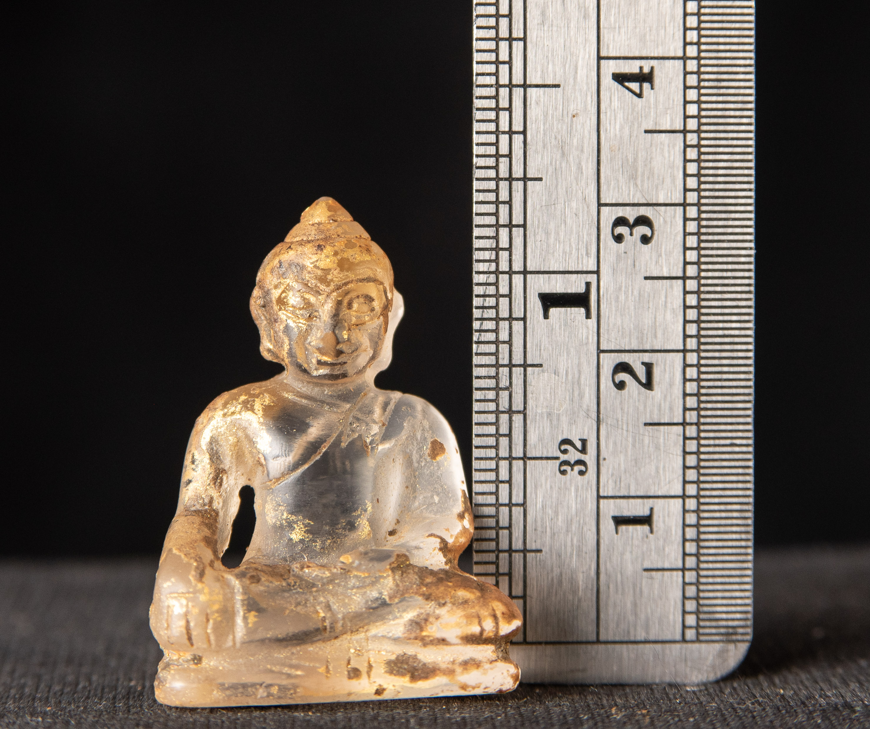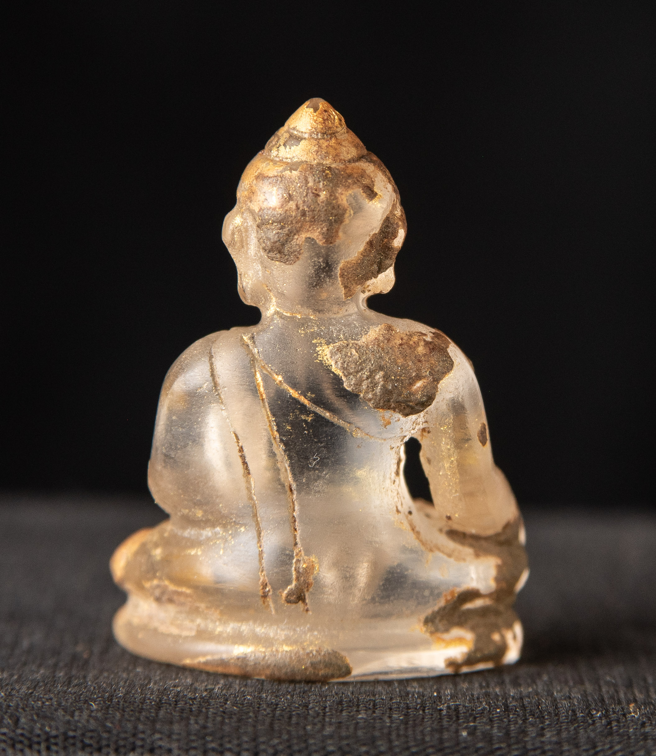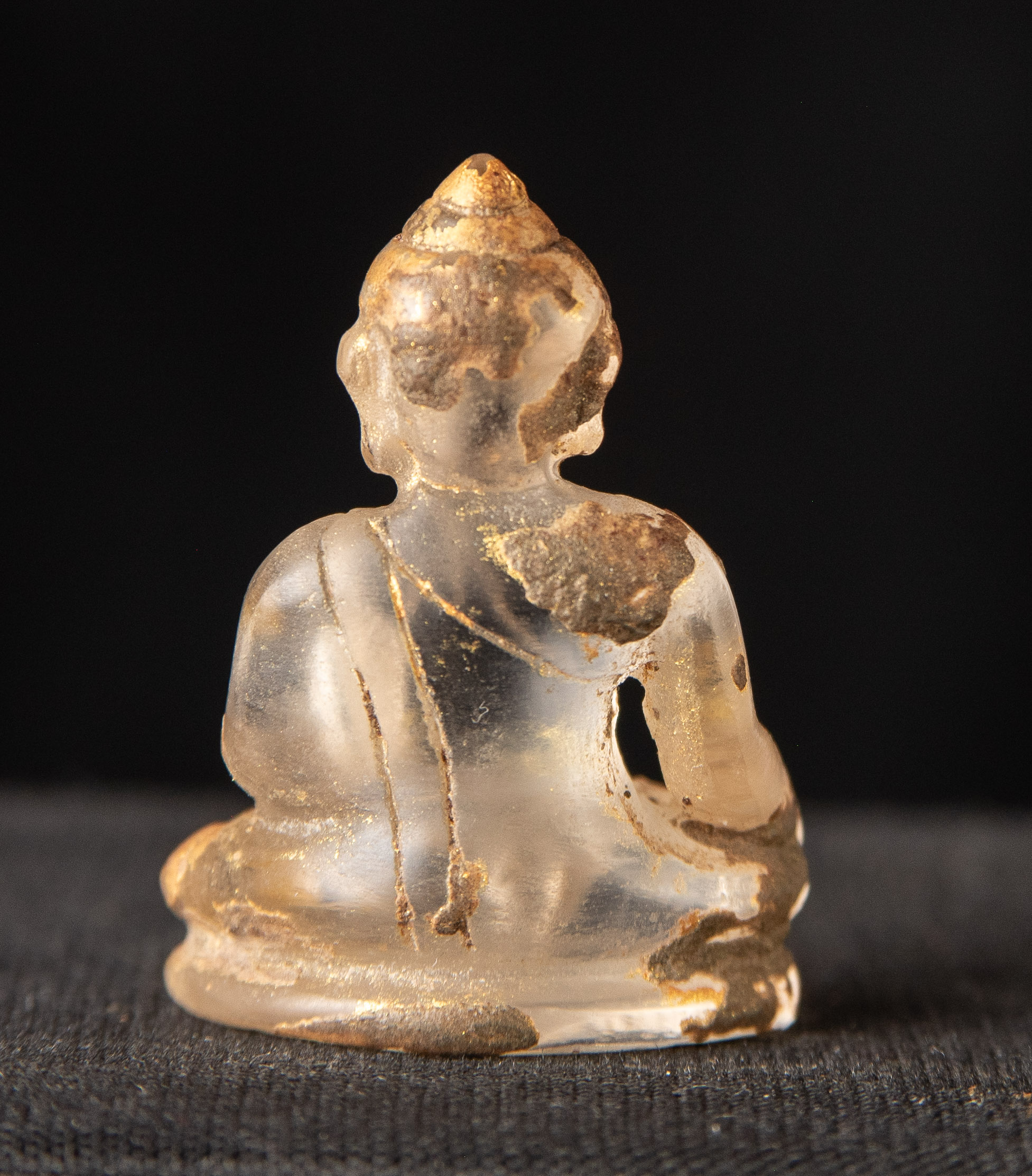 Very small 15/16 century Thai Crystal Buddha. It has a wonderfully complex burial patina, which helps verify the significant age of the piece. I was tempted to try at remove more of the encrusted material so that the face and other details were more clear, but I knew it was better to leave it exactly as found. Take a look at the photos, they tell the story. I’ve never had an authentic crystal Buddha quite this small as they are extremely hard to carve in this size, especially at that time with the tools they had available. (1.375"H x 1"W X .5"D) - 35g.