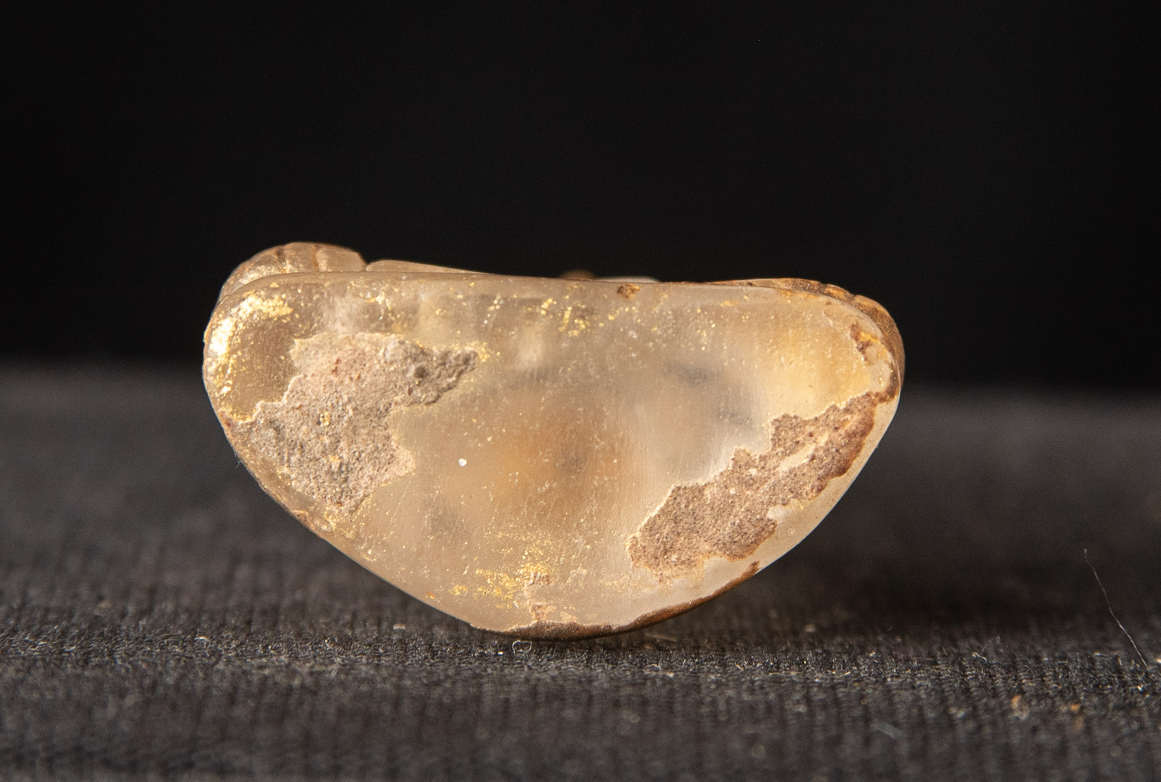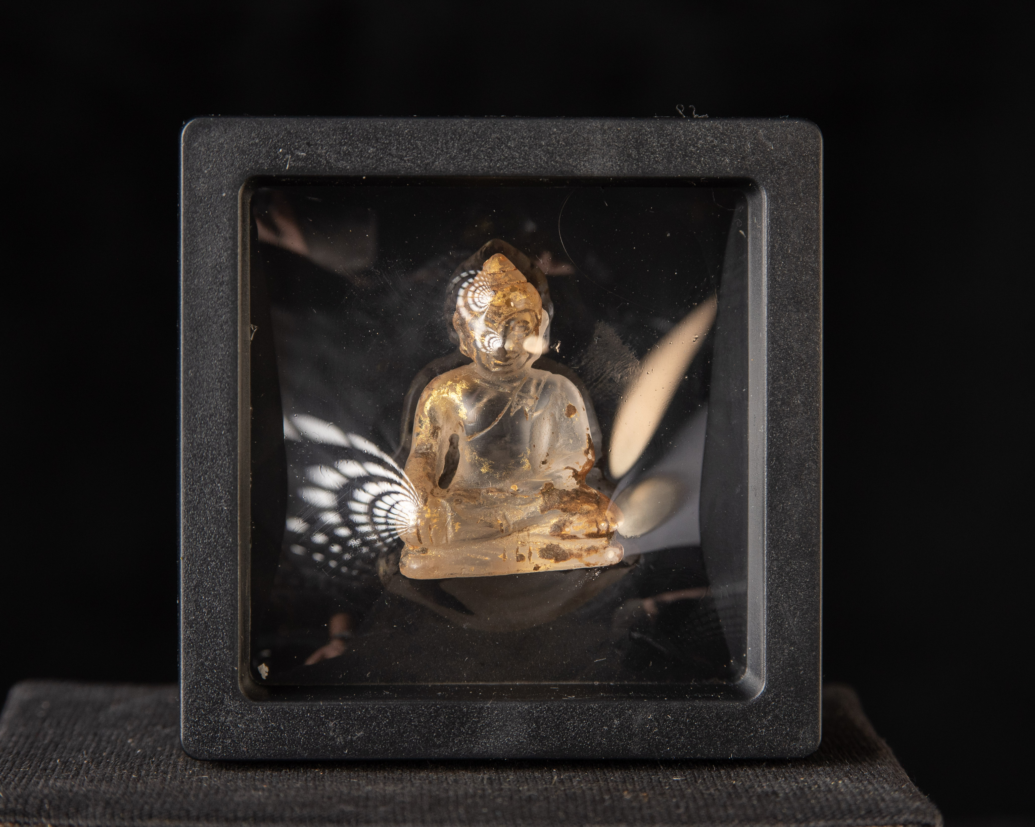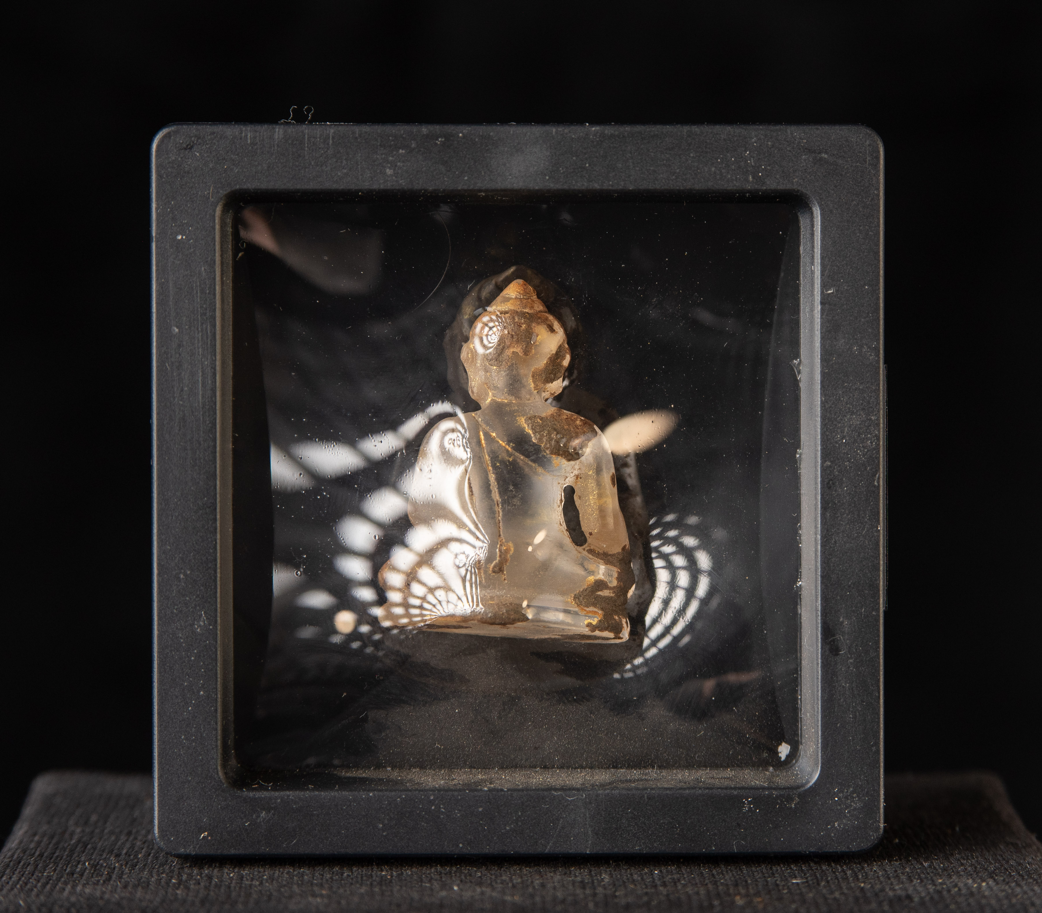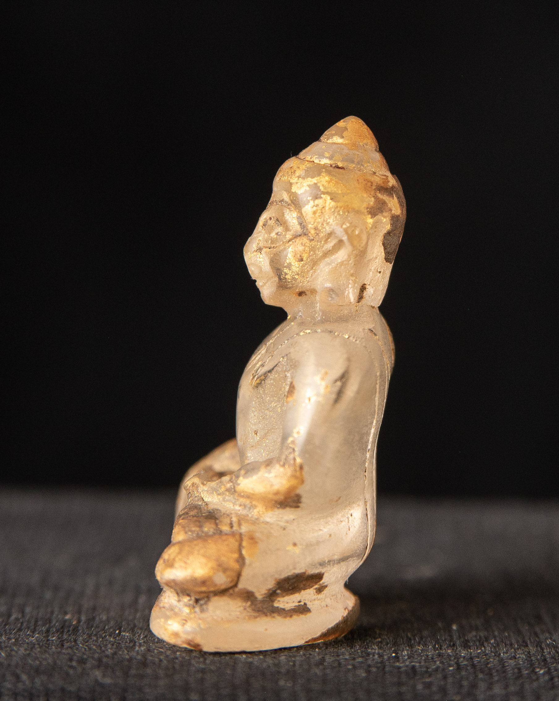 Very small 15/16 century Thai Crystal Buddha. It has a wonderfully complex burial patina, which helps verify the significant age of the piece. I was tempted to try at remove more of the encrusted material so that the face and other details were more clear, but I knew it was better to leave it exactly as found. Take a look at the photos, they tell the story. I’ve never had an authentic crystal Buddha quite this small as they are extremely hard to carve in this size, especially at that time with the tools they had available. (1.375"H x 1"W X .5"D) - 35g.