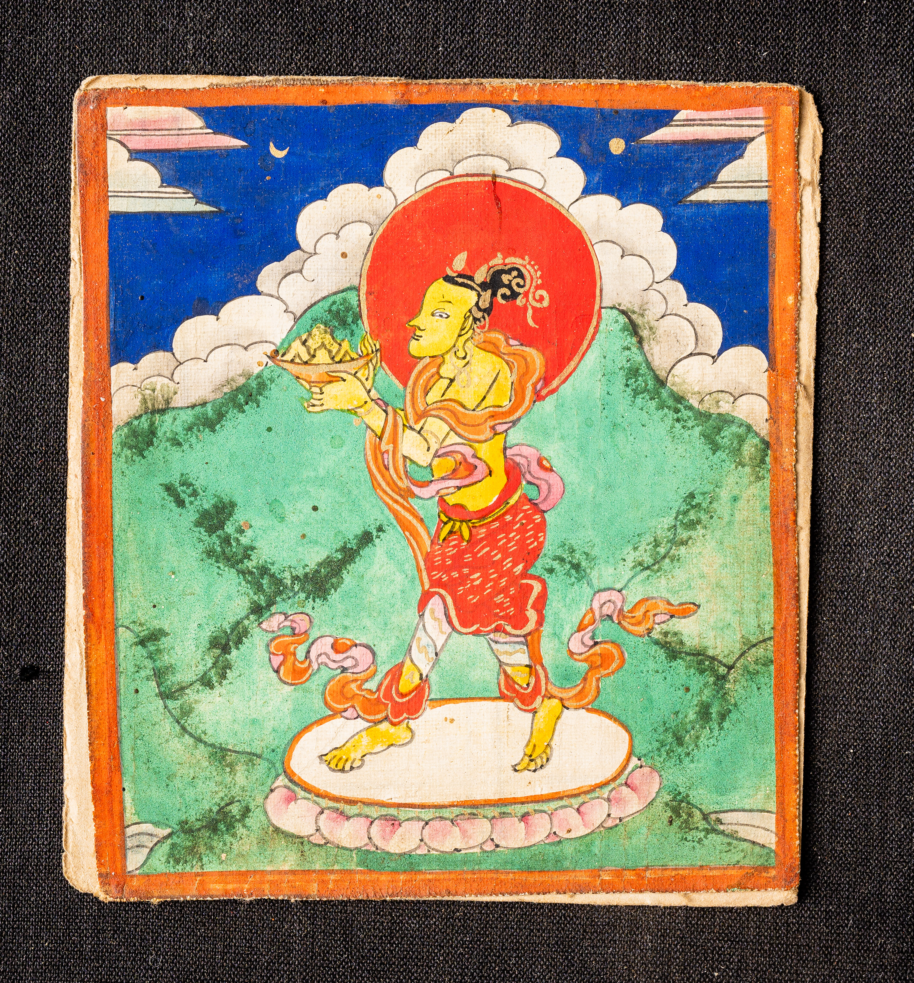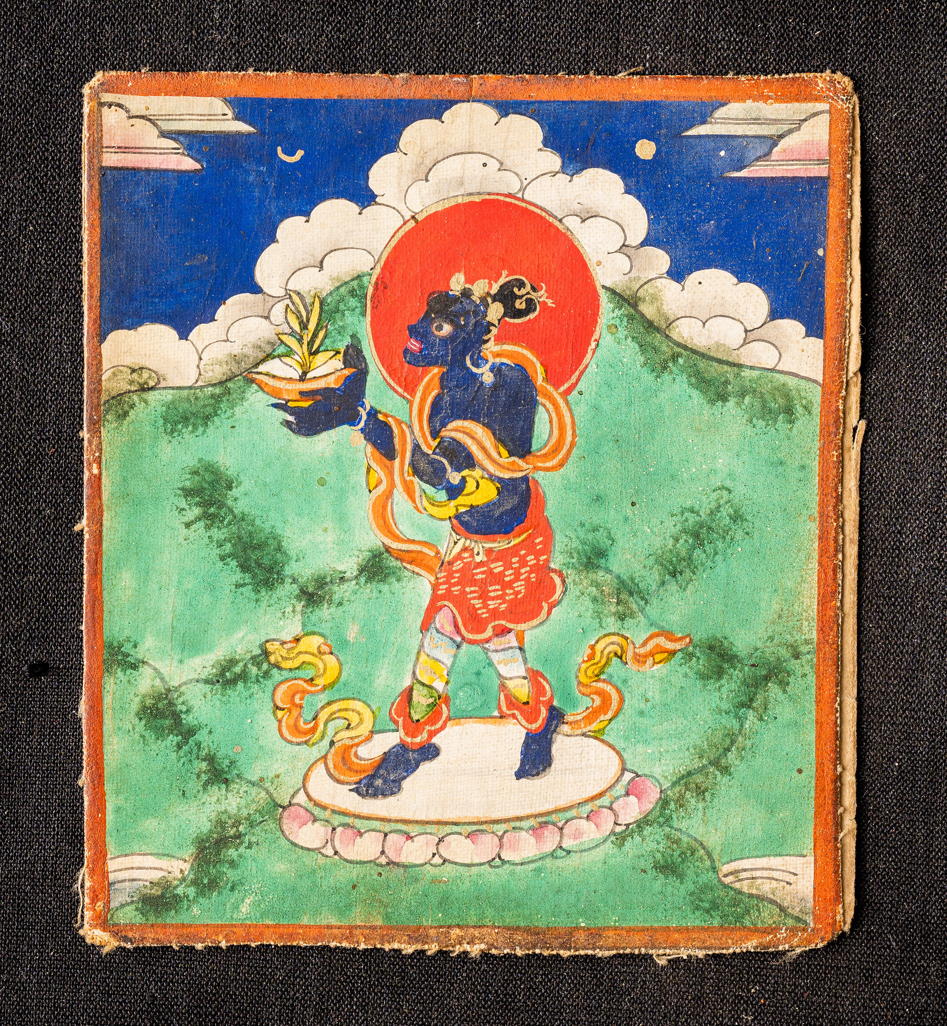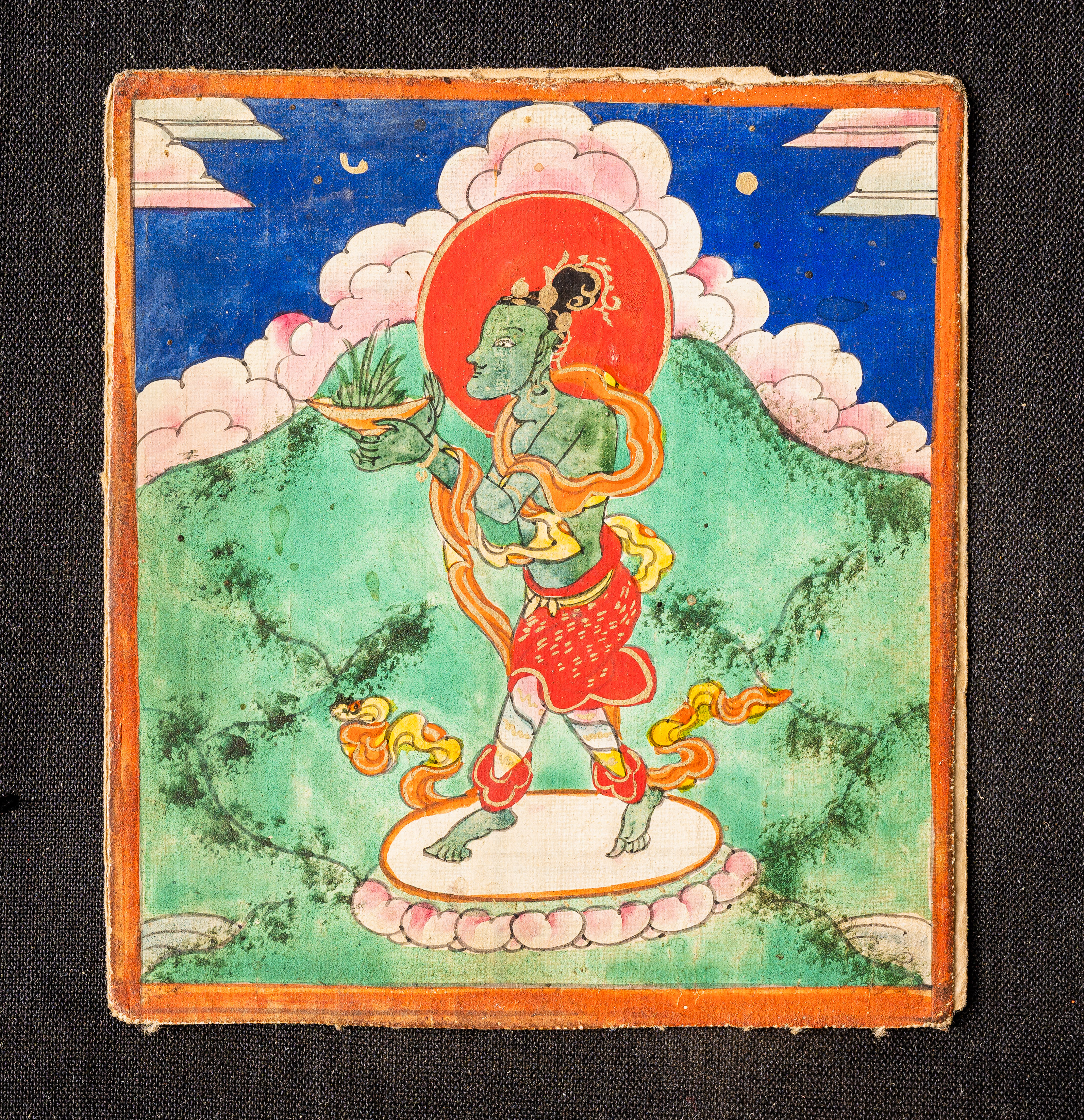 19th to early 20th century Mongolian Buddhist paintings/training cards for teaching monks and others about different aspects of Buddhist teachings. These have writing on the back along with a second sheet attached with additional Mongolian or Tibetan writing. This is an uncommon set in both subject and quality. Collected 40 years ago when Mongolia was opening to the west and it was possible to find sets like this. They are part of a group of Mongolian Buddhist Traing cards and small Thangkas I collected in the late 1980s and early 1990s as part of my personal collection. I had thought I had put my entire collection up for sale to the Buddha gallery website and into my recent auctions, but I recently discovered a group of more than 50 items that I had put away for safekeeping and then lost track of - they will now all go up for sale. The colors are bright and clean, which means these were probably locked away for much of their life as they are typically soiled and darkened by use and time. The priceis for the entire group of eight. ( 4"H x 3.5"W ) x 8