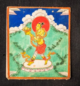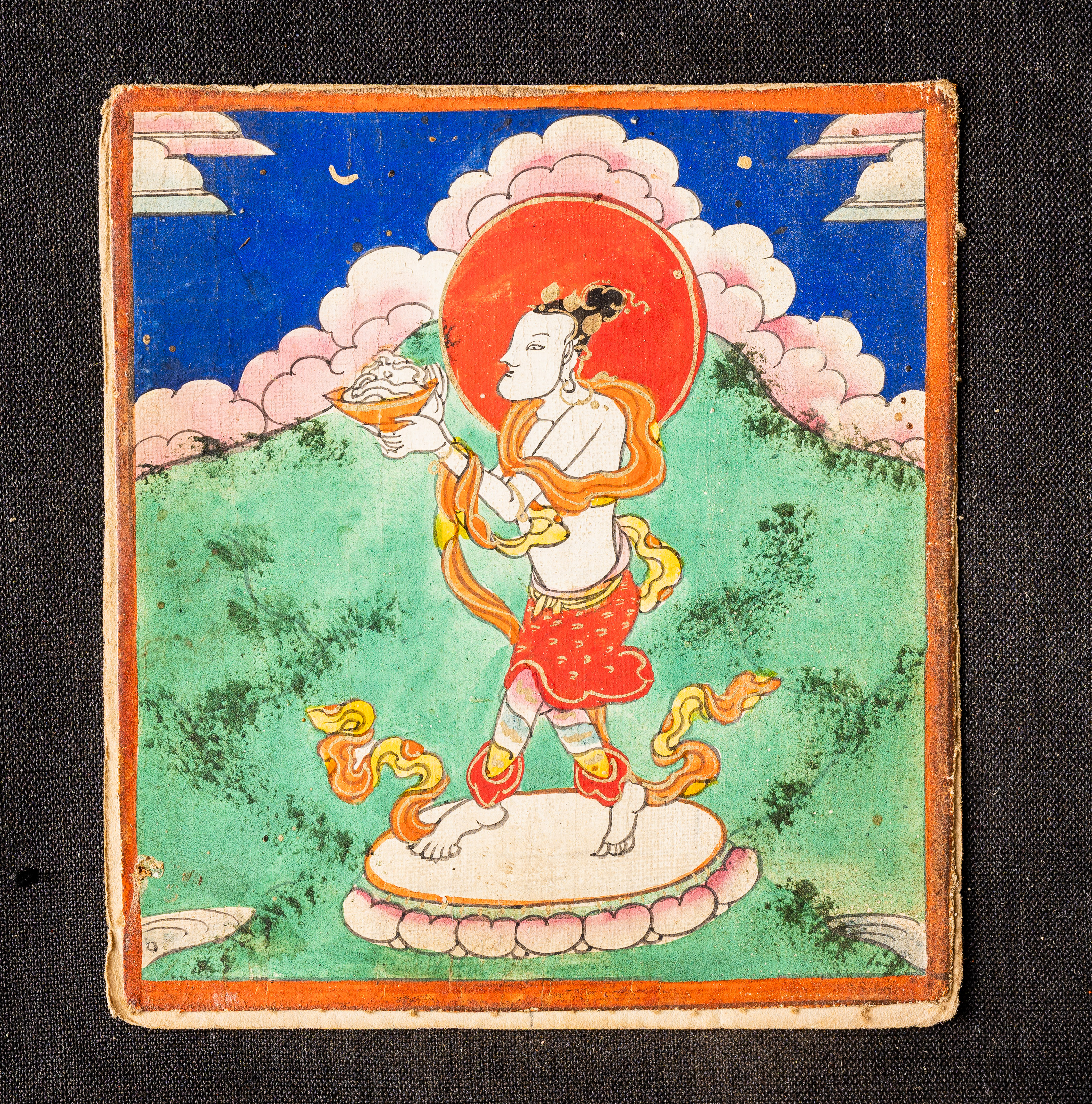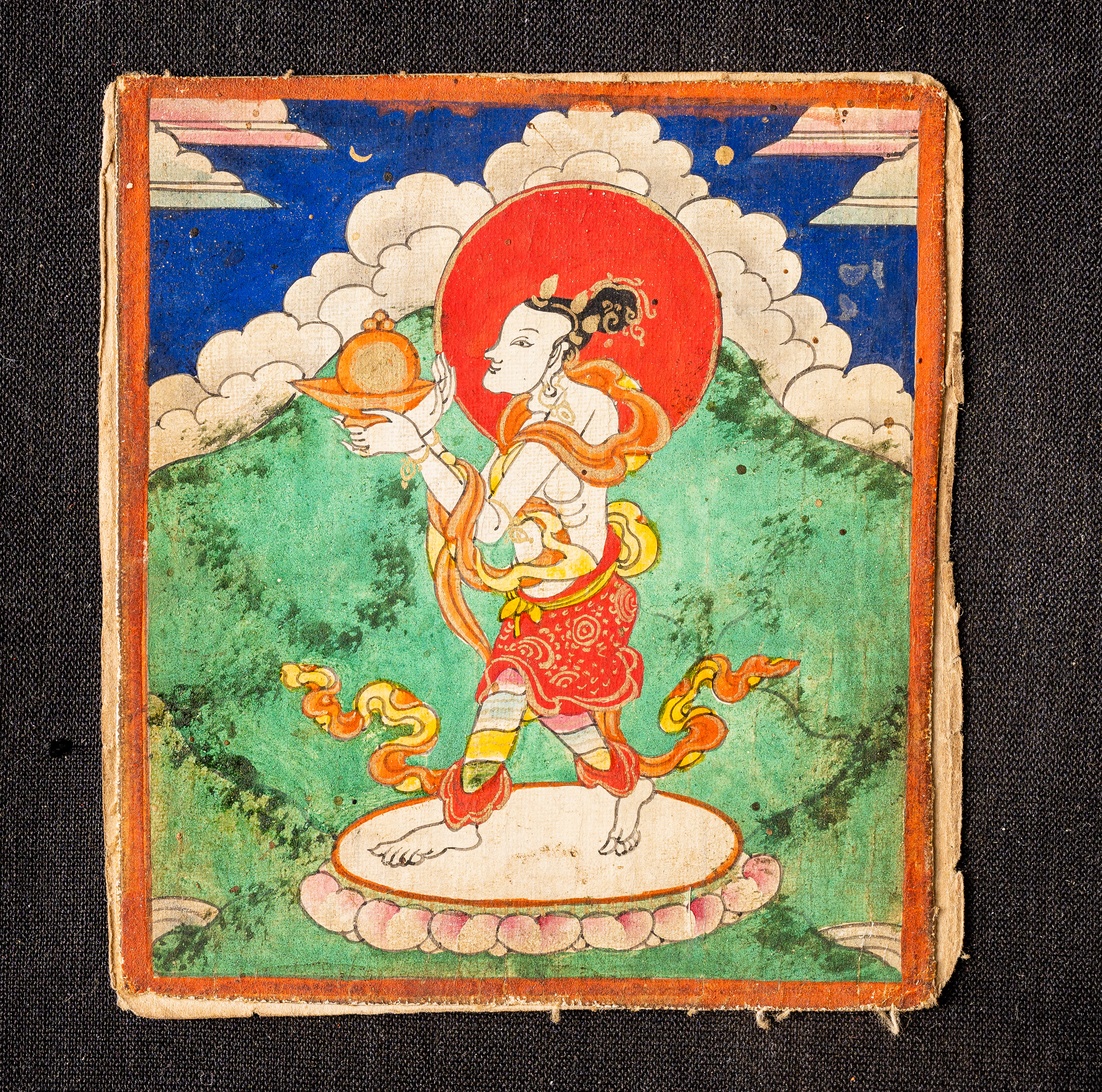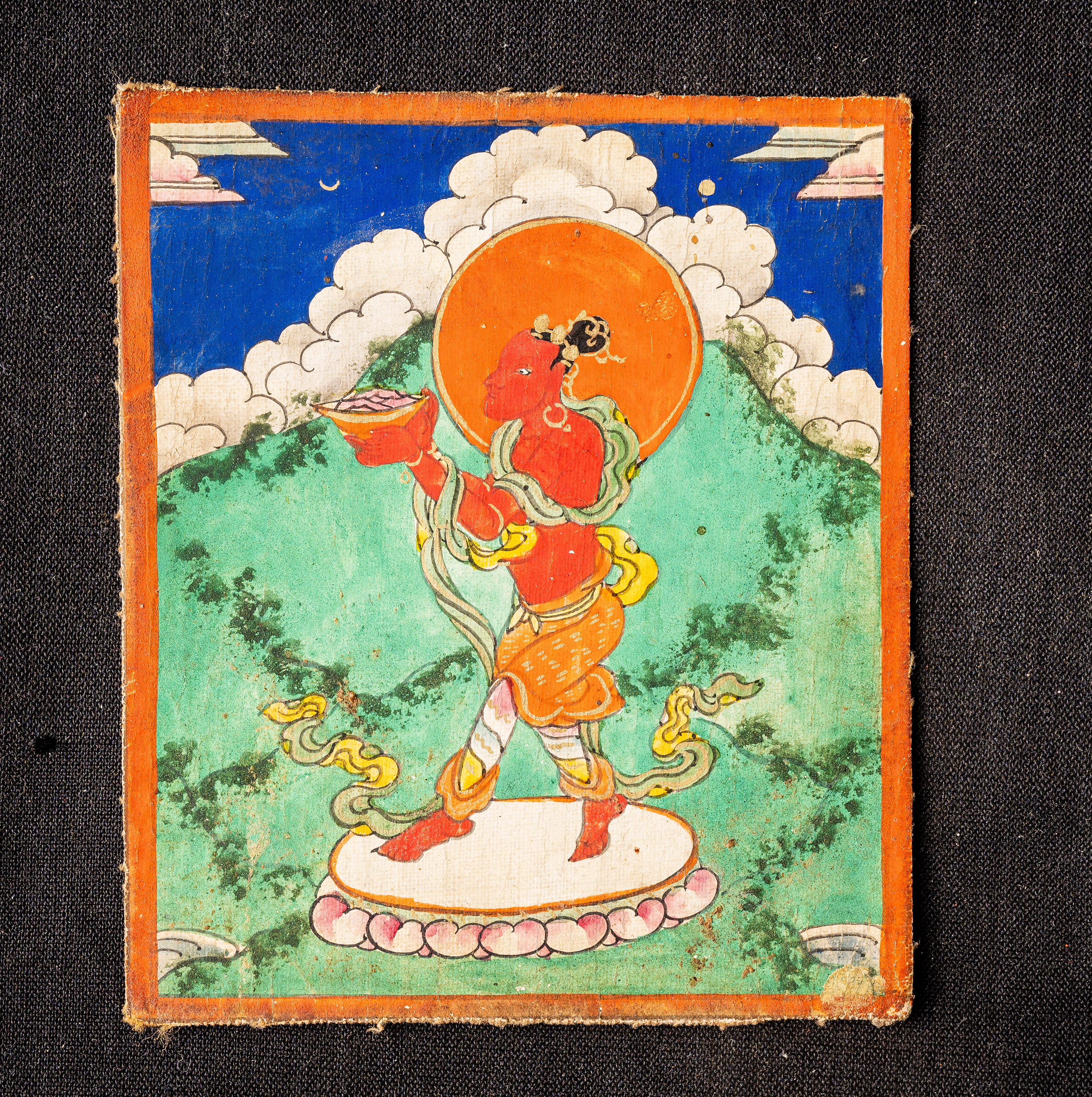 19th to early 20th century Mongolian Buddhist paintings/training cards for teaching monks and others about different aspects of Buddhist teachings. These have writing on the back along with a second sheet attached with additional Mongolian or Tibetan writing. This is an uncommon set in both subject and quality. Collected 40 years ago when Mongolia was opening to the west and it was possible to find sets like this. They are part of a group of Mongolian Buddhist Traing cards and small Thangkas I collected in the late 1980s and early 1990s as part of my personal collection. I had thought I had put my entire collection up for sale to the Buddha gallery website and into my recent auctions, but I recently discovered a group of more than 50 items that I had put away for safekeeping and then lost track of - they will now all go up for sale. The colors are bright and clean, which means these were probably locked away for much of their life as they are typically soiled and darkened by use and time. The priceis for the entire group of eight. ( 4"H x 3.5"W ) x 8