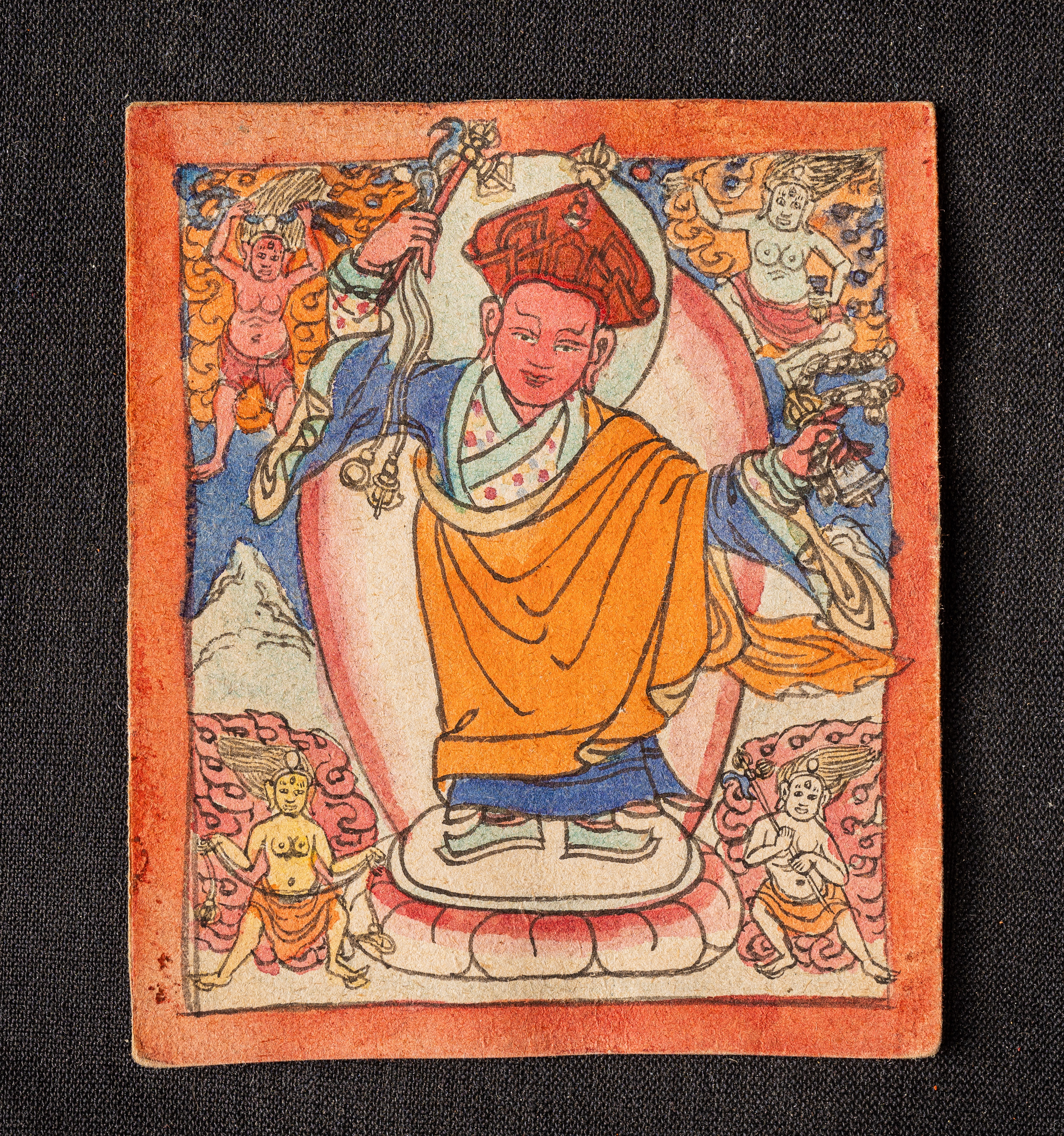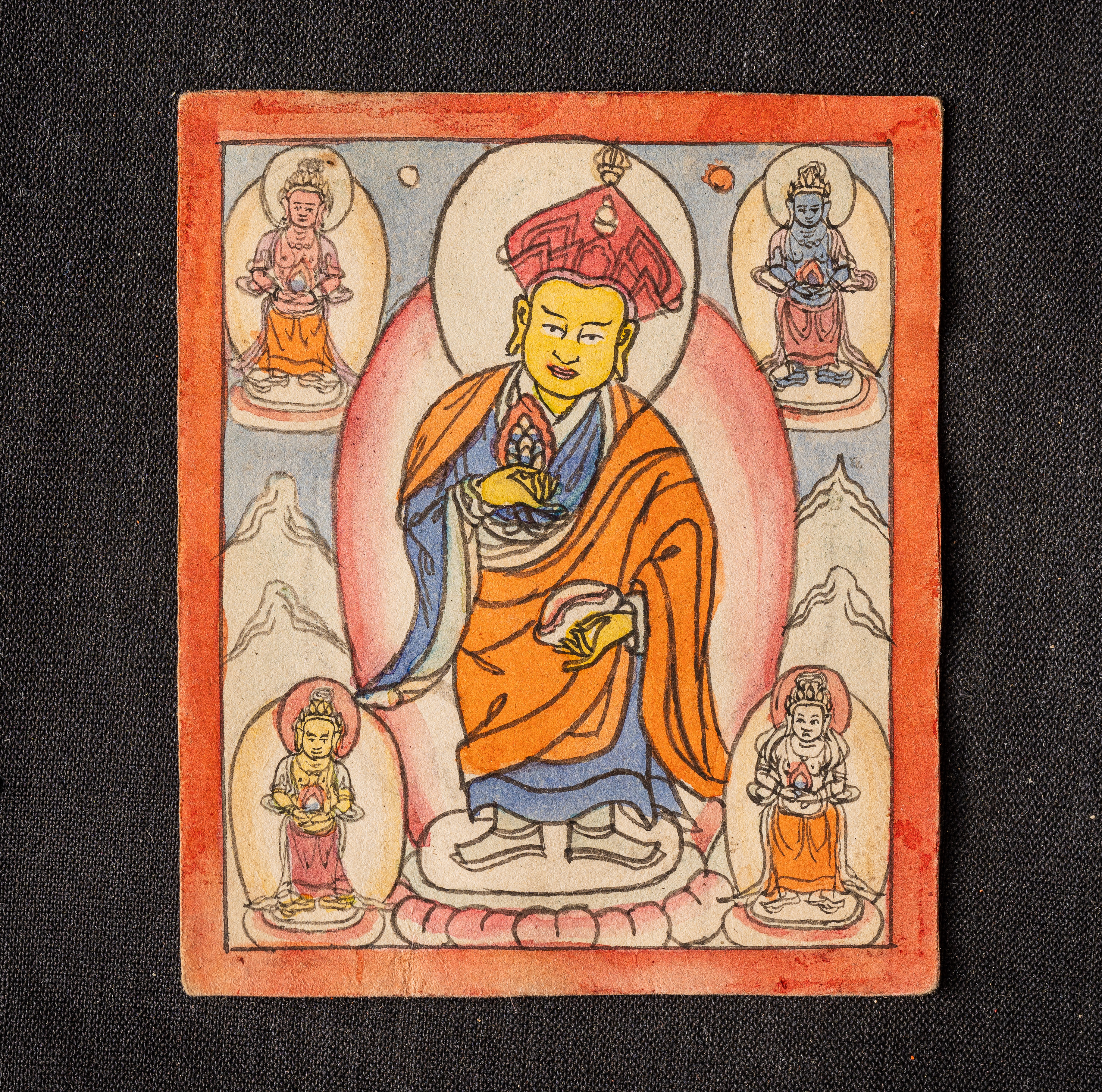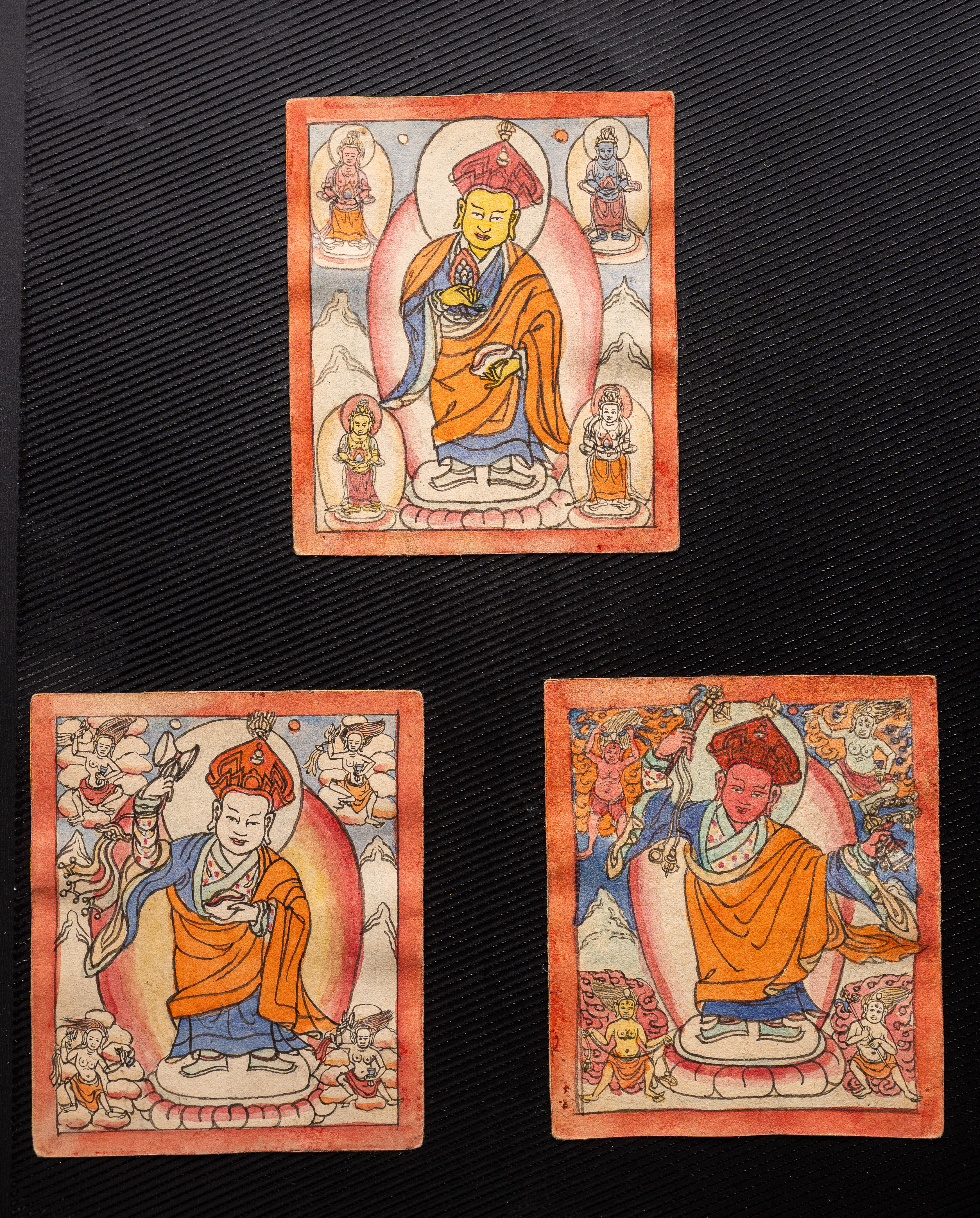 Early 20th century Mongolian Buddhist paintings of Monks holding implements in their hands, with small figures in each of the corners. There is writing on the back, which probably gives the name of who this figure represents. This is for three of a larger group, I’m not sure how many would’ve been in this set, but it was probably pretty large. Collected 40 years ago when Mongolia was opening to the west and it was possible to find sets like this. They were used to teach young monks about different aspects of Buddhism and Buddhist knowledge. They are part of a group of Mongolian Buddhist Training cards and small Thangkas I collected in the late 1980s and early 1990s as part of my personal collection. I had thought I had put my entire collection up for sale to the Buddha gallery website and into my recent auctions, but I recently discovered a group of more than 50 items that I had put away for safekeeping and then lost track of - they will now all go up for sale. (The price is for a group of 3. ( 3"H x 3.5"W )