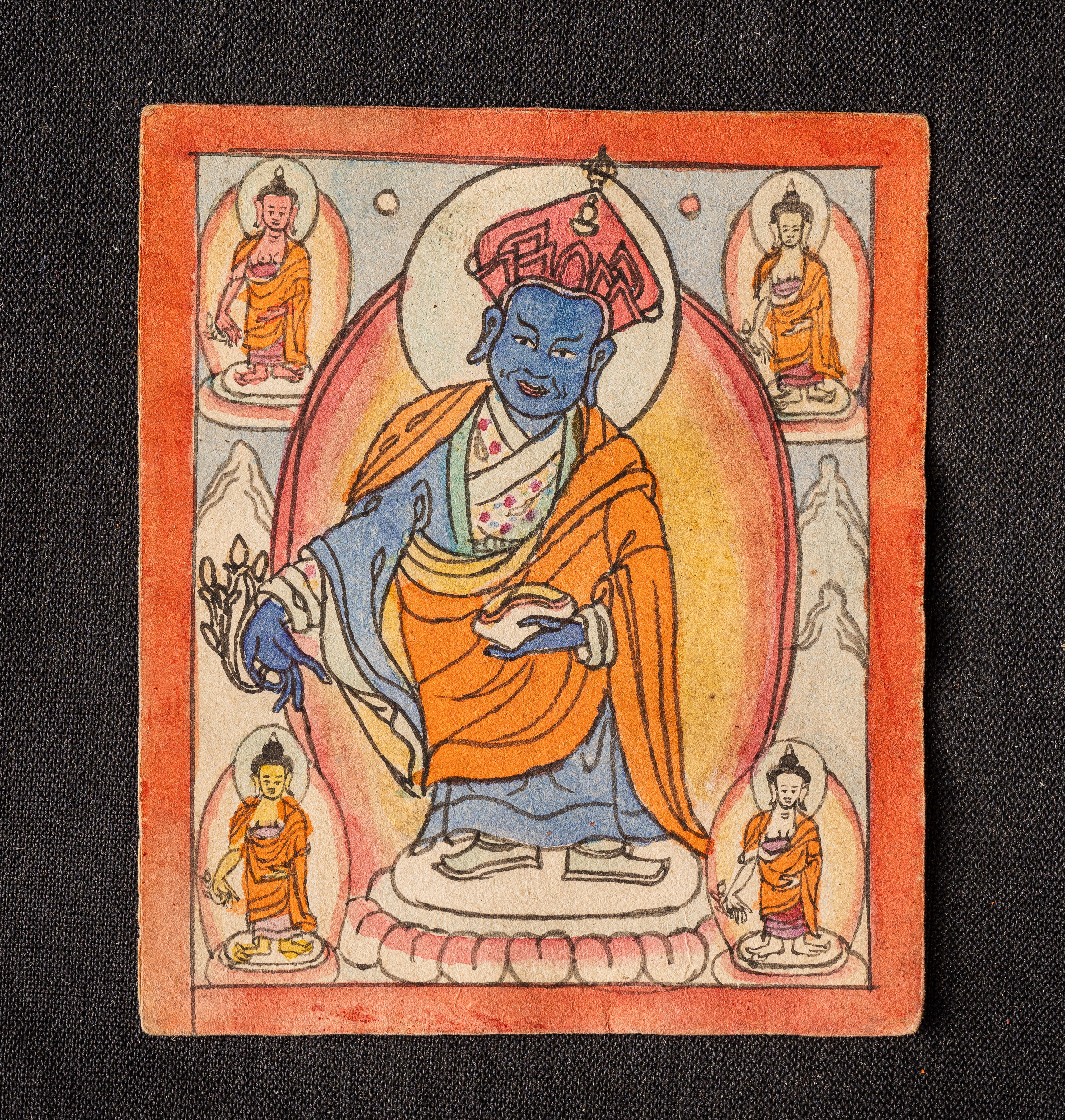 Early 20th century Mongolian a Buddhist paintings of a Monk holding implements in his hands, with small figures in each of the corners. There is writing on the back, which probably gives the name of who this figure represents. This, I’m not sure how many would’ve been in this set, but it was probably pretty large. Collected 40 years ago when Mongolia was opening to the west and it was possible to find sets like this. They were used to teach young monks about different aspects of Buddhism and Buddhist knowledge. They are part of a group of Mongolian Buddhist Training cards and small Thangkas I collected in the late 1980s and early 1990s as part of my personal collection. I had thought I had put my entire collection up for sale to the Buddha gallery website and into my recent auctions, but I recently discovered a group of more than 50 items that I had put away for safekeeping and then lost track of - they will now all go up for sale. The price is for one. ( 3.5"H x 3"W )