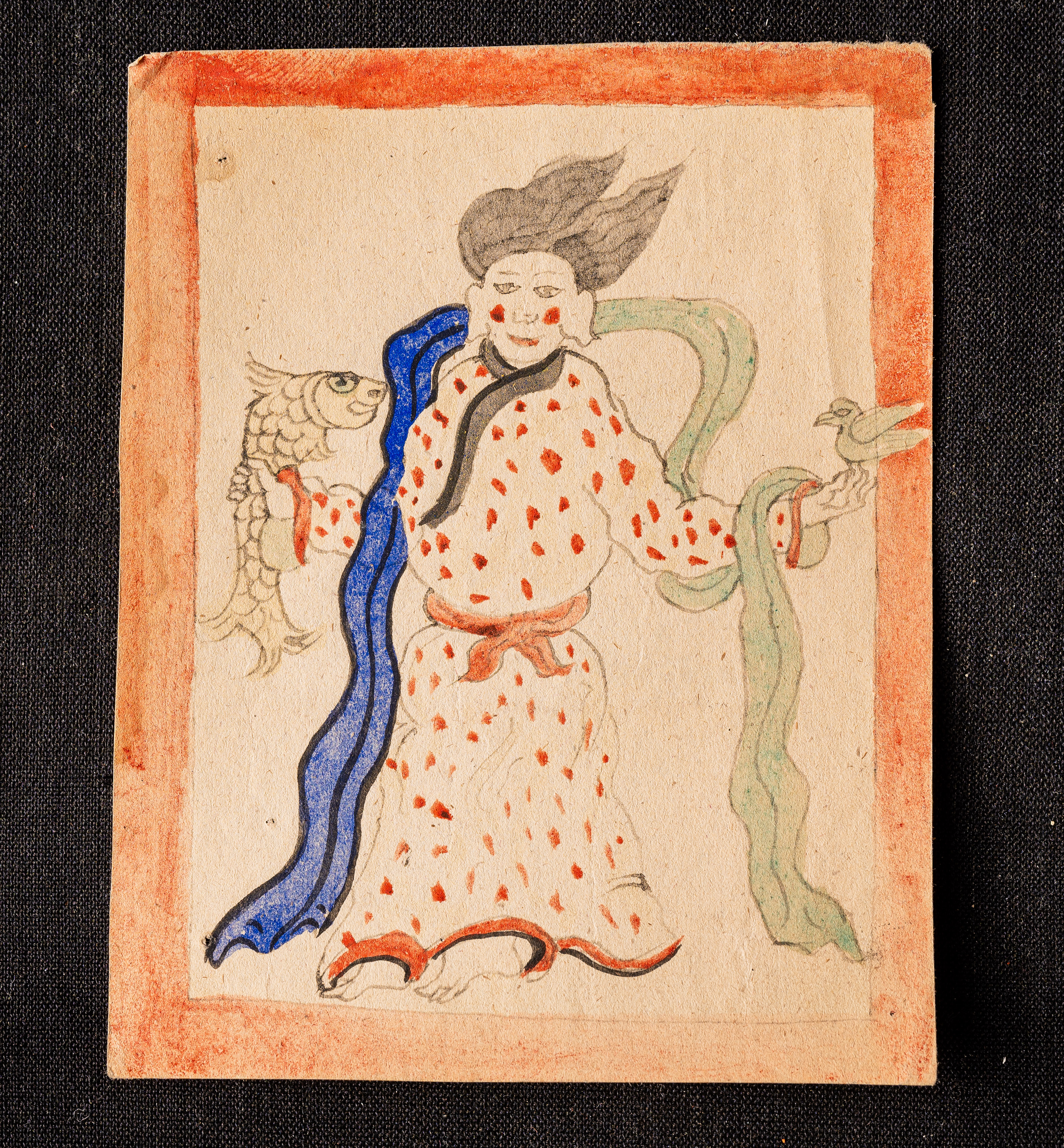 19th to early 20th century Miniature Mongolian Buddhist painting of Folk a Figure. It has writing on the back, which appears to be the name of the figure on the front. I don’t know who it is supposed to represent. Collected 40 years ago when Mongolia was opening to the west and it was possible to find sets like this. They are part of a group of Mongolian Buddhist Training cards and small Thangkas and paintingsI collected in the late 1980s and early 1990s as part of my personal collection. I had thought I had put my entire collection up for sale to the Buddha gallery website and into my recent auctions, but I recently discovered a group of more than 50 items that I had put away for safekeeping and then lost track of - they will now all go up for sale. (The price is for 1 ( 4.25"H x 3.25"W ) x 1