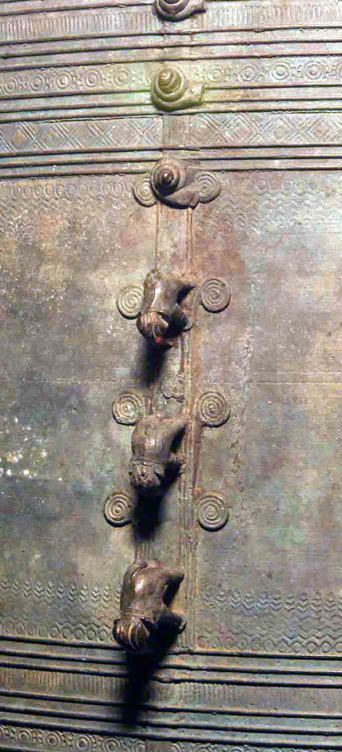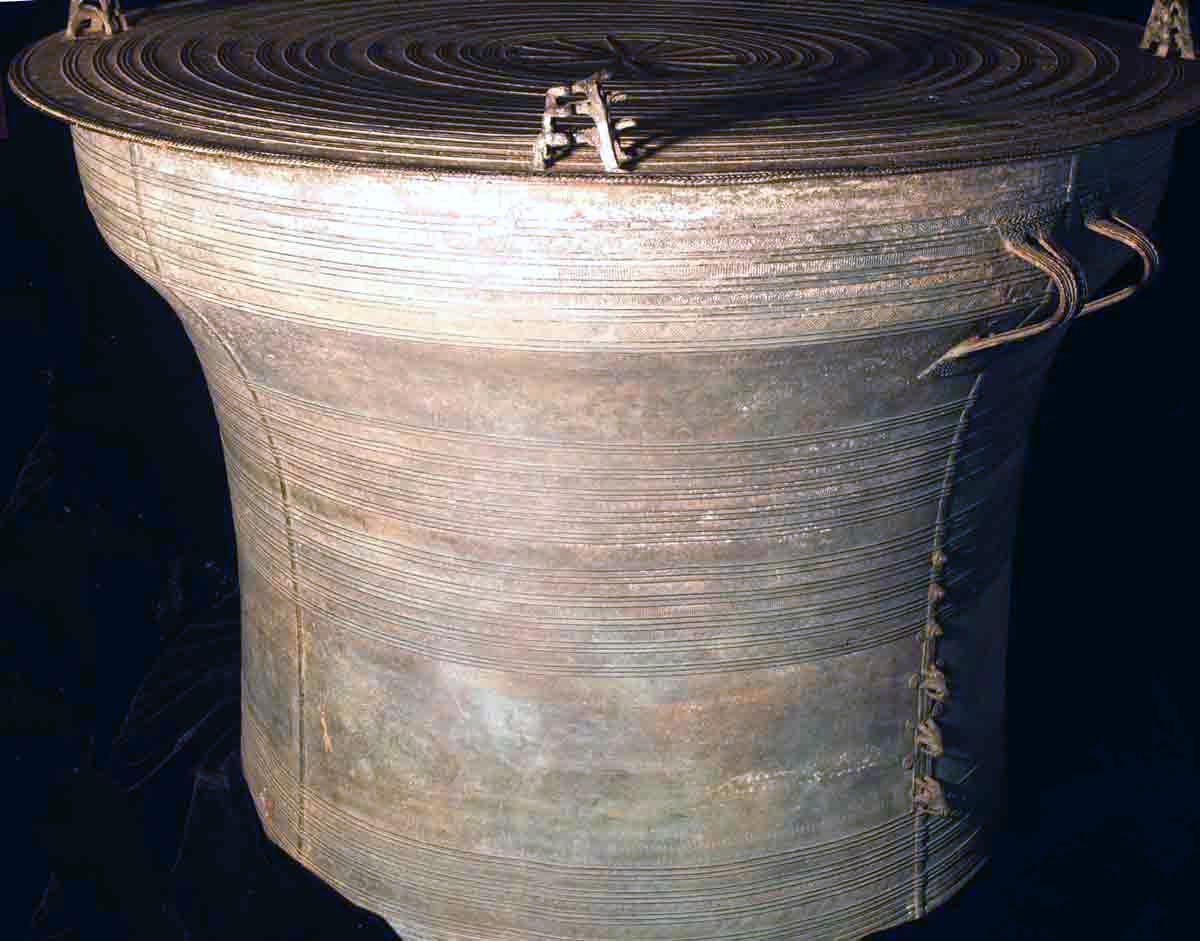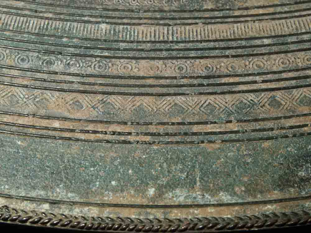This is an authentic bronze Burmese Rain Drum, probably from the 18th century. It is part of a group of 8 drums which I bought as a group from a large estate about a year ago. They were collected in 1972 by an American in Air America (CIA) who was based in eastern Thailand. As per his relative who was dispersing the estate, he bought the group of drums in Luang Prabang (Laos) as he flew Americans in and out of Laos. Research has determined that these drums have been made for hundreds of years (perhaps most of a millennium) by the Karen people. They are primarily made in Burma, and even the ones which have long been in Laos and Thailand are old imports from Karen groups in Burma. Seven of the drums I have are this type, either single frog or triple frogs on top. They vary in what they have on the sides- some are quite fancy and some are plain. The finest one has small perfect lizards encircling the entire bottom of the drum, and has magnificent metal work on the side. It is the finest 19th century Karen drum I have ever seen anywhere. The collection also included one Han drum originating from southern China (Yunnan) dating from 200 b.c. to 200 a.d . This drum is quite valuable, and rare to find in complete condition. I’ll be listing a few on my website- I am open to selling the entire collection for the right price. This one is 19 by 26 inches. It is one of the best in the collection and is quite rare in that it has 3 snails and 3 elephants climbing up the side. It has a 12 pointed star in the middle, and all of the detail typically found on an authentic drum. Guaranteed to be authentic. There is a vast difference between these drums and the copies (even the wax cast ones) on the market. This should be crated and trucked to be safe, which will cost extra. Please do not confuse this with the copies, or the later simple drums. The authentic old high quality ones are rare, valuable, and qualitatively different- look at the photos.