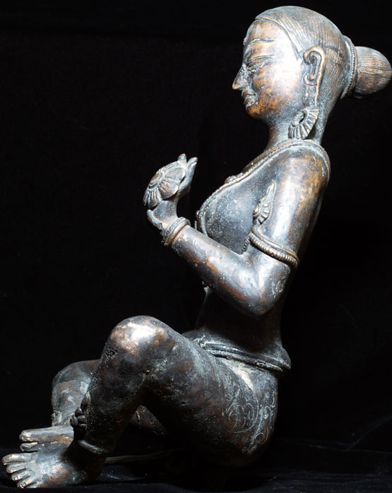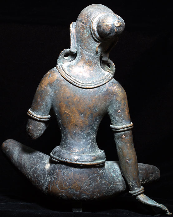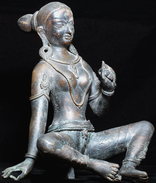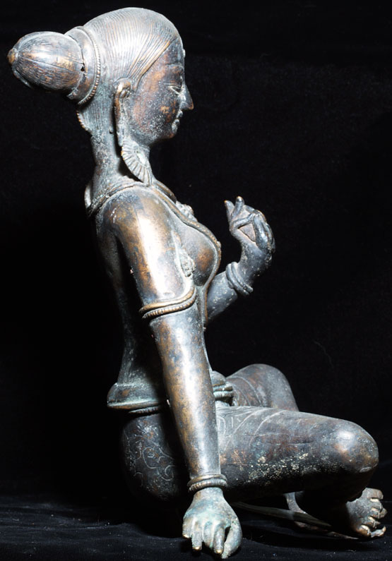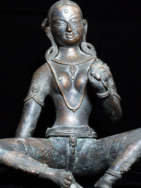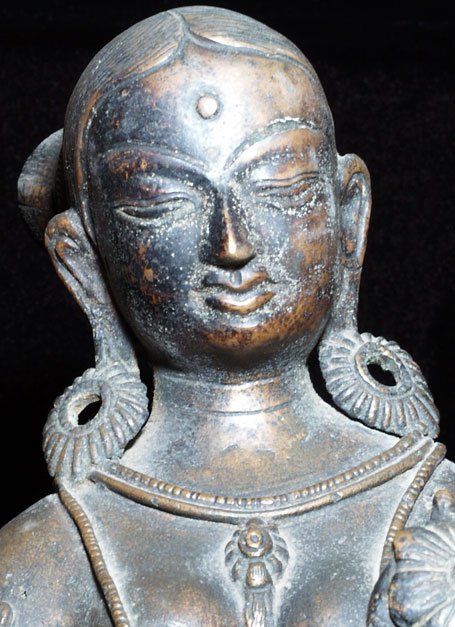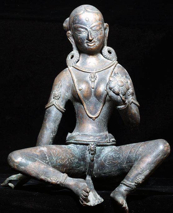 This is a delightful 18/19thc. bronze Nepalese Tara. Cast in two parts at the waist-Ten inches tall by 8 inches wide, but the figure is much large than the dimensions convey as there is no base of any kind. It has a small plinth sticking out of the back of the bottom, buch like the (related) Nepalese Indra I have in the "for sale" section under Nepalese Bodhisattvas on my website. It is 8.5 inches tall by 7.5 inches wide An excellent example.