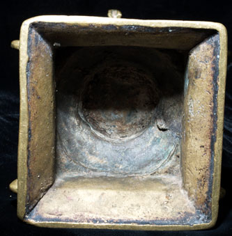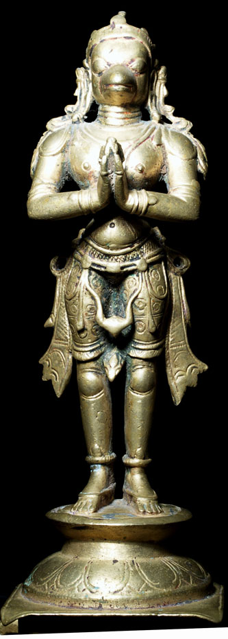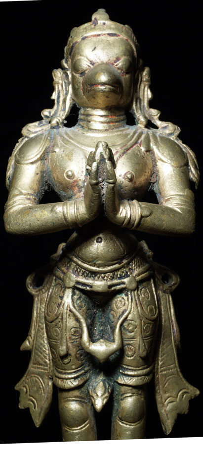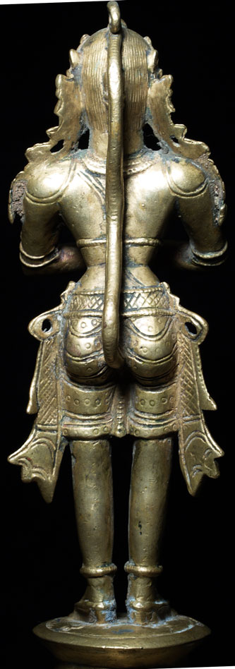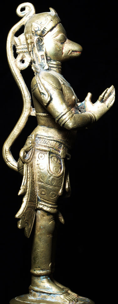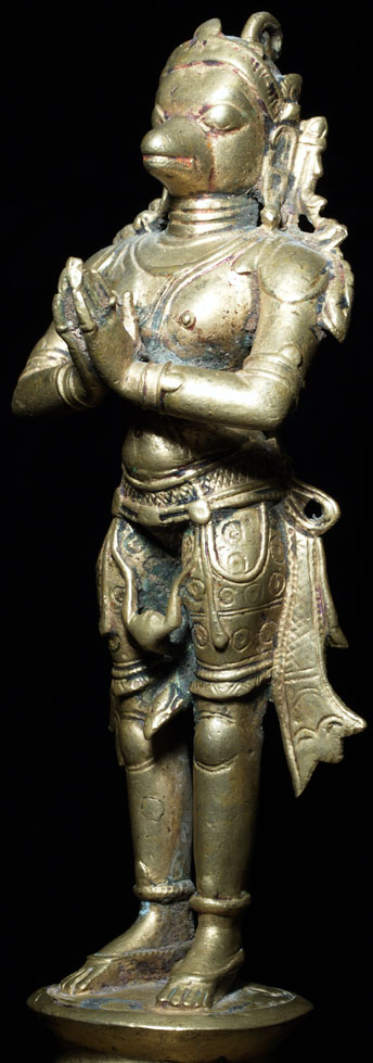 This is a special Hanuman, in the range of 250 to 300 years old. He is in deep concentration, well on his way to enlightenment. This form of Hanuman embodies the spirit of service and devotion- he is the, other than the basic Buddha form, my favorite of all Hindu and Buddhist figures. He is quite large at 10 inches tall including the separately cast base, which is now permanently attached. The figure is solid cast, and including the base weighs 46.3 ounces. He is large enough that he warrants having loops on the base to carry in festival processions. He is made of an alloy which doses not seen to darken- he is a beautiful golden color. Traces of old red devotional powder. Out of an extensive German collection, and has been in my personal collection.