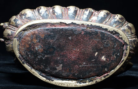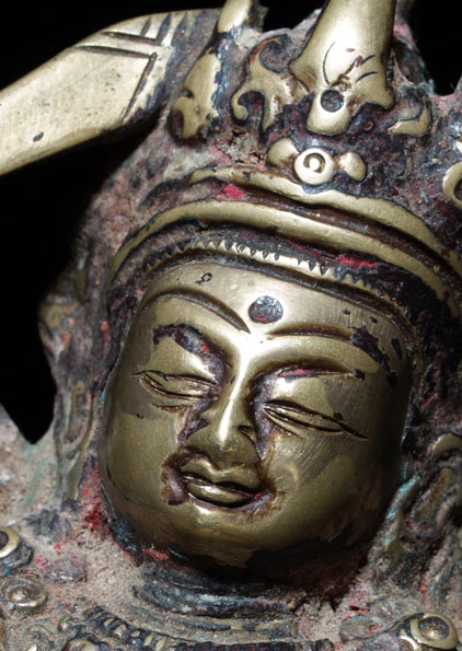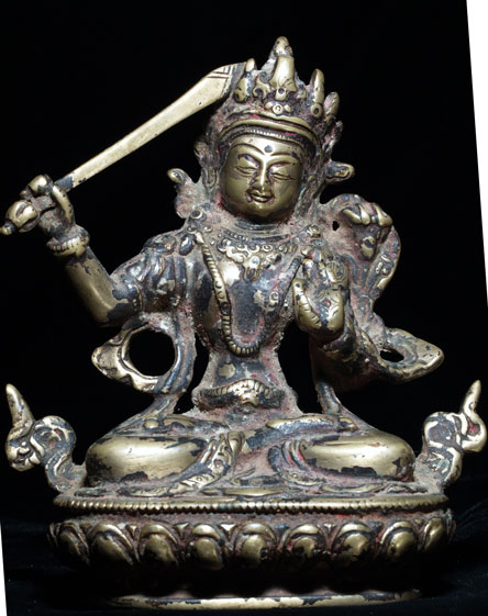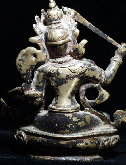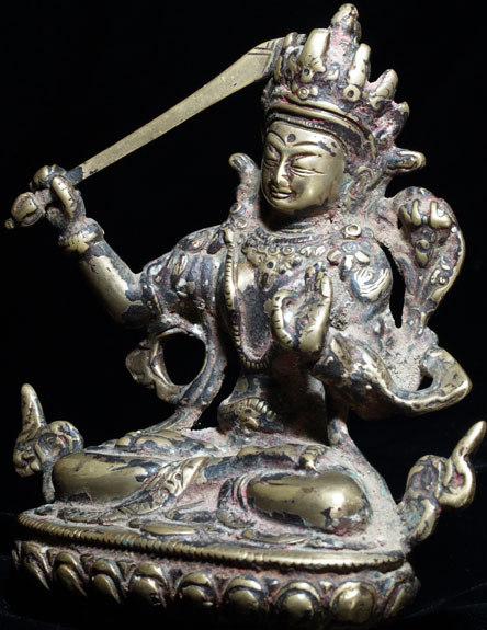 This is a lovely and authentic 18/19th century Nepalese Bodhisattva- Manjushri, who cuts through ignorance and ignorance and the things which get in the way of seeing clearly. . There are remains of red devotional powder. The piece has been cleaned, as it was probably thick with gunk and devotional powder to the point where the details were obscured. Complete, with no damage or losses (many old Manjushri are missing their swords or have them repaired)I purchased this from a gentleman who lived in Nepal with his wife, where they worked on blindness prevention projects. It has a very strong spiritual feeling to it. He sits 5.5 inches tall.