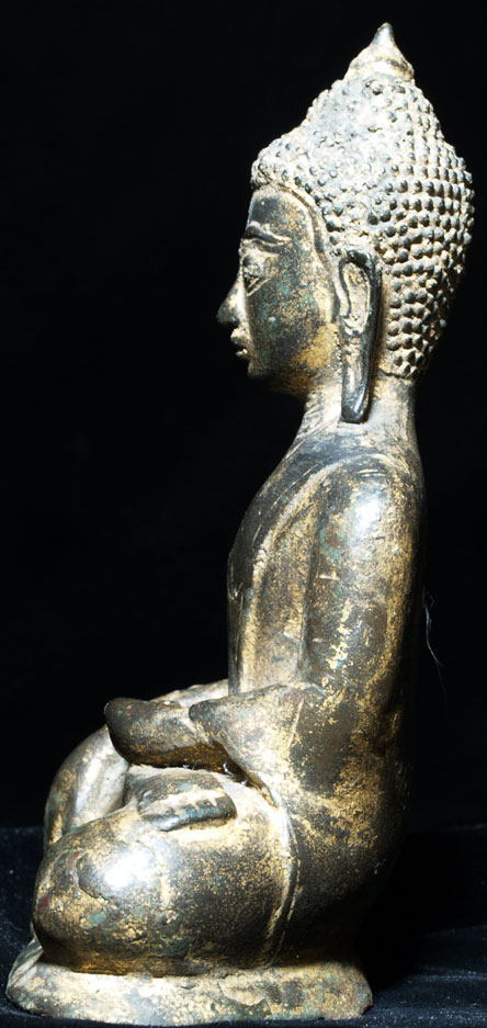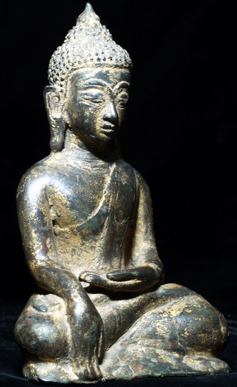 Very uncommon Buddha- it looks to be a Northern Thai with strong Late Ava Burmese influence. The casting, hands mouth, alloy used, and some other elements are Thai, and the ears, wide sash, and legs are Burmese. The finial is somewhere in between. There were many times that the Burmese made incursions in to Thailand, one of the most notable was when they sacked Ayuthaya in 1767. My feeling is that this piece is from that period. It looks to have had a base which was removed for some reason. Remains of gilding, probably not original. Fascinating piece 5 inches tall.