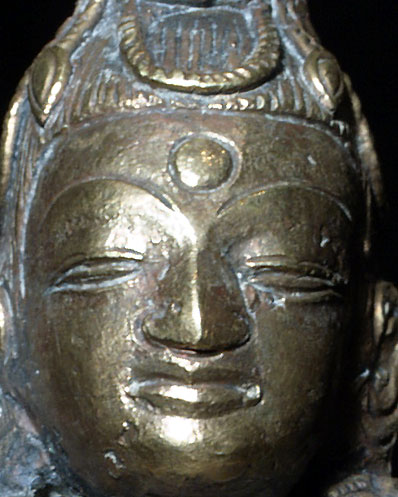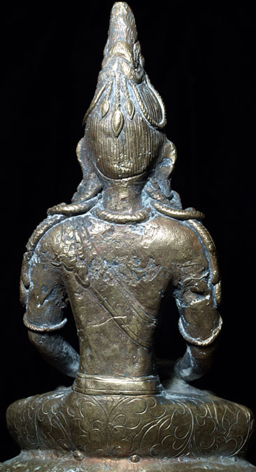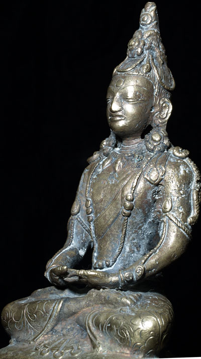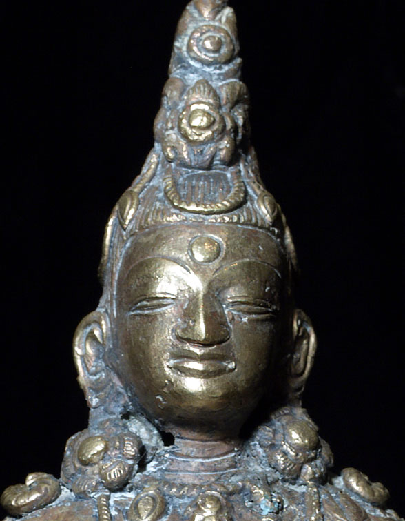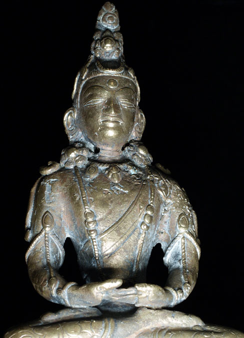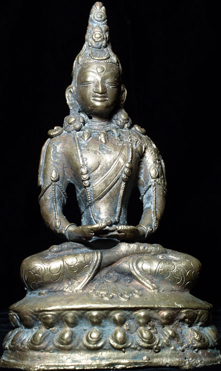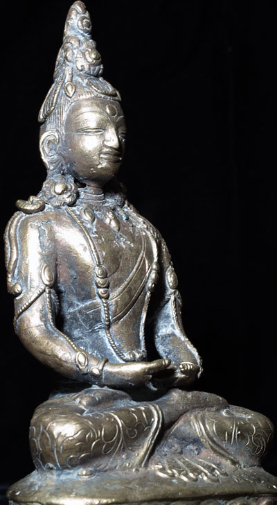 This is an 18th century Brass or Bronze alloy of “Amateyus”, or Bodhisattva of Long Life. He is either from Tibet or Mongolia. His form is classic 18th century Tibet. The reason I think that he may be from Mongolia is because while Mongolian tended to closely follow their Tibetan counterparts, they sometimes used unconventional alloys and casting techniques. They also seemed to have a special feel to the expressiveness to the face which was different from Tibetan examples. This piece is fascinating in that it is both refined and provincial at the same time. When you look closely, the surface is not smooth, and there are some casting flaws, as can be seen in the photos. At the same time, when you step back and look at the overall figure, it is a remarkably successful and beautiful sculpture, with fine form and balance. There is oxidation as seen in the photos, which adds to his complexity and shows his 200+ year age. He was never gilded. He has a superb face, and a gentle, loving presence typically found only in high quality sculpture. . Sits 6 and 7/8 inches tall. Lovely!