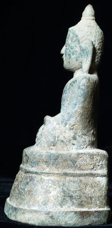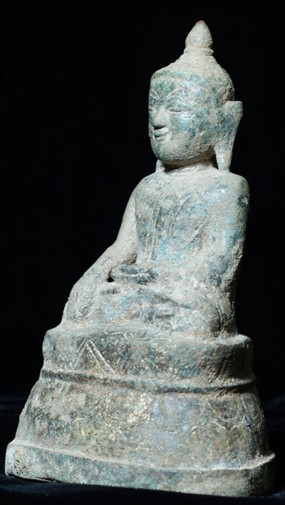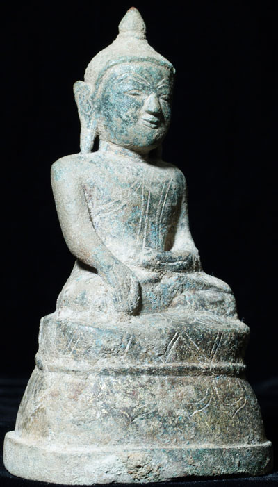 True Ava style bronze Buddha with a very sweet face. Sits 4.5 inches tall. Far rarer than Shan or Mandalay styles typically seen for sale. At their best (as with this one) Ava Buddhas have round, sweet child-like faces unlike any other style of Buddha. You can also see echoes of Pagan influence in the face and profile, as this is the style which came immediately after the late Pagan style. Nice untouched green patina.