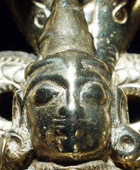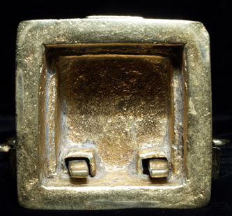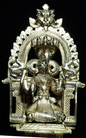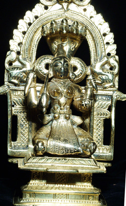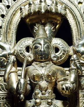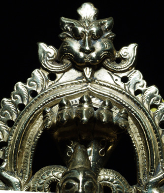 Three part Hindu shrine cast out of a remarkable allow which practically glows in the dark. I at first I had thought that this piece had been recently cleaned with brasso, or plated with something, but as I studied the underside and the wear patterns, I realized that it was simply cast out of an alloy which did not tarnish, and which had this incredible glow. Casting and wear suggest very good age. Excellent quality. Sits a full 7 inches tall. Hard to photograph in a way that fully captures the beauty.