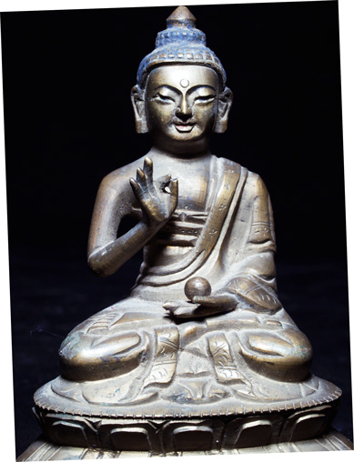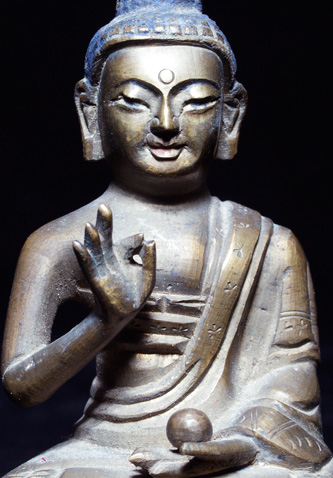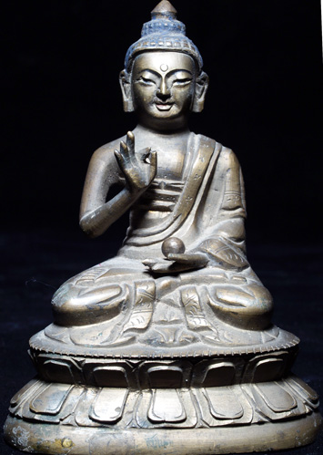 Very nice 19th Tibeto-Chinese Buddha. Sealed, with the look and "gunk" typically seen on pieces used by practioners (rather than a piece made to sell to the west). I do not have a photo of this. Very sweet face. Sits just under 4 inches tall. Good example of its type.