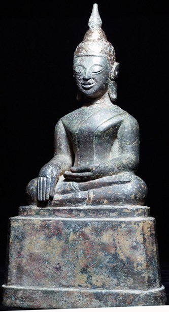 Very fine Laos Buddha made in a Royal foundry or other important place. The casting is superb, and the alloy used appears to have a significant amount of precious metal (probably silver and gold) in it- it is extremely heavy and has a special patina. The last owner unbelievably took off a gold cap or crown which had covered the head for 400 years and somehow lost it. You can still see traces of the almost pure gold on the top of the head. This is why there is no hair at all. I have never seen a Buddha made with a gold crown other than large ones in royal palaces, so I believe that this was made for someone or someplace very important. It sits close to 9 inches tall. One of a kind- a true collector’s piece