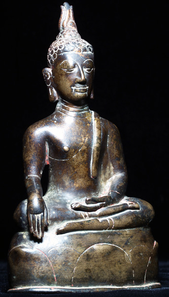 This is a fine and early Northern Thai “Lanna” style Buddha. It is probably 15th century, and is 16th century at the latest. The patina is superb, with a mirror like finish and a deep chocolate patina. There are traces of the original red lacquer and gilding which covered the entire piece evident in some of the crevices. He sits close to 5.5 inches tall. I used to buy this type of piece in Thailand- I could no longer buy this one for the price I am selling this one. The authentic ones of fine quality and condition are extremely hard to find and are highly valued