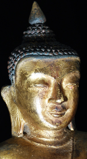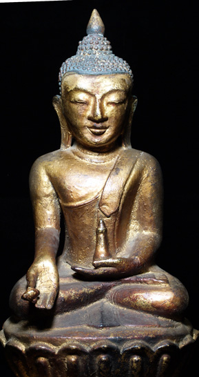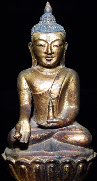 This is an authentic, large Arakan bronze Buddha from the 18t or 19th centuries. This style is related to the more common Shan style, but the casting and alloys are different, as are the face, the turned out hand, and the overall feel of the piece. Arakan is the part of Burma nearest to India, and it had had its own distinctive culture and art for millennia. The mountains which separate it from the rest of Burma have allowed it to have great kingdoms rise and fall through the ages all the way up to near the present. This lovely Buddha sits an impressive 15.5 inches tall by 8.75 inches wide at the base. The condition is excellent. A piece of this size in this kind of condition is quite hard to find today. The gilding may not be original, but it is certainly quite old. In Burma it is usual for pieces to be maintained as they pass through time. The face is classic Arakan- serene, and made to be placed in a high place to be looked up at.