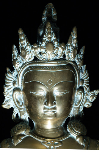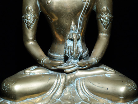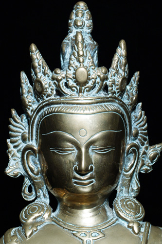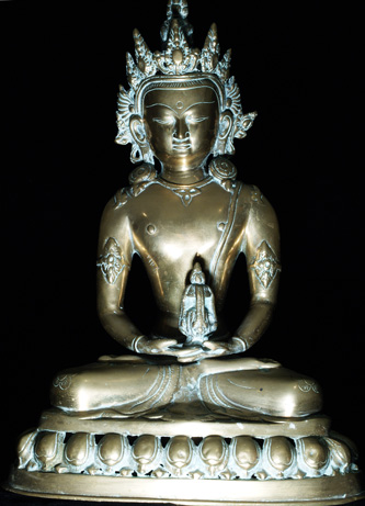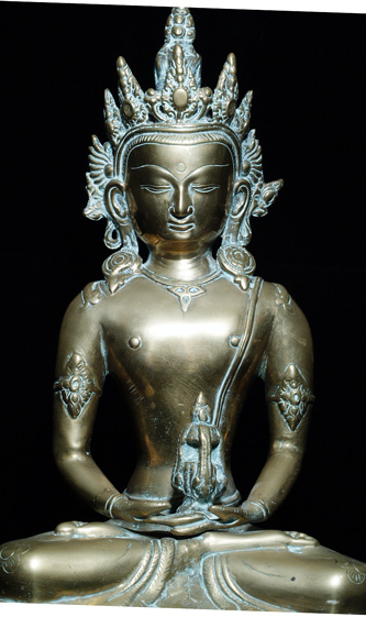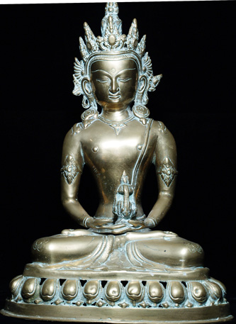 Very beautiful Amateyus, or Bodhisattva of long life, made of brass or bronze. Purchased in Mongolia just as it was opening to the west close to 15 years ago. Based on the wonderful smooth patina and associated wear, I would guess that it is close to 100 years old. It is a quality piece made for devotional purposes. The size is quite large at 15.5 inches tall by 10.5 inches wide at the knees. It is very hard to find an authentic antique Mongolian piece of this size and quality which is not extraordinarily expensive. This one is quite inexpensive for what it is.