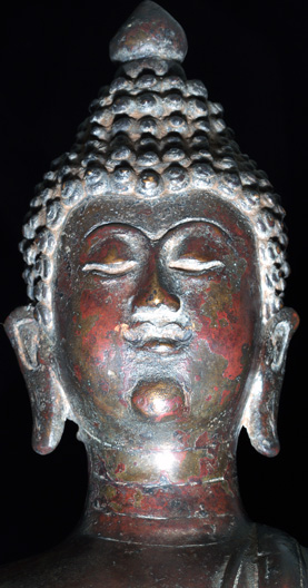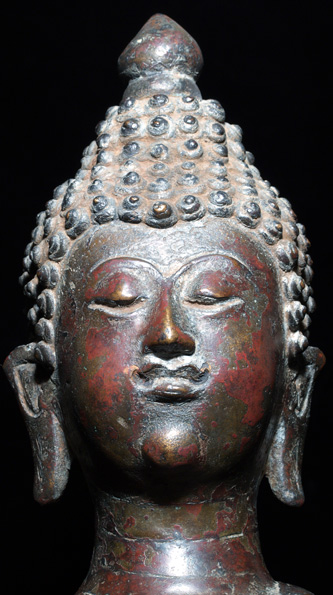 Wonderful, very large Northern Thai Buddha from the old kingdom of Nan. Very distinctive small, sweet face. The casting is provincial, and the style is folk- the overall effect is quite successful. He sits an impressive 18.25 inches tall by 10 inches wide at the base. The age is hard to nail down precisely. He is a 16/17th century provincial piece. He is extremely uncommon, and has an extraordinary presence. If he were slightly more of a classic piece, his price would be at least double. Who couldn’t love a face like that?