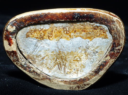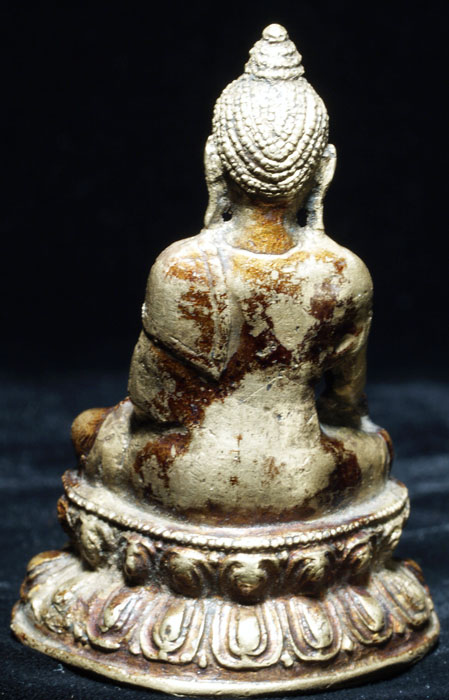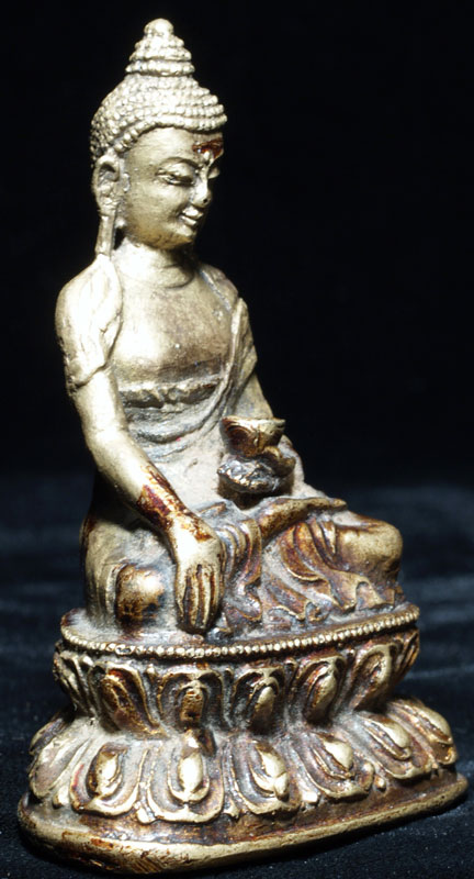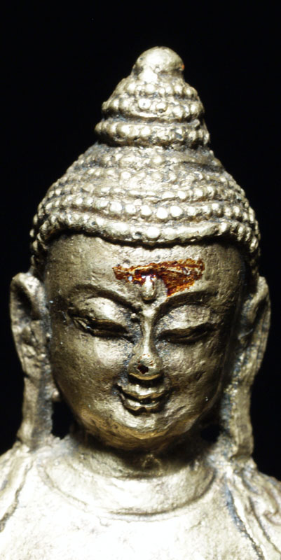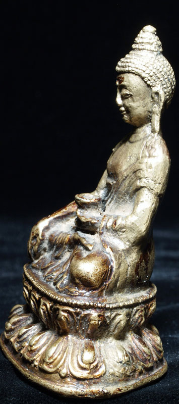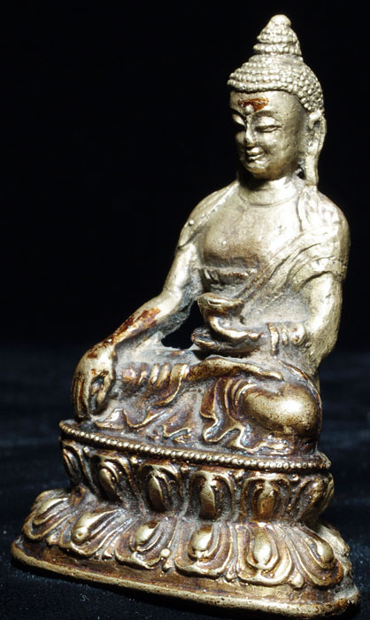 This is an uncommon and very beautiful bronze Buddha Tibetan or Mongolia. It has something special about it which is hard to describe. I say that it is possibly from Mongolia due to the distinctive lacquer, uncommon alloy and casting technique which I have seen on other Buddhas which were identified as being from Mongolia. The entire piece was originally covered with lacquer. The base still has its original seal. Sits 2.75 inches tall. Spot on nose is original to casting. I've given a dating of 17th/18thC- the style if the base suggests a possibly earlier dating.