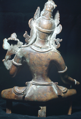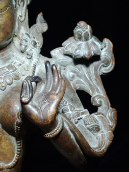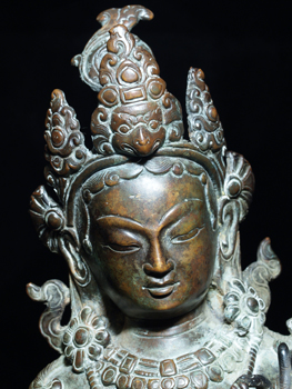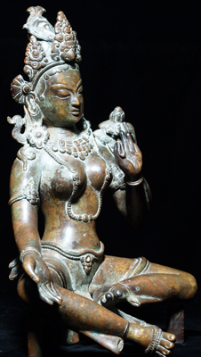Fantastic early 20th century Nepalese Tara- exquisite casting- looks to be almost pure bronze. Superb, with a palpable presence. Very substantial at 9.25 inches tall by 6.5 inches wide. With her original elaborate separately case base (which the 3 plinths on the bottom would have plugged into) she would have sat roughly 13 inches tall. She weighs an impressive 8+ pounds. Very uncommon in this quality.