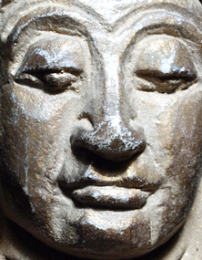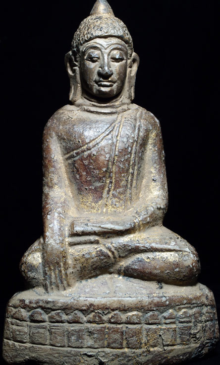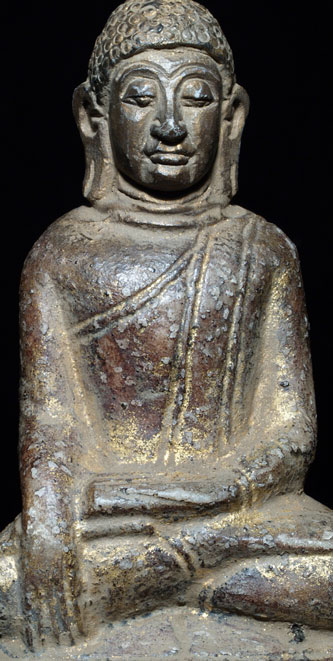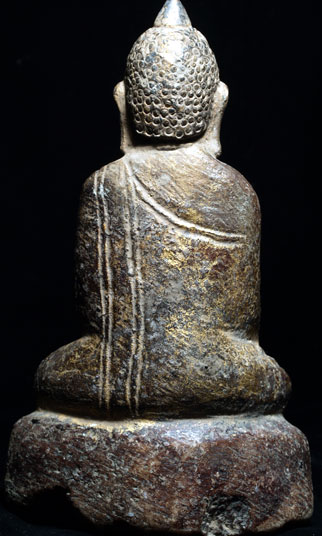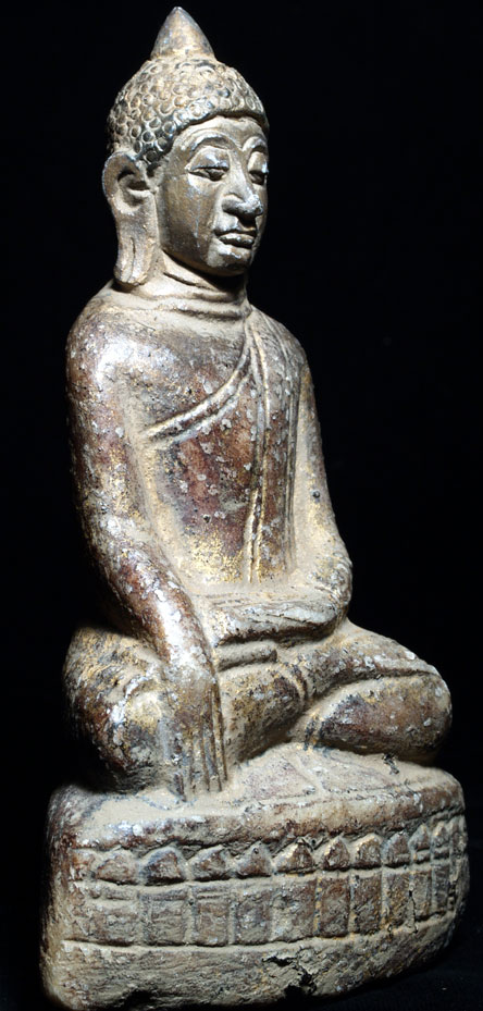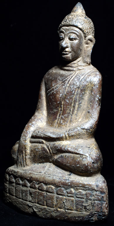 Fantastic 17/18thC Northern Thai Stone Buddha. He is the best patina of any stone sculpture I have owned- it is one of the rare times there is almost no doubt of his authenticity- his lacquer and gilding are original, as is the associated natural wear. The carving is very good- the face is expressive, and the overall composition is successful. He sits close to 6 inches tall. I’ve seen many SE Asian stone Buddhas, but I have never seen another of his type. Very strong spiritual feeling