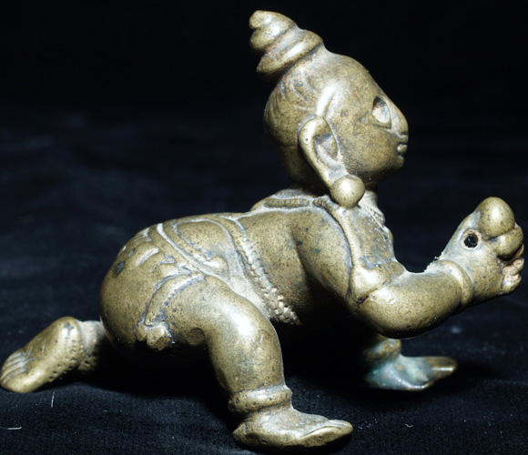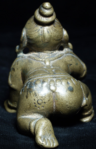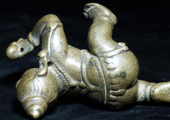 Animated baby Shiva and his butterball. Obviously originally had inlaid eyes- his saucer shaped gaze is mesmerizing. Very good quality, and very old. I’m estimating 18thC because I’m fairly certain he is that old, but I have a sense he may be older. Sits 2 ½ inches tall by 2.5 inches long.