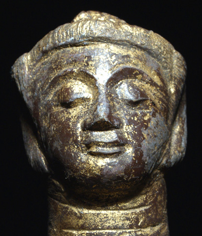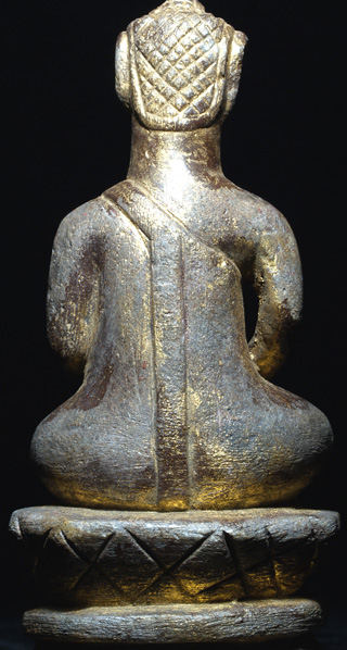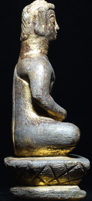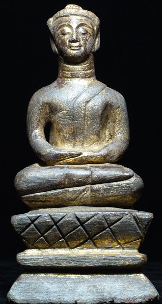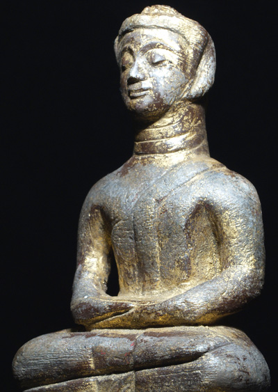 Delightful folk style Thai Buddha made of stone. Hard to date with certainty, but almost certainly no later than 17/18th century. Fortunately he retains most of his original patina, with lacquer and gilding, which is very rare for ancient stone sculpture. Wonderful face on the small head- deep in meditation. Truly one of a kind. The previous owner, an expert and scholar in Thai sculpture, believed that this was from the far north of Thailand near the ancient kingdom of Fang- he believed it could be as early as 15th century. Wonderful! 6.25 inches tall.