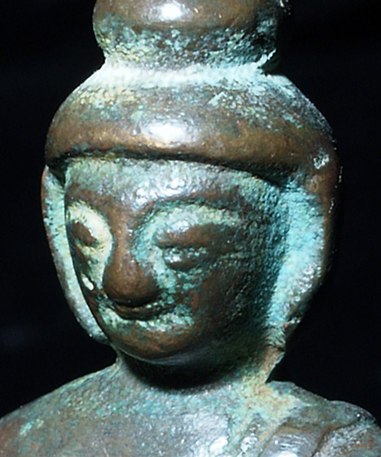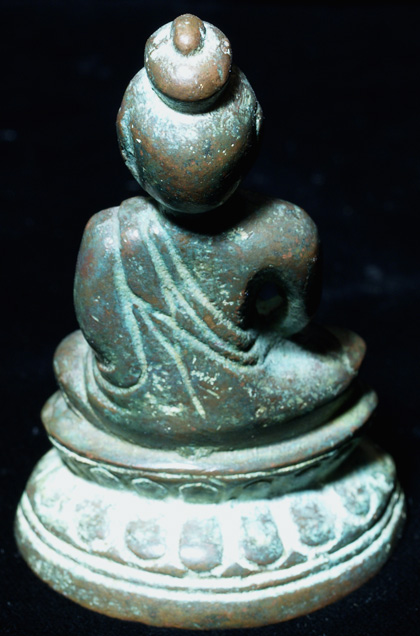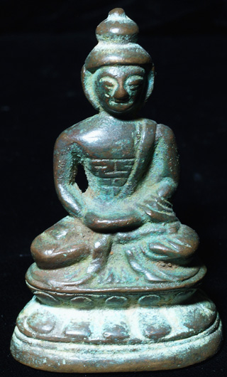 Unusual very old bronze Buddha- possibly from the far south of China (Yunnan), as it looks to have features of both Chinese and Laos style Buddhas. Appears to be at least 18th century, and possibly earlier. Very good energy to him. A great study piece. There and a quarter inches tall.