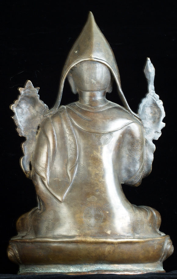 Tsongkapa- Excellent example of his type. He is a very good size at at 9.75 inches tall by over 6 inches wide, and has a great untouched original patina. He sits 9.75 inches tall. Out of an old estate.