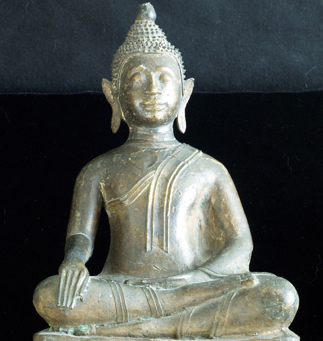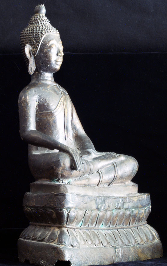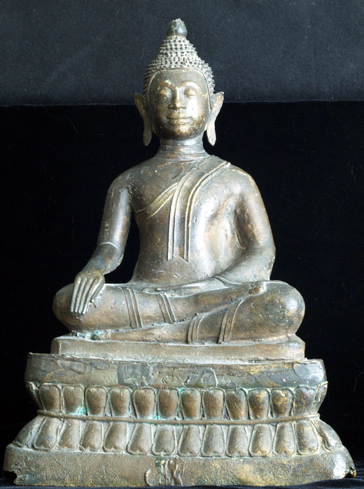 Very nice 18th century Thai or Laos Buddha. This Buddha is sculpted in a late Ayuthaya style, but is cast in an alloy, and with a method more typical of Laos. It is very heavy, and is a good size at 11 inches tall. The face exudes a feeling of joy and equanimity. Some casting flaws typical to this style of casting. Real presence to this one.
