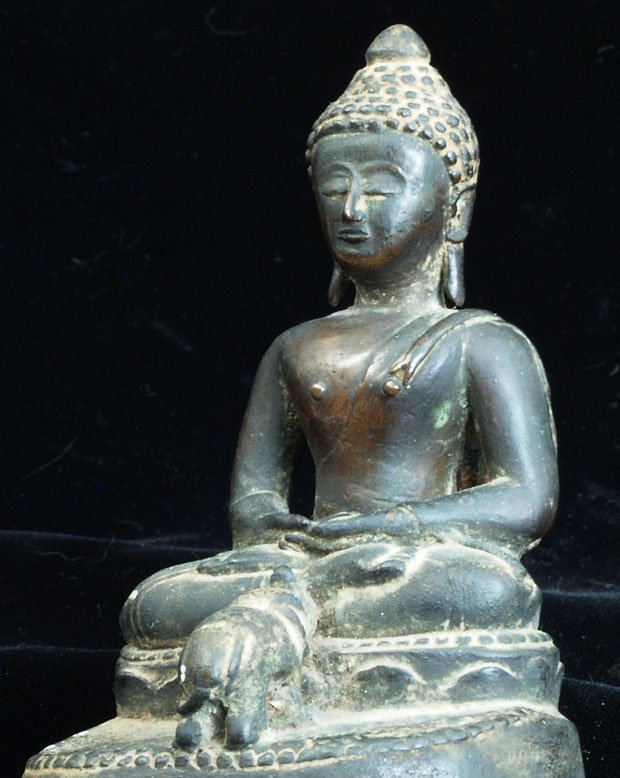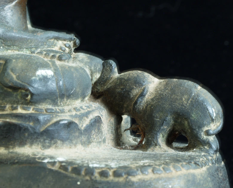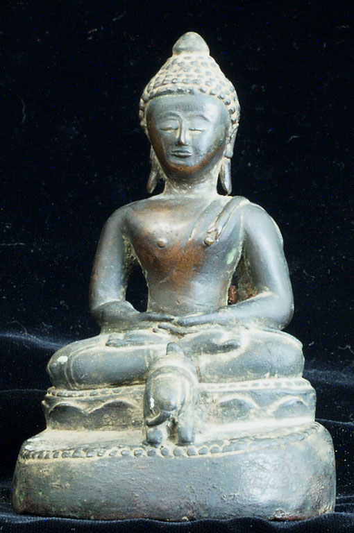 Very special and rare Early Northern Thai Buddha with an elephant at his feet. I've never seen a Buddha of this type with an elephant like this. There is a special form of the Buddha sitting in the "European" position from the 18 and 19th centuries with an elephant and monkey at his feet, but a traditional early Lanna Buddha with a single elephant in devotion is unique. The Buddha is in a very early (and most desirable) style, with a round head with small child-like features on a stout body with a short