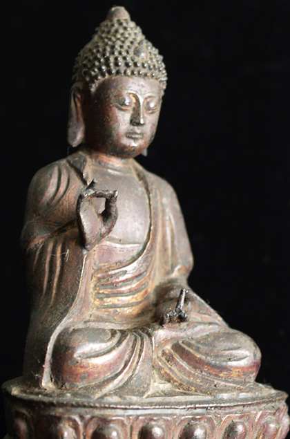 Beautiful Chinese bronze Buddha. Thinly cast- beautiful face,hands, mudra.Traces of original gilding. Close to 8 inches tall by 6 inches wide.