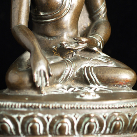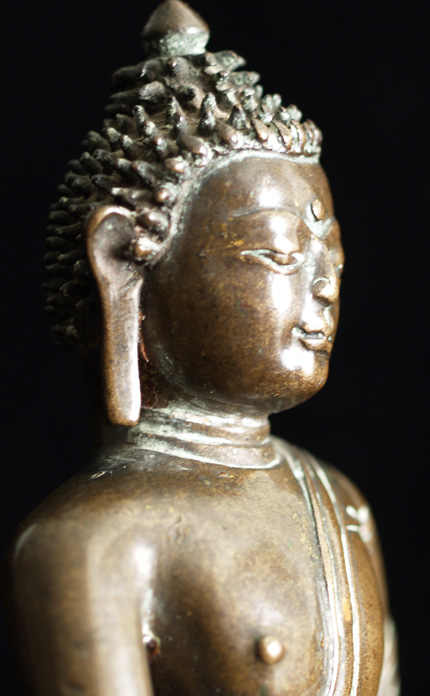 Wonderful example of its type. Base still has original bottom. Six inches tall by close to 4 inches wide. Note the finesse in the details, such as hands, robes, face. Superb patina. Very special.