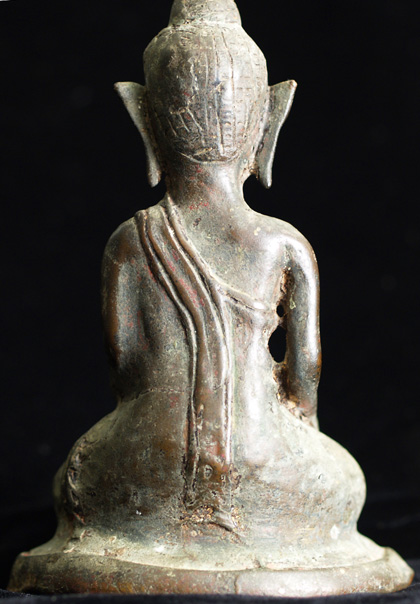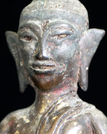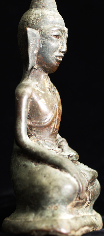 Delightful and very uncommon tribal style Buddha with influence from Thailand, Laos, and Burma. Probably from Laos, he could actually also be from an ethnic minority group in Burma. With his bat ears, smooth head, large hands and feet, distinctive base, and deep chocolate brown patina, he is a bit different than any other Buddha I have seen (and I have seen 10’s of thousands, and rarely see something I have never see before!!). Sits a little under 5 inches tall by 3 inches wide by 1.75 inches deep.