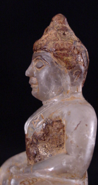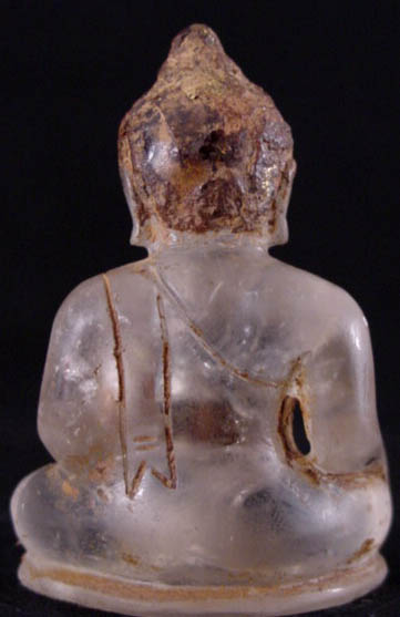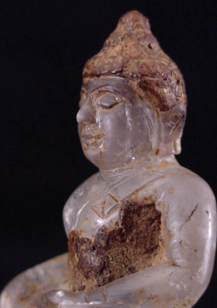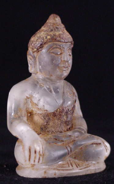 Delightful quartz crystal Buddha excavated in Chiang Sien in the 1960's. It was originally completely covered in the hard brown substance still covering parts of it. The owner thought the piece was pottery until the covering was accidently cracked, and the crystal was discovered underneath.
