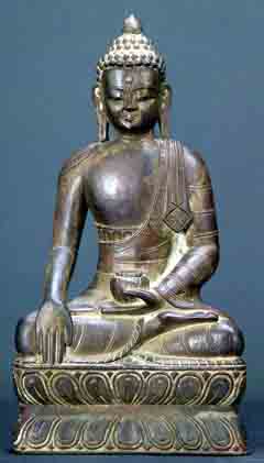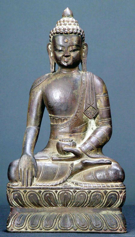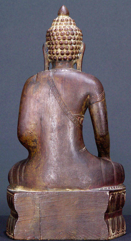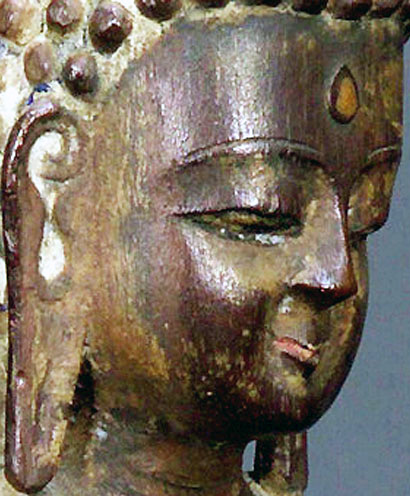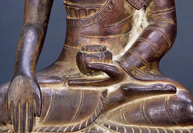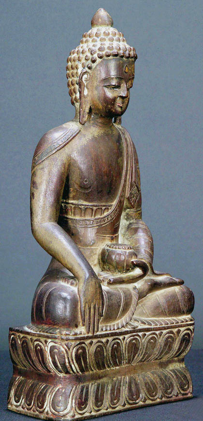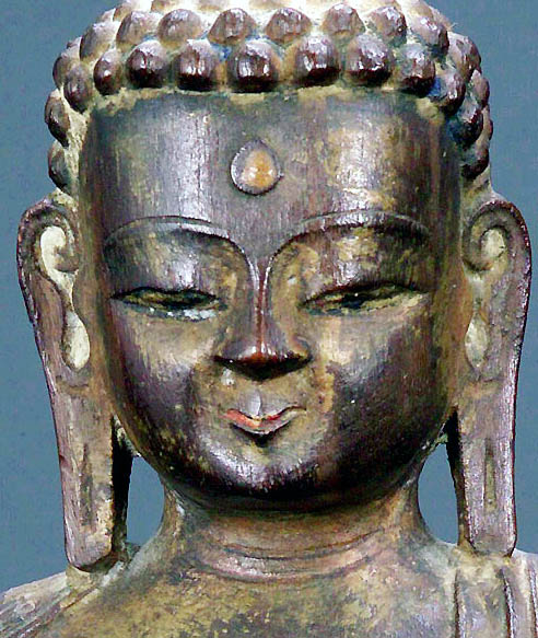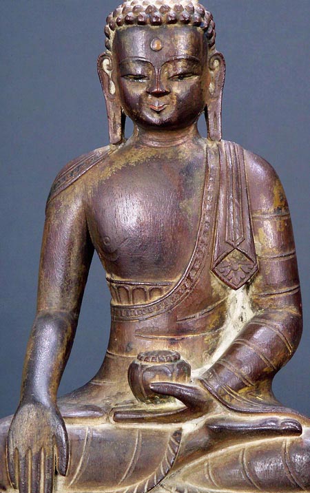 Beautiful Tibetan wooden Buddha traces of gesso and polychrome suggest that he was originally brightly colored, probably over the entire surface. He now has a beautiful brown patina. Fine carving, with great sensitivity. Large at 11 inches tall by close to 6 inches wide.
