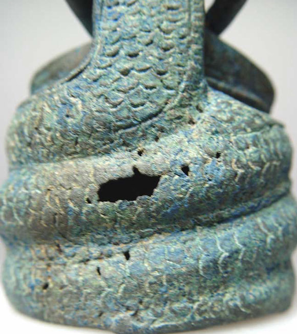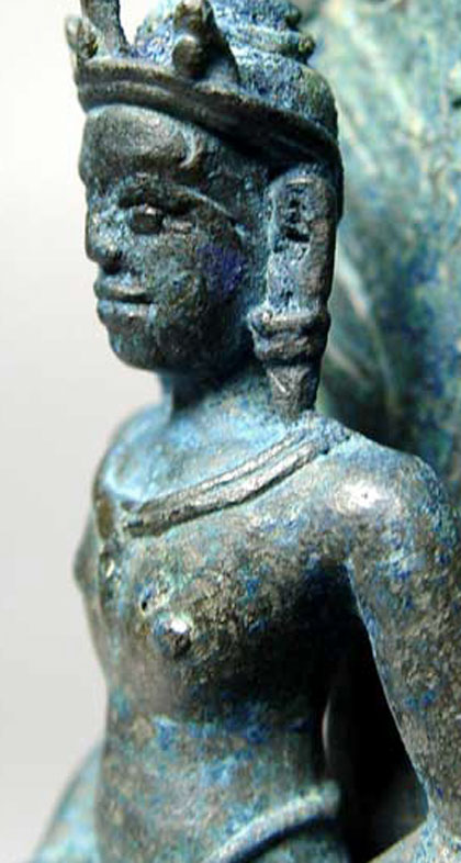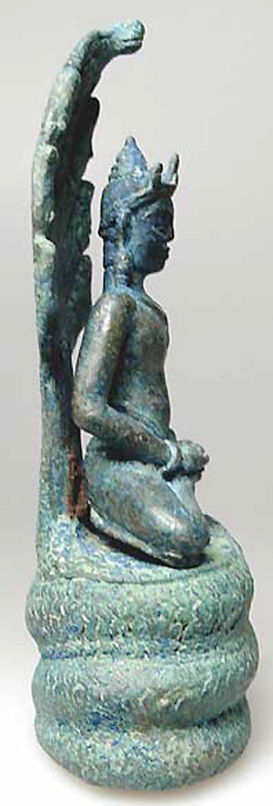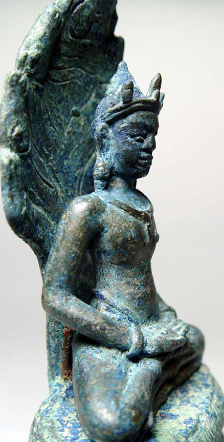 The incredible azurite blue patina sets off his intense gaze like that of few Buddhas. His animated hands invite, and his plump, blue Naga snake heads look over his head to protect.