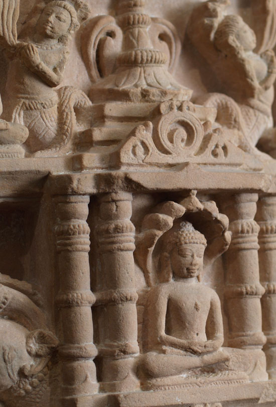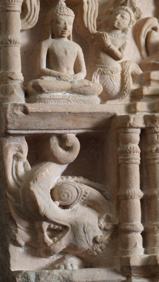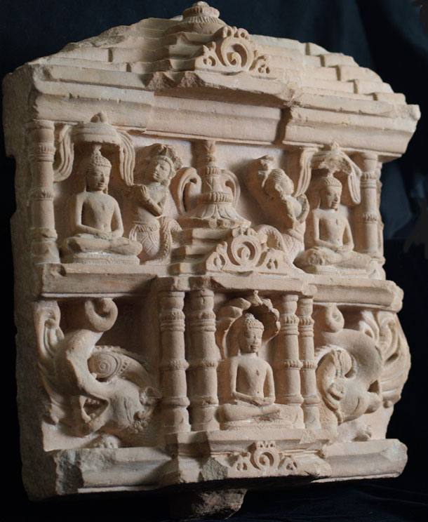 Jain masterpiece- as fine as you will see- 16 inches wide by 15 inches high by up to 4.5 inches deep not including the plinth on the bottom. Three seated deities. 2 celestial attendants, and 2 Makaras (mythical beasts), all in a beautiful stone temple. Wear commensurate with age. From a fine old Cleveland collection, purchased in London in the 1960's, although I do not have the paperwork anymore. The previous owner also had it looked at by staff at the Cleveland Museum of Art, which is famous for their Asian collection- they reportedly authenticated and admired it. I’ve looked for comparables, but even in the high end auction catalogues I can’t find one as good as this. The range on prices for related pieces is wide- I will price this in the middle of the pack for auction estimates for 5 years ago, even though this piece is at the very top.