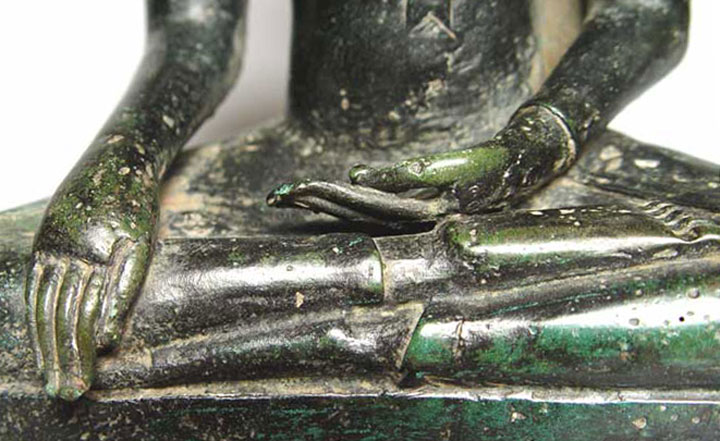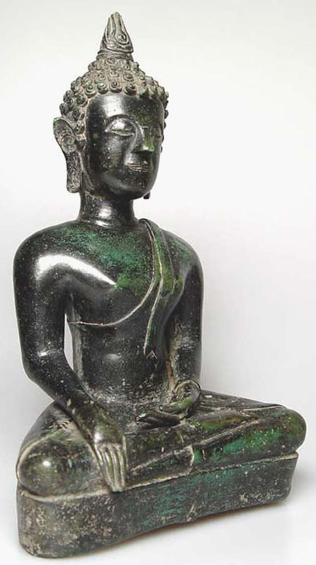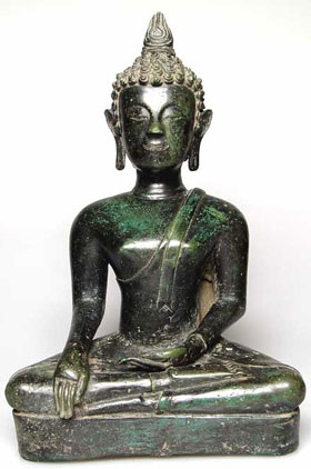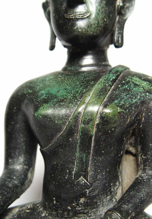 The finest of his type- a very early Chiang Sen Lao Buddha with the best brilliant "jade green" patina you will ever see. From an old collection in which the collector focused on early Khmer, Lao, and Thai pieces with intense blue and green patinas. Aside from the patina, he has a special delicacy and sensitivity in his features which elevates him far above his peers. He is a very good size at 8.25 inches tall by well over 5 inches wide at the knees. This is a very high class Buddha, and is a type of Buddha