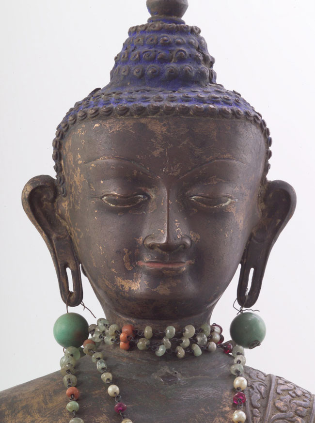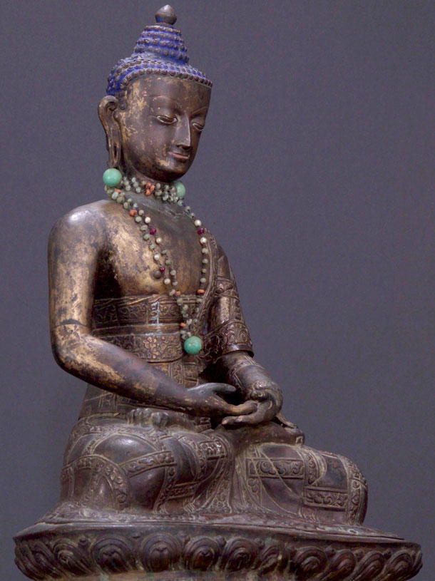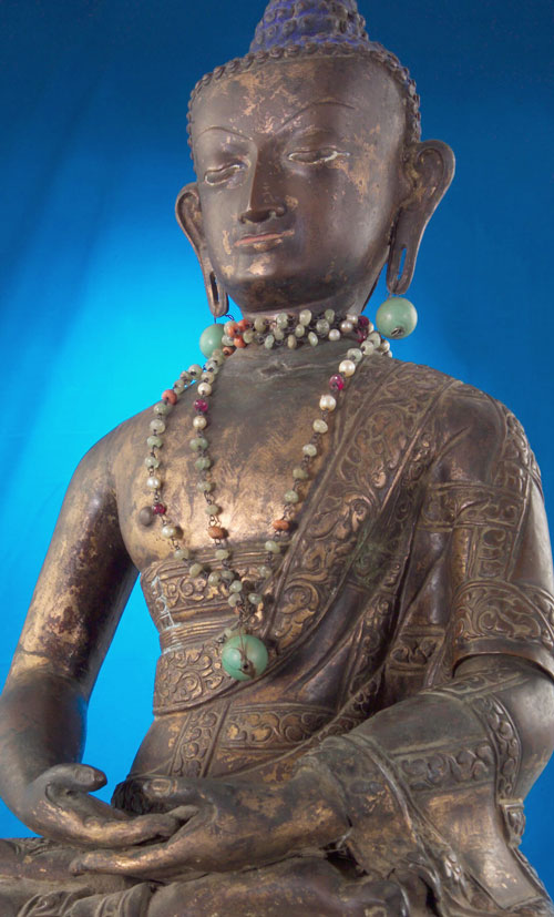 Remarkable and very large 15/16th century copper repousse Tibetan Buddha with much of its original gilding, and very old beads and earrings which have been with him for a very long time (they have etched a lovely pattern in the gilding on his chest over time). Truly museum quality, one of the best I have ever had. Sits between 18 and 19 inches tall by close to 13 inches wide at the knees. The photos tell the story. He is not inexpensive, but my price will be less than half of what you would pay in a reputable brick and mortar shop if you could ever find a comparable one.