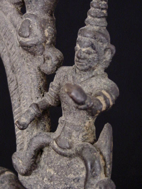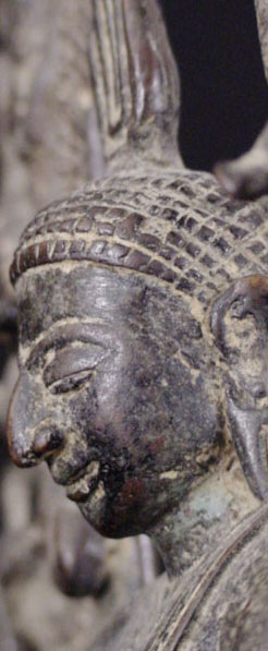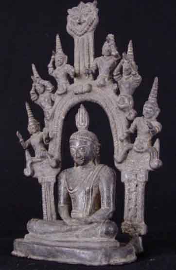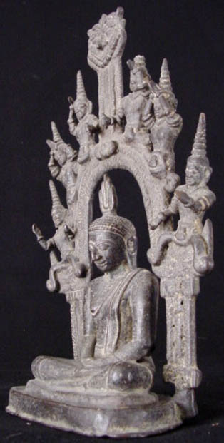 One of my most special pieces: I originally bought this as being from Sri Lanka, but something was different than any Lankan Buddha I had seen. After doing some reseach and showing it to a few knowledgable people I have come to believe that is a Burmese emulation of a Sri Lankan Buddha made during the Post Pagan Era in Arakan. The figures on the mandorla appear to be Burmese spirits or Nats. The construction is consistent with early Burmese pieces. Apparently, many Lankan Buddhist teachers and artisans came to Burma during that time, as Sri Lanka was the center of Theravadan Buddhism. I have seen (and own) a few very small Lanka" style Burmese Buddhas from that time