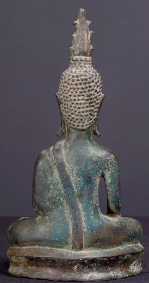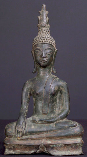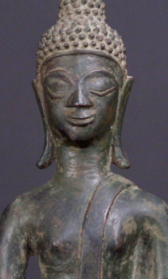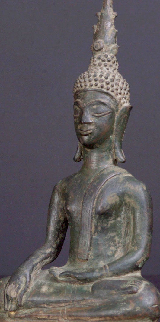 Lovely Loas or Northern Thai bronze Buddha of very good quality. Exceptional jade green patina. This type of patina is considered the most desirable of all. 7" tall.