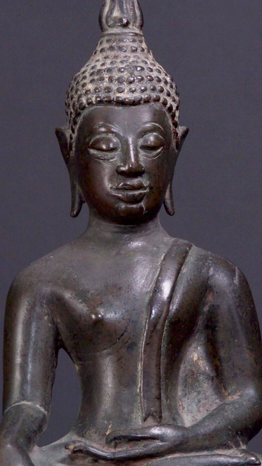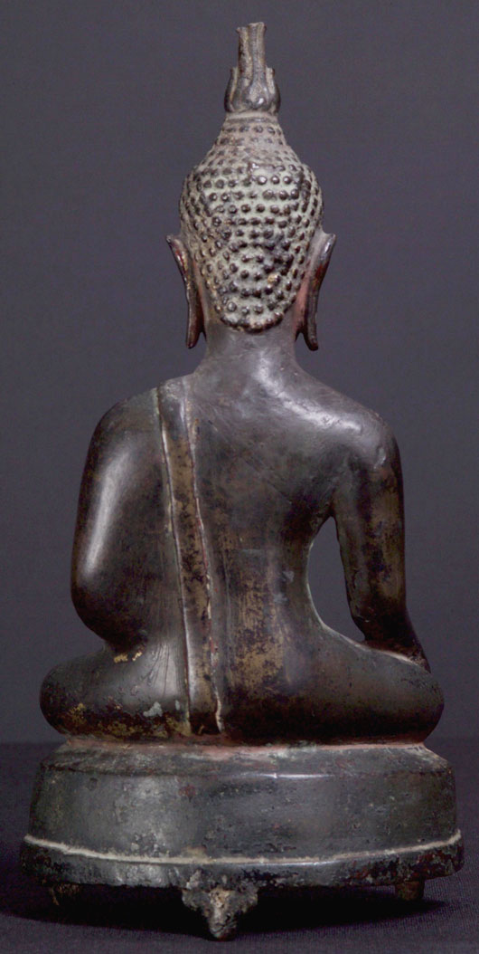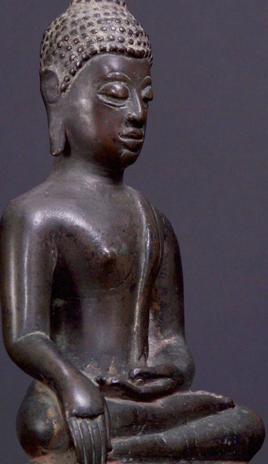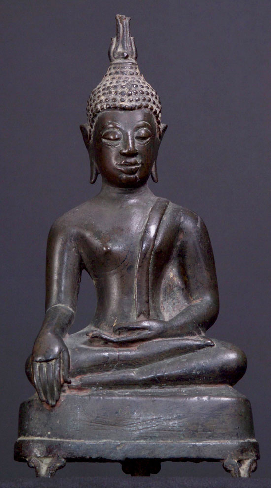 Exceptional Northern Thai Buddha. Very fine sculpting and casting. The face exudes a serene, deep calm. An uncommon feature of this piece is the three small legs on the base. This is one of the best pieces of its type you will find. 8.5" tall.
